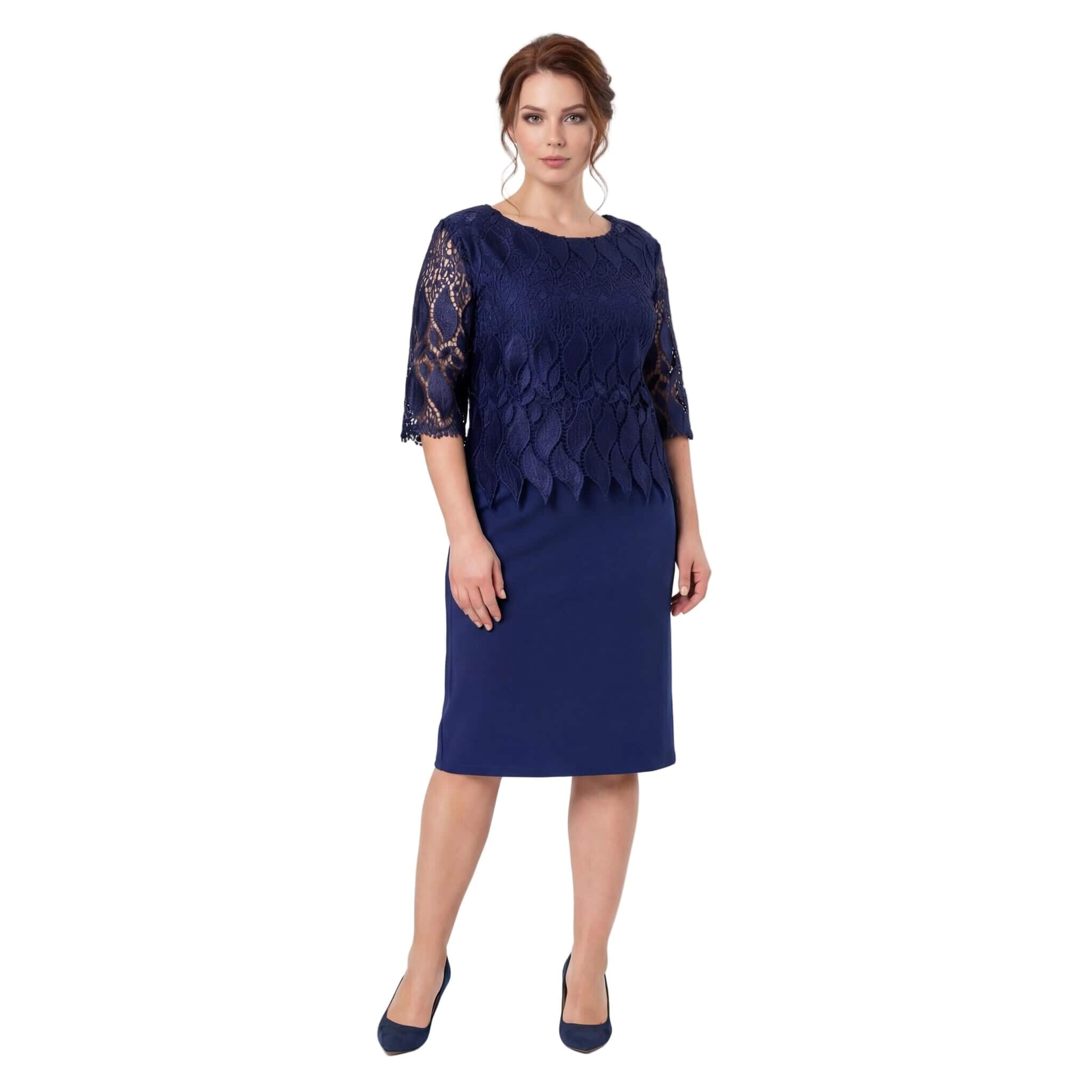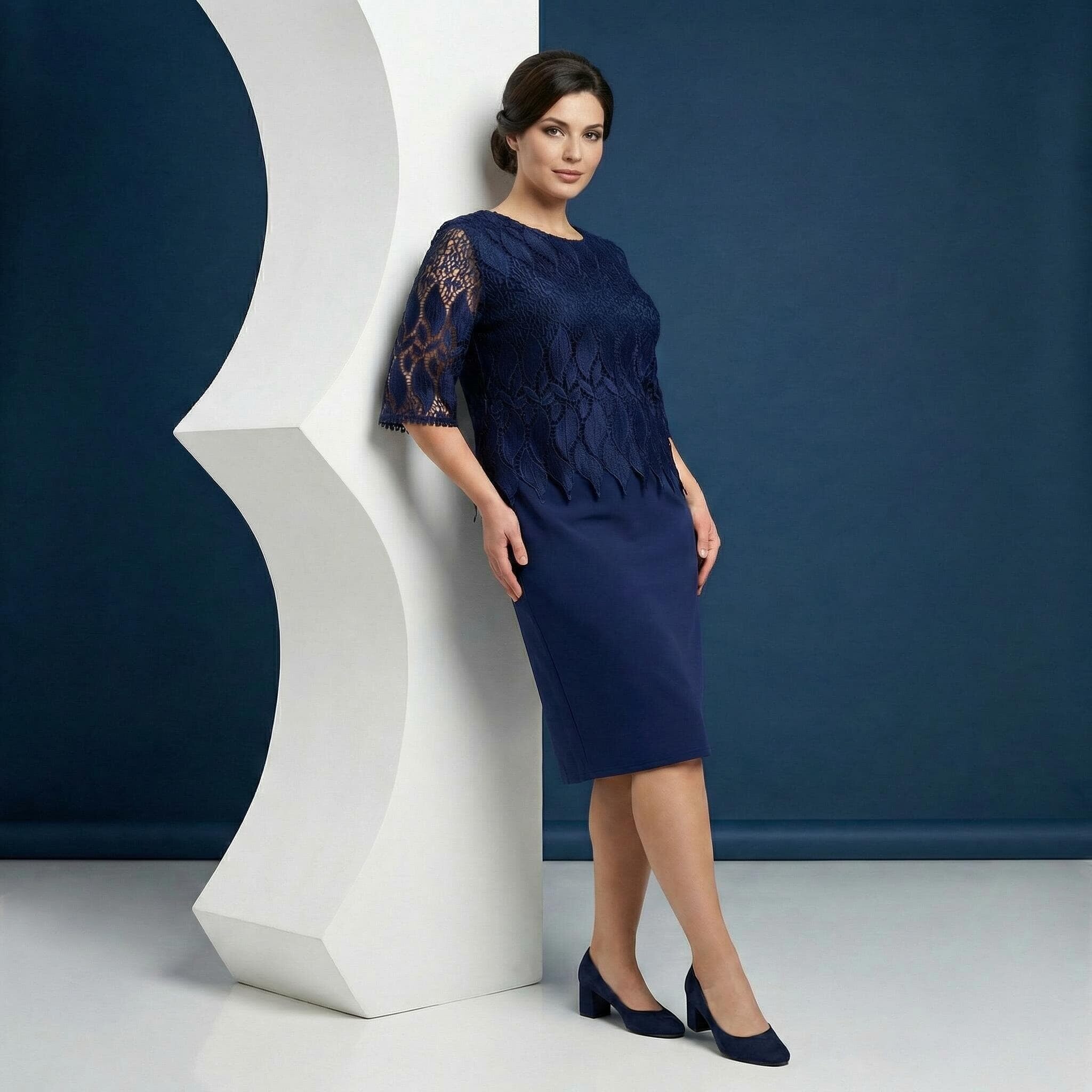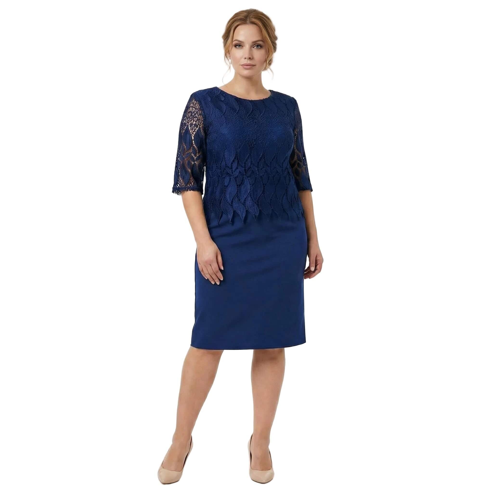 Открийте безупречен стил и комфорт с тази елегантна официална макси рокля в наситен тъмносин цвят. Моделът е създаден специално за дами, които ценят изискаността, съчетавайки класически прав силует с модерни детайли. Горната част е изработена от фина дантела с едри флорални мотиви и красив назъбен подгъв, който се наслоява нежно върху основната материя. Прозрачните ръкави до лакътя добавят усещане за лекота и въздушност. Долната част е от висококачествена, плътна материя с вискоза, която пада тежко и осигурява отлично движение, без да очертава. Тази рокля е идеалният избор за сватба, кръщене или официална вечеря през пролетно-летния сезон.