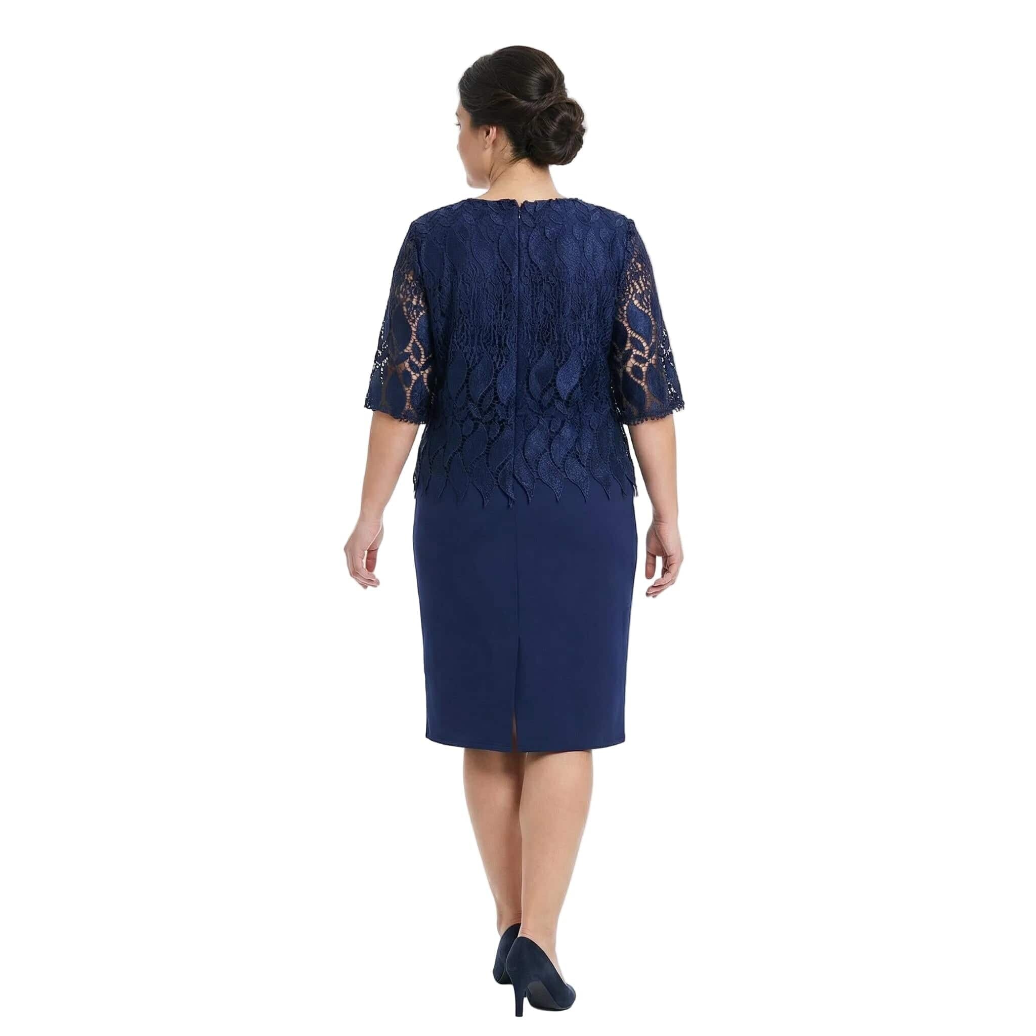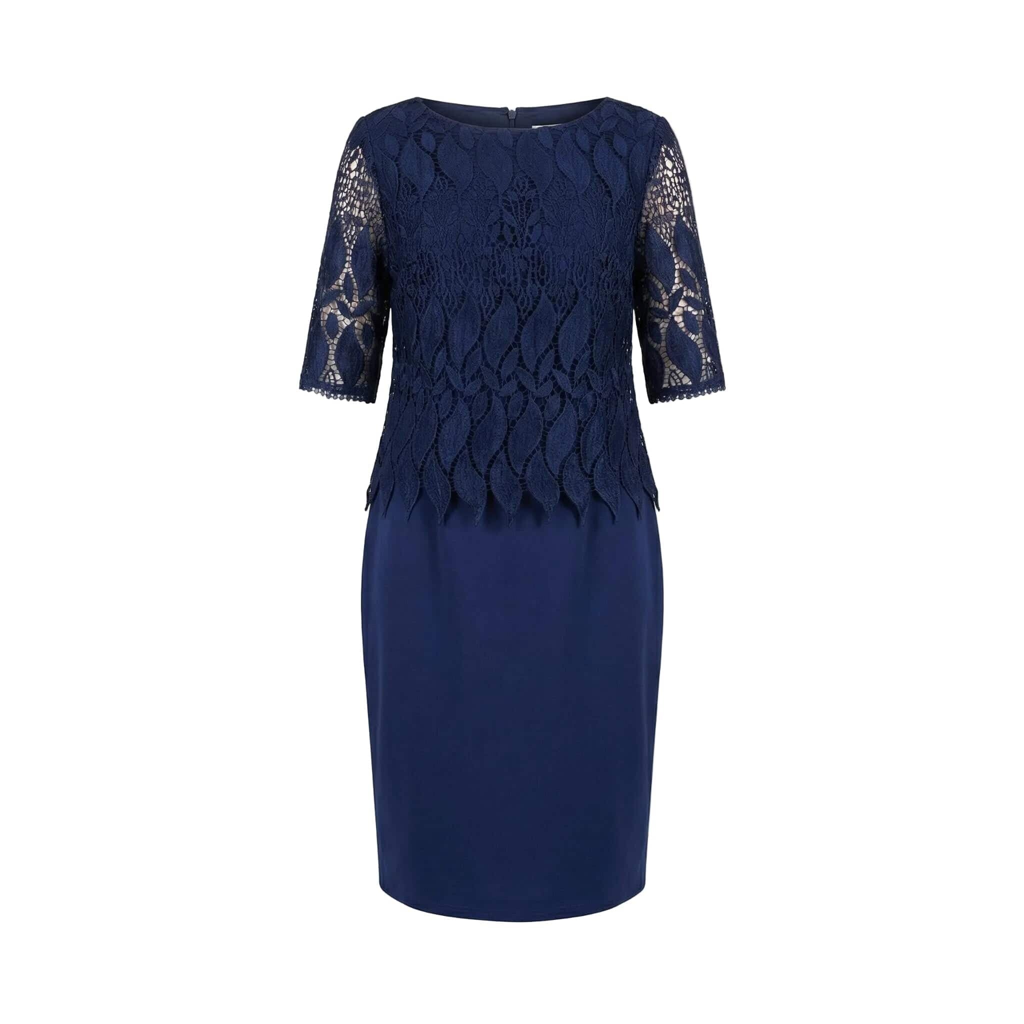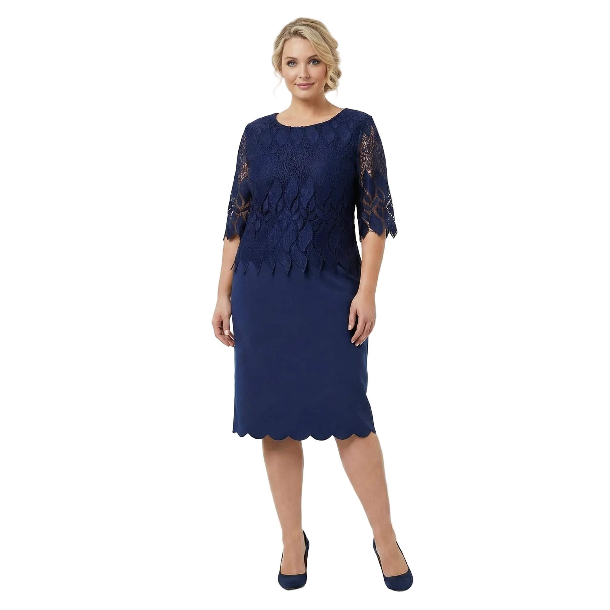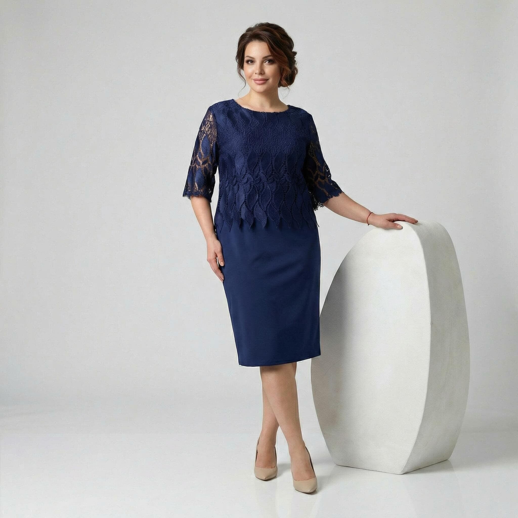 Открийте безупречен стил и комфорт с тази елегантна официална макси рокля в наситен тъмносин цвят. Моделът е създаден специално за дами, които ценят изискаността, съчетавайки класически прав силует с модерни детайли. Горната част е изработена от фина дантела с едри флорални мотиви и красив назъбен подгъв, който се наслоява нежно върху основната материя. Прозрачните ръкави до лакътя добавят усещане за лекота и въздушност. Долната част е от висококачествена, плътна материя с вискоза, която пада тежко и осигурява отлично движение, без да очертава. Тази рокля е идеалният избор за сватба, кръщене или официална вечеря през пролетно-летния сезон.