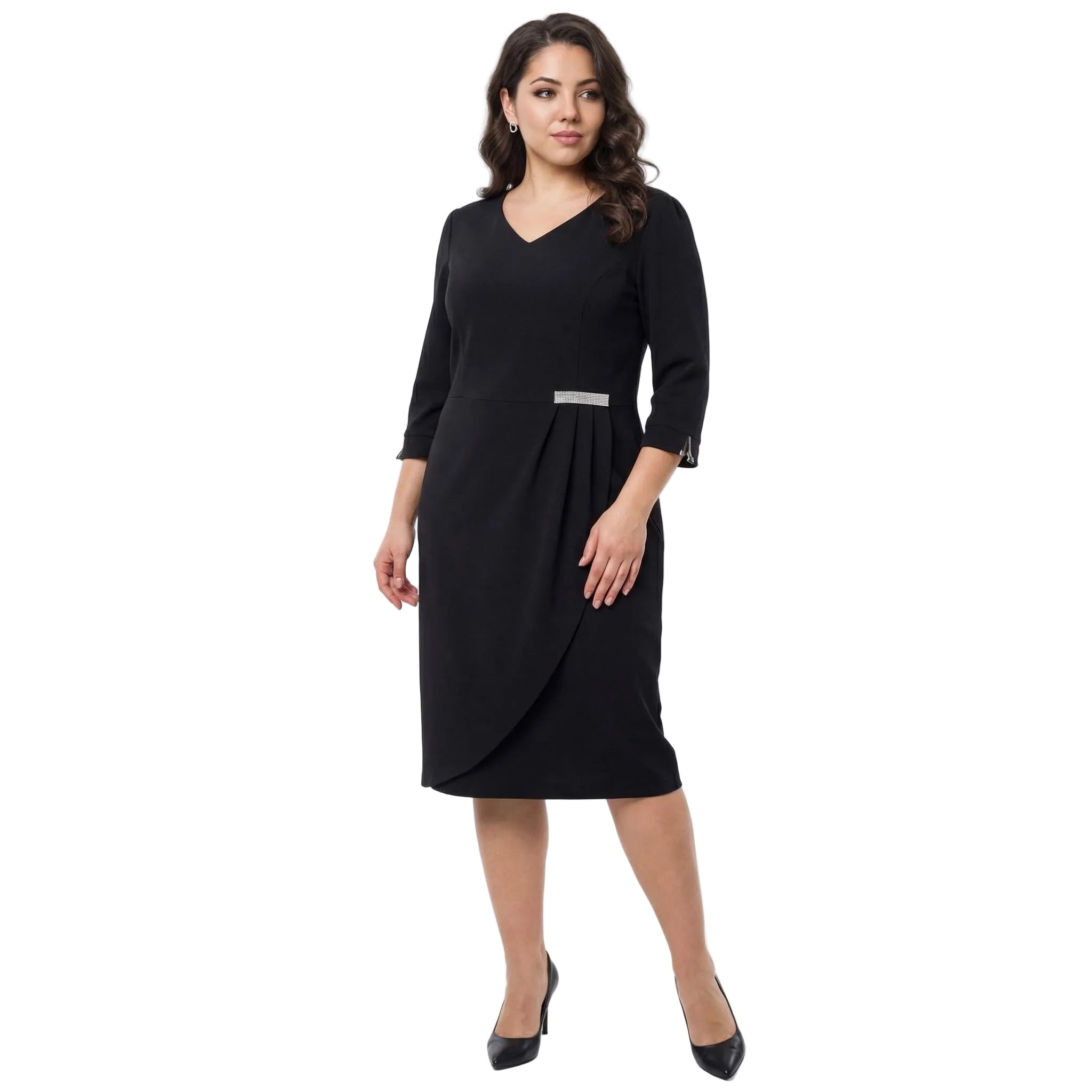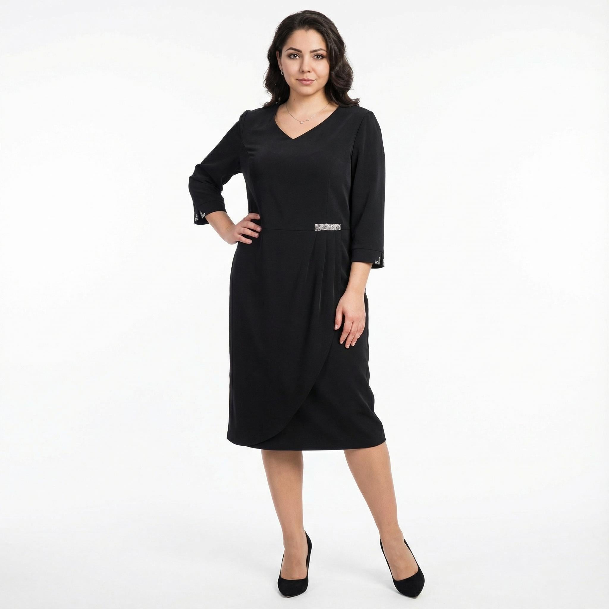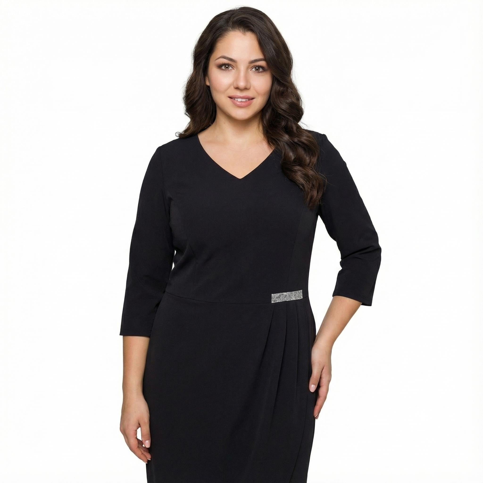 Стилна тъмносиня официална рокля с права кройка и V-образно деколте, което издължава силуета и подчертава бюста по елегантен начин. Изработена е от мека вискозна материя с еластан, която осигурява комфорт и леко еластично усещане през целия ден. Декоративните елементи в областта на бюста и ръкавите добавят изискан акцент. Дължината е под коляното, което прави модела подходящ за официални събития, празнични вечери и специални поводи през есенно-зимния сезон.