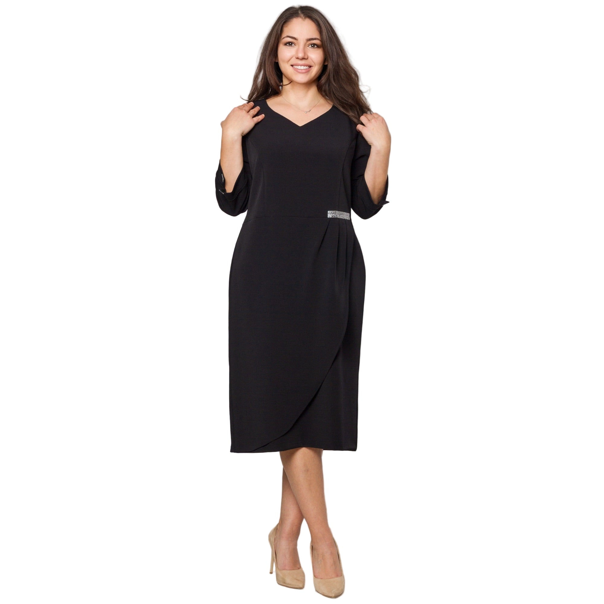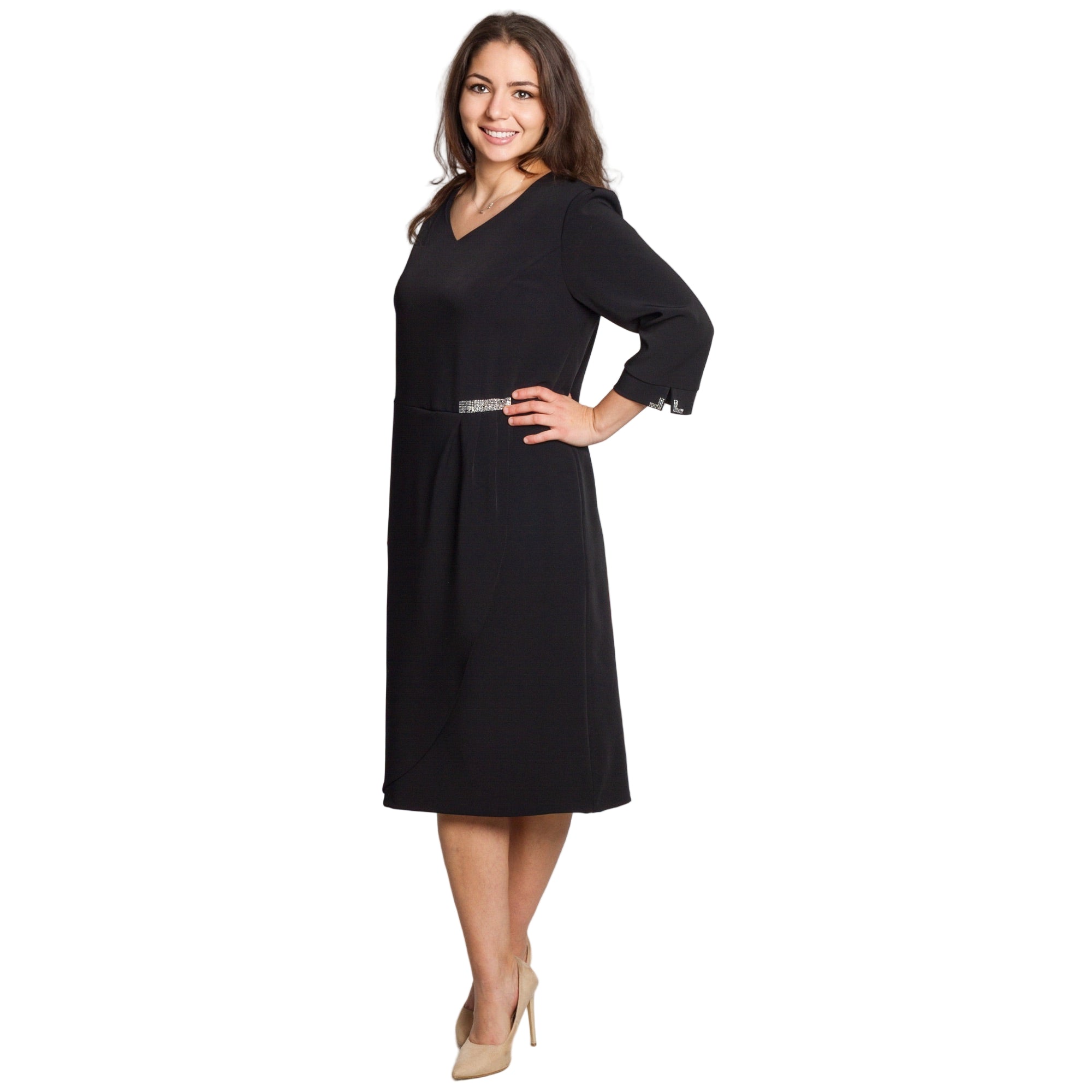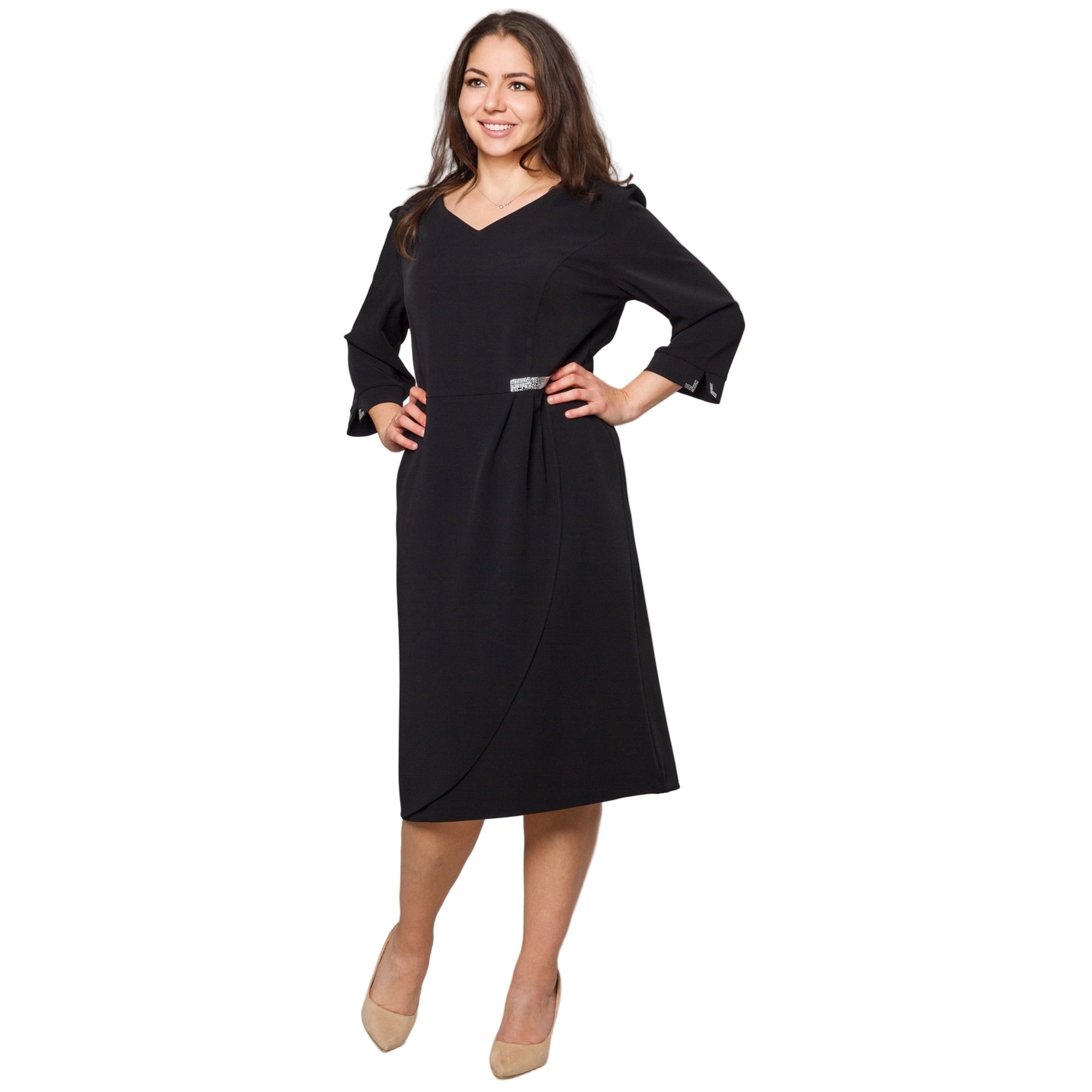 Стилна тъмносиня официална рокля с права кройка и V-образно деколте, което издължава силуета и подчертава бюста по елегантен начин. Изработена е от мека вискозна материя с еластан, която осигурява комфорт и леко еластично усещане през целия ден. Декоративните елементи в областта на бюста и ръкавите добавят изискан акцент. Дължината е под коляното, което прави модела подходящ за официални събития, празнични вечери и специални поводи през есенно-зимния сезон.