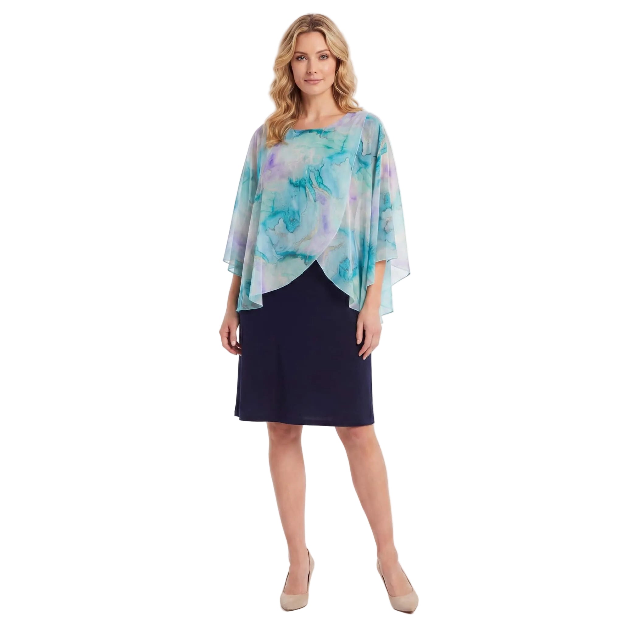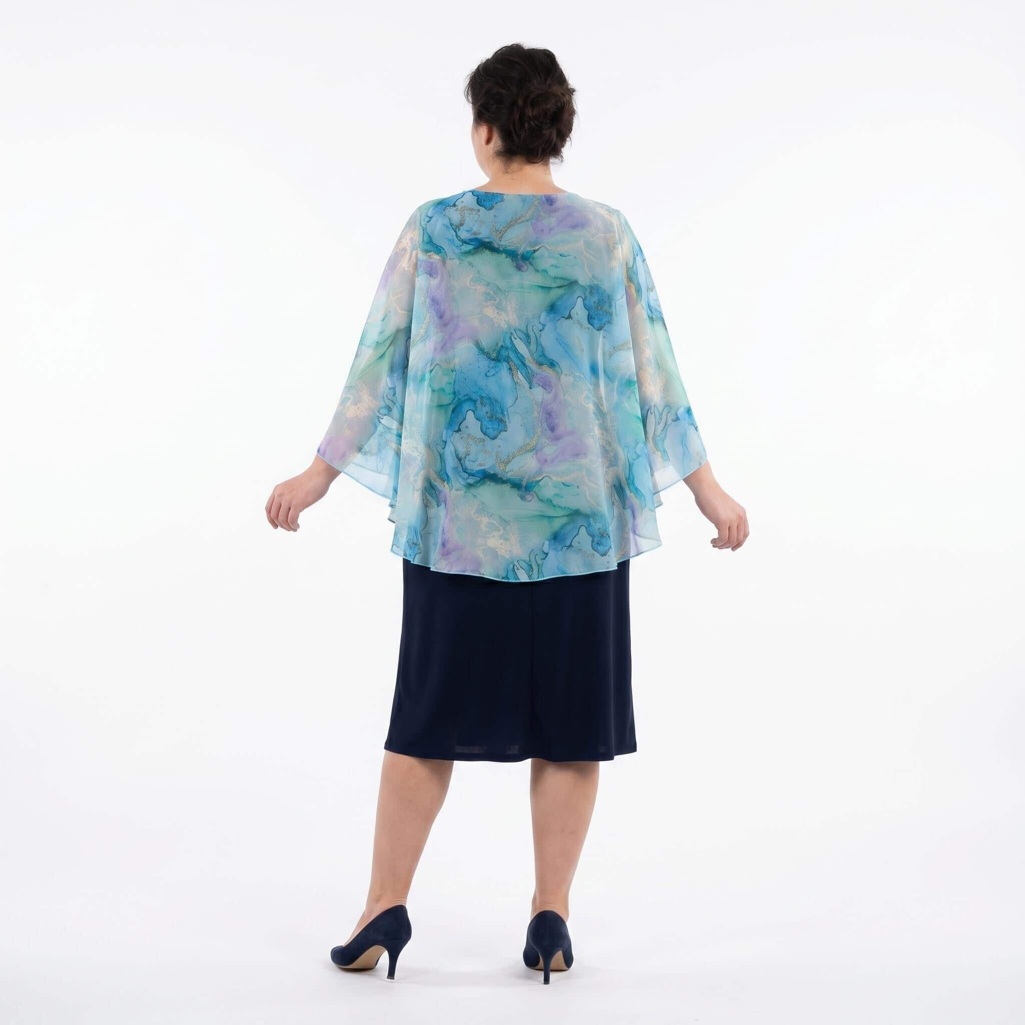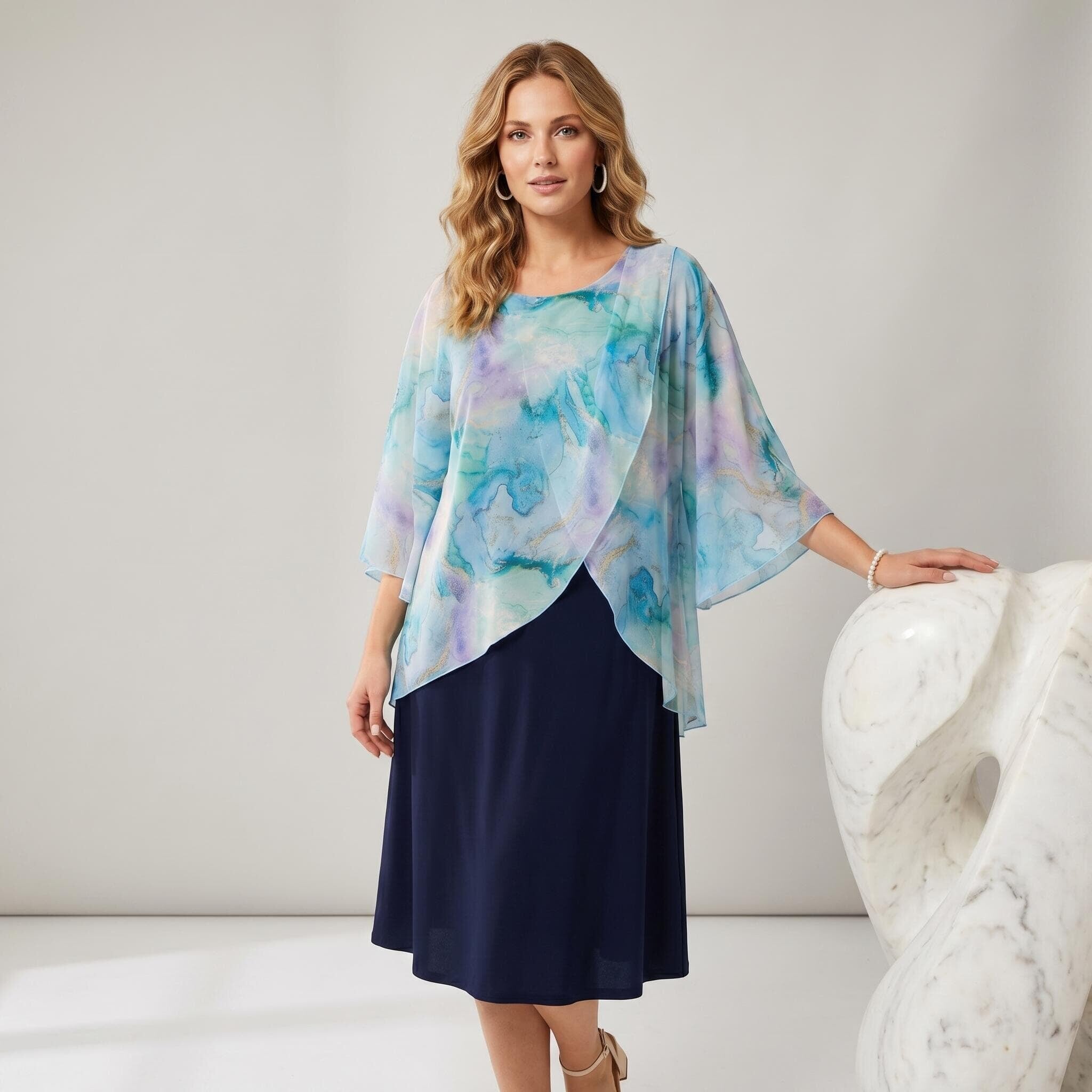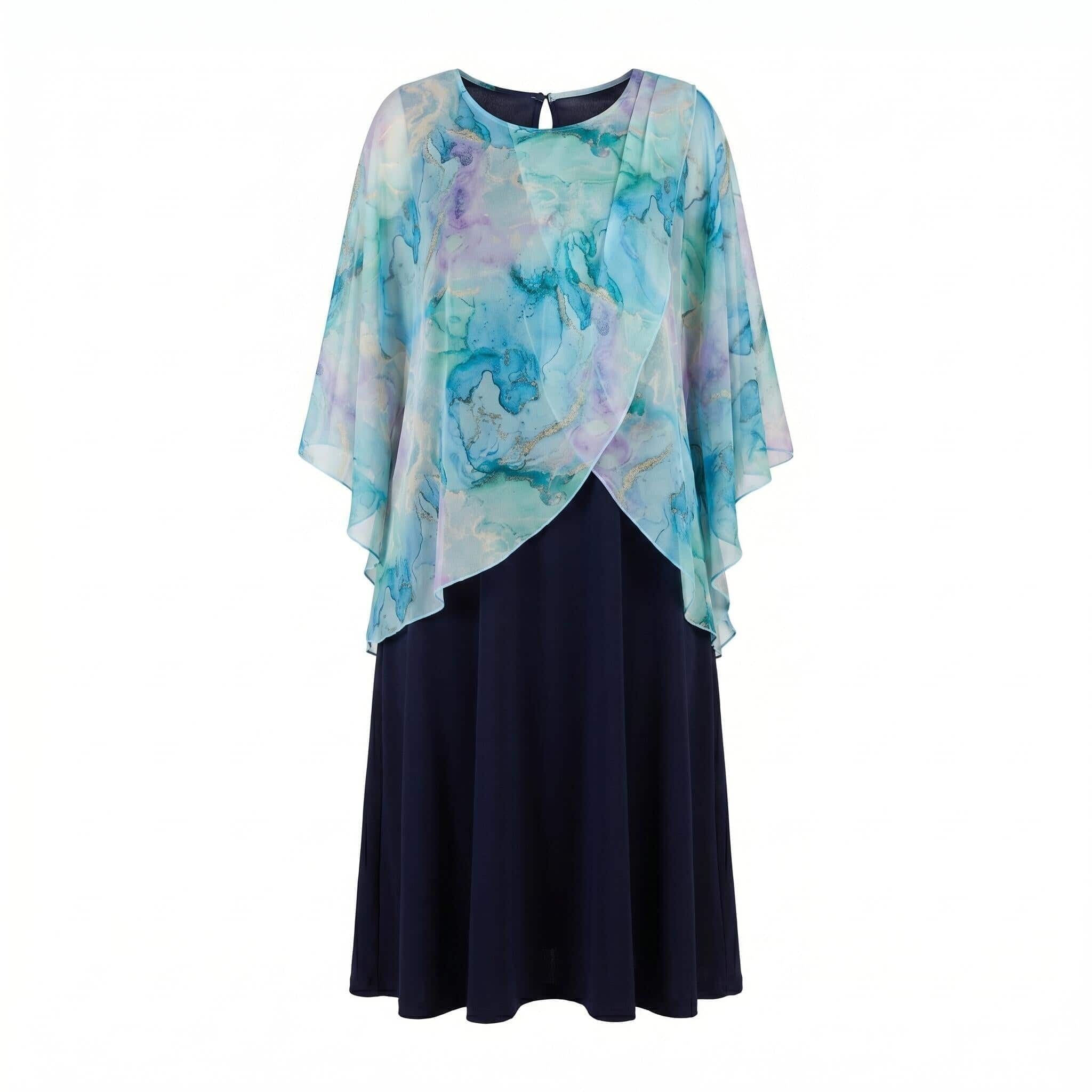 Представяме ви елегантна тъмносиня официална рокля големи размери, съчетаваща класически стил и модерен дизайн. Моделът е изработен от мека и еластична материя, която пада тежко и осигурява безупречен комфорт. Същинският акцент на тази красива рокля е асиметричното прозрачно шифонено наметало, украсено с нежен абстрактен акварелен принт в преливащи нюанси на светлосиньо, лилаво и зелено. Разкроената кройка и дължината под коляното подчертават женствеността и създават изключително грациозен силует. Тази стилна рокля без ръкави е идеалният избор за всяка дама, която иска да се чувства неотразима и уверена по време на сватба, кръщене, юбилей или друг официален повод през пролетно-летния сезон.