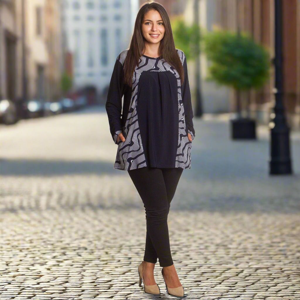 Елегантна туника в тъмносин цвят, декорирана с ефектни бели вълнообразни линии, които придават модерна и динамична визия. Изработена е от висококачествена вискоза с еластан, осигуряваща комфорт и мекота при носене. Свободната разкроена кройка и декоративните връзки в долната част подчертават женствеността и прикриват нежелани зони. Моделът е с кръгло деколте и дълги ръкави, подходящ както за ежедневието, така и за официални поводи през есенно-зимния сезон.