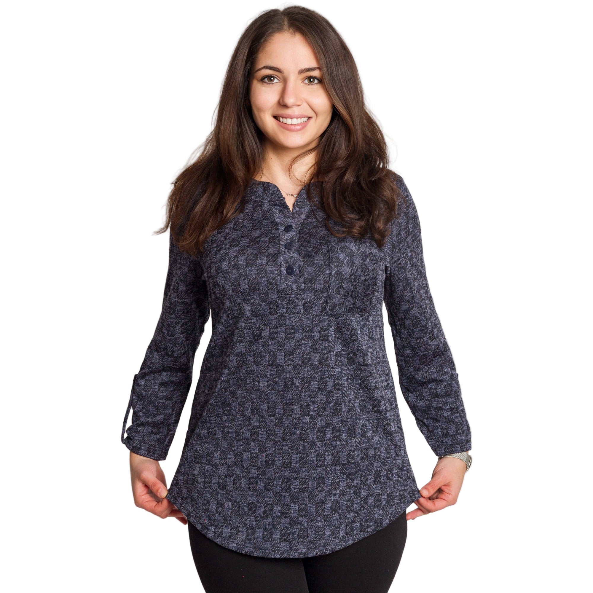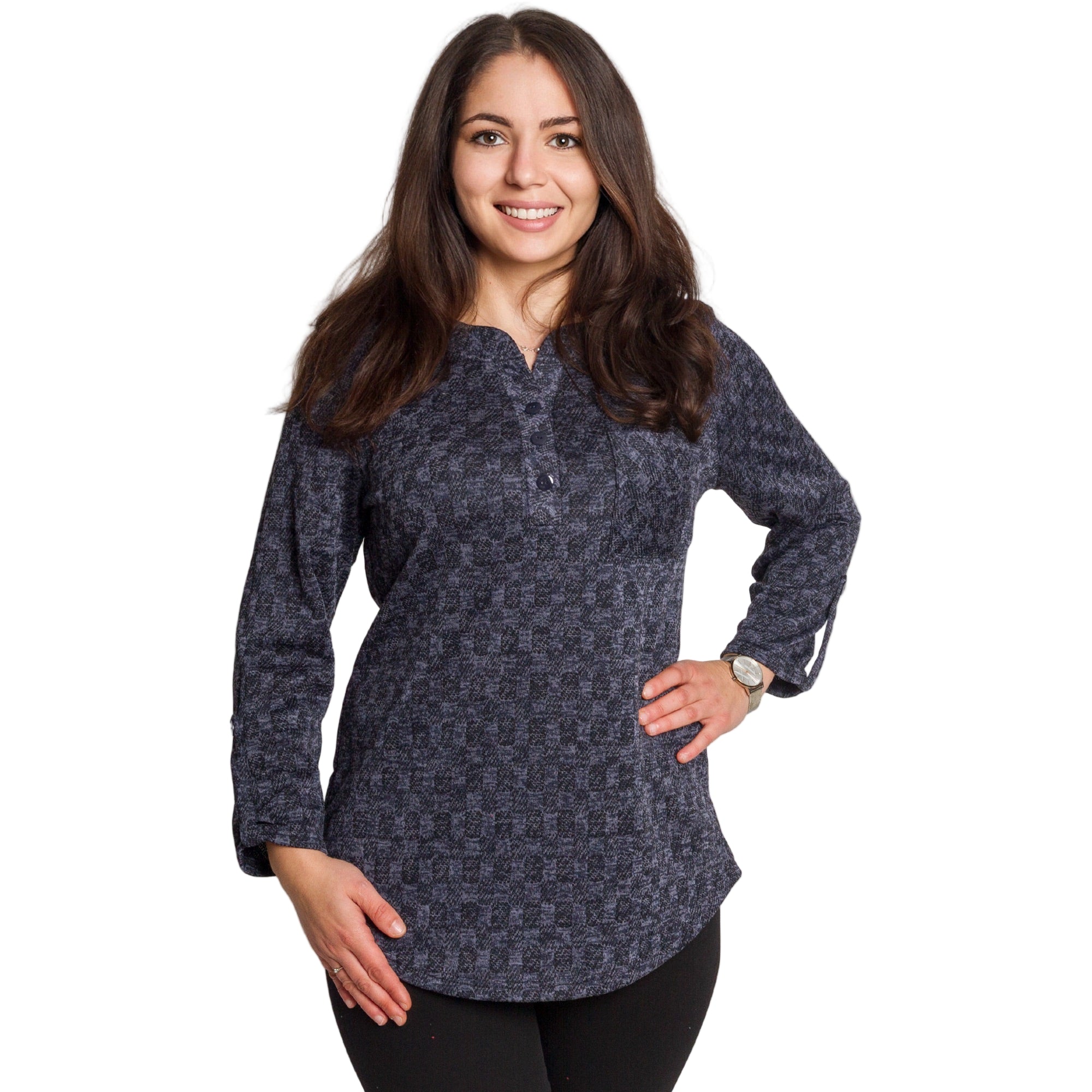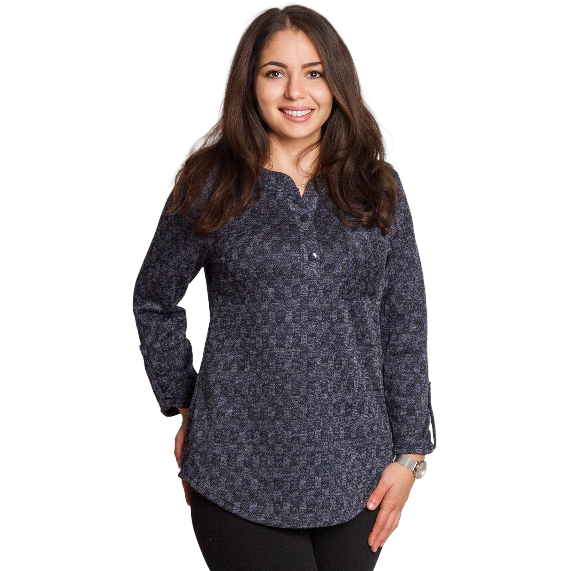Тази тъмносиня туника е създадена за комфорт и стил в ежедневието. Меката материя от 100% полиестер пада красиво по тялото, без да се впива и осигурява леко усещане през целия ден. Правата кройка е идеална за плюс сайз фигури – подчертава силуета без да ограничава движението. Облото деколте с копчета придава свеж и модерен акцент, а функционалният преден джоб добавя практичност и допълнителен детайл. Туниката е подходяща за есенно-зимния сезон и лесно се комбинира с дънки, клин или панталон за завършен и удобен ежедневен аутфит.