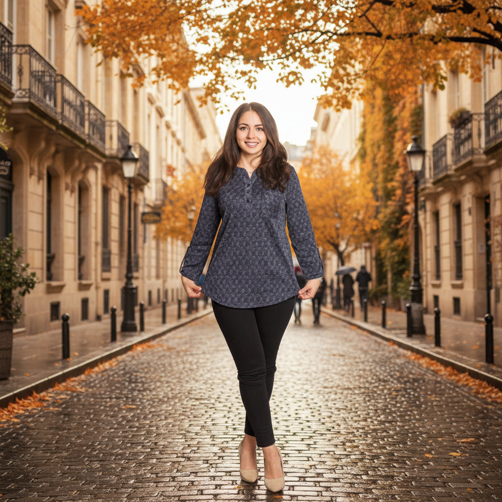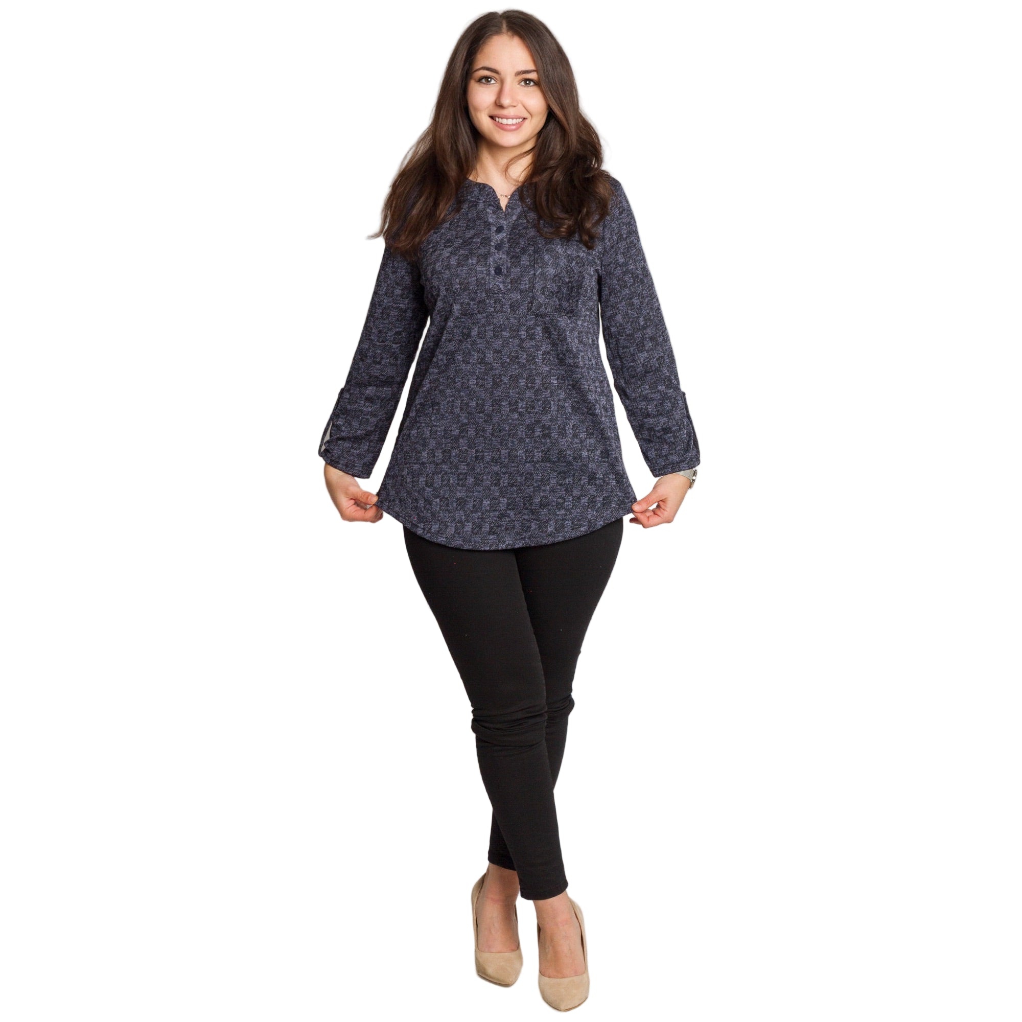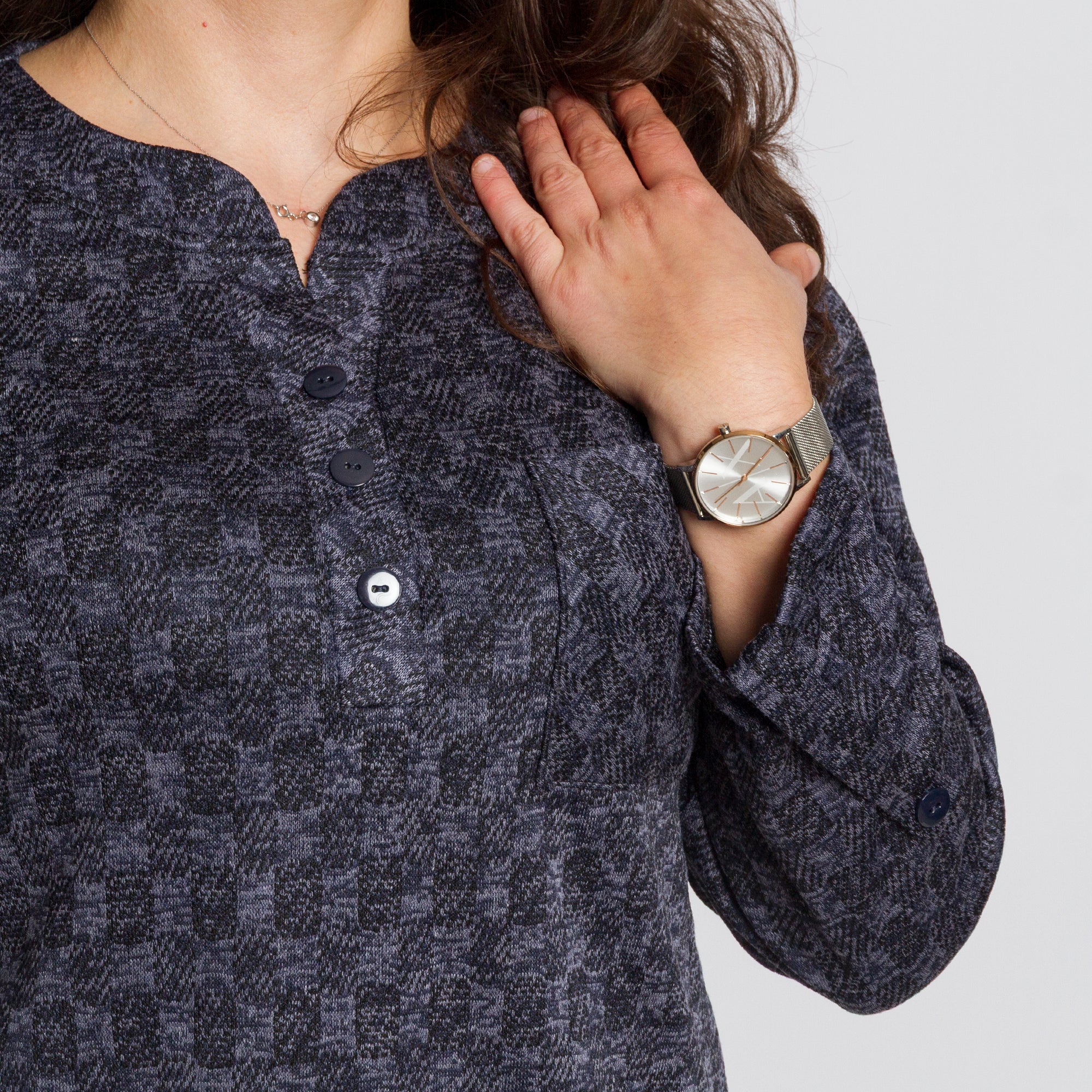 Тази тъмносиня туника е създадена за комфорт и стил в ежедневието. Меката материя от 100% полиестер пада красиво по тялото, без да се впива и осигурява леко усещане през целия ден. Правата кройка е идеална за плюс сайз фигури – подчертава силуета без да ограничава движението. Облото деколте с копчета придава свеж и модерен акцент, а функционалният преден джоб добавя практичност и допълнителен детайл. Туниката е подходяща за есенно-зимния сезон и лесно се комбинира с дънки, клин или панталон за завършен и удобен ежедневен аутфит.