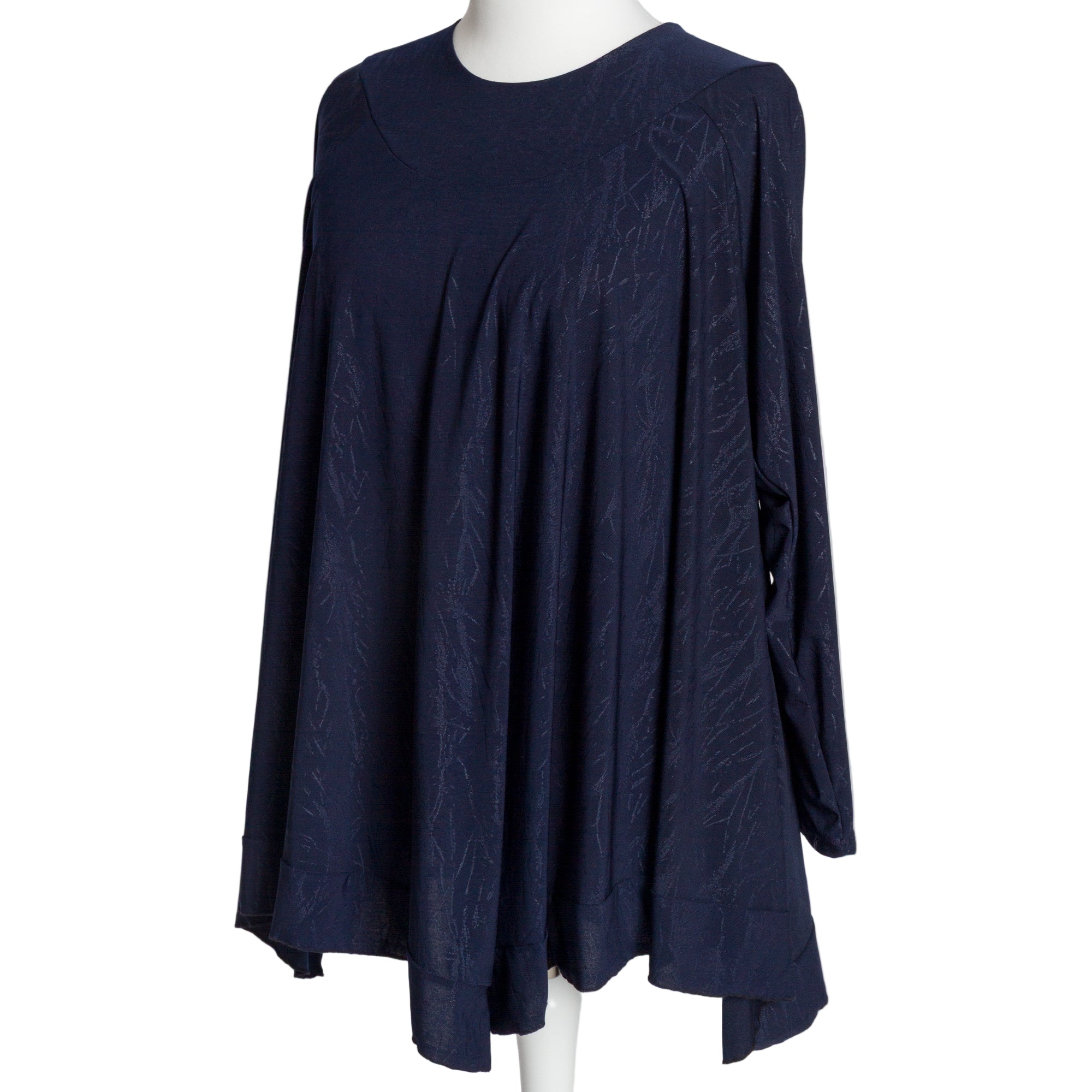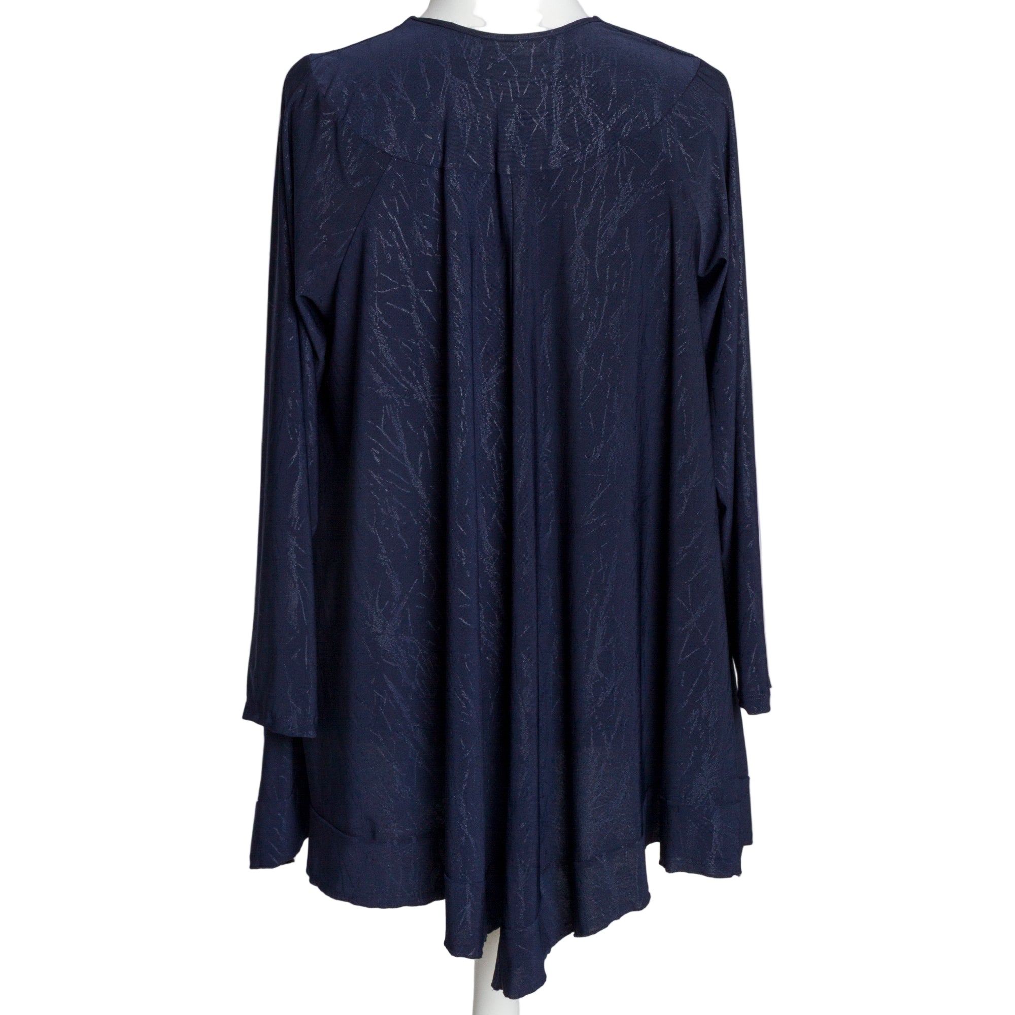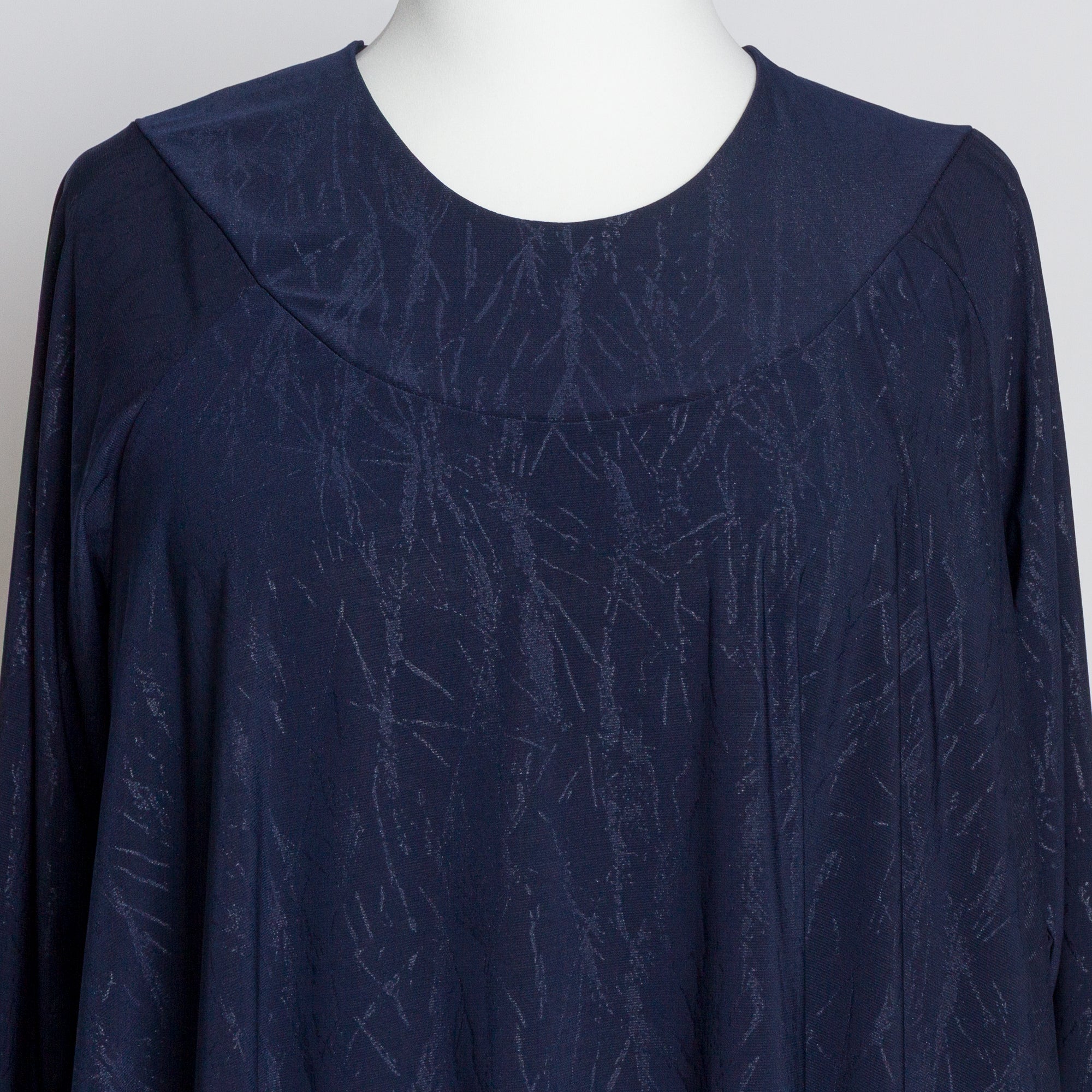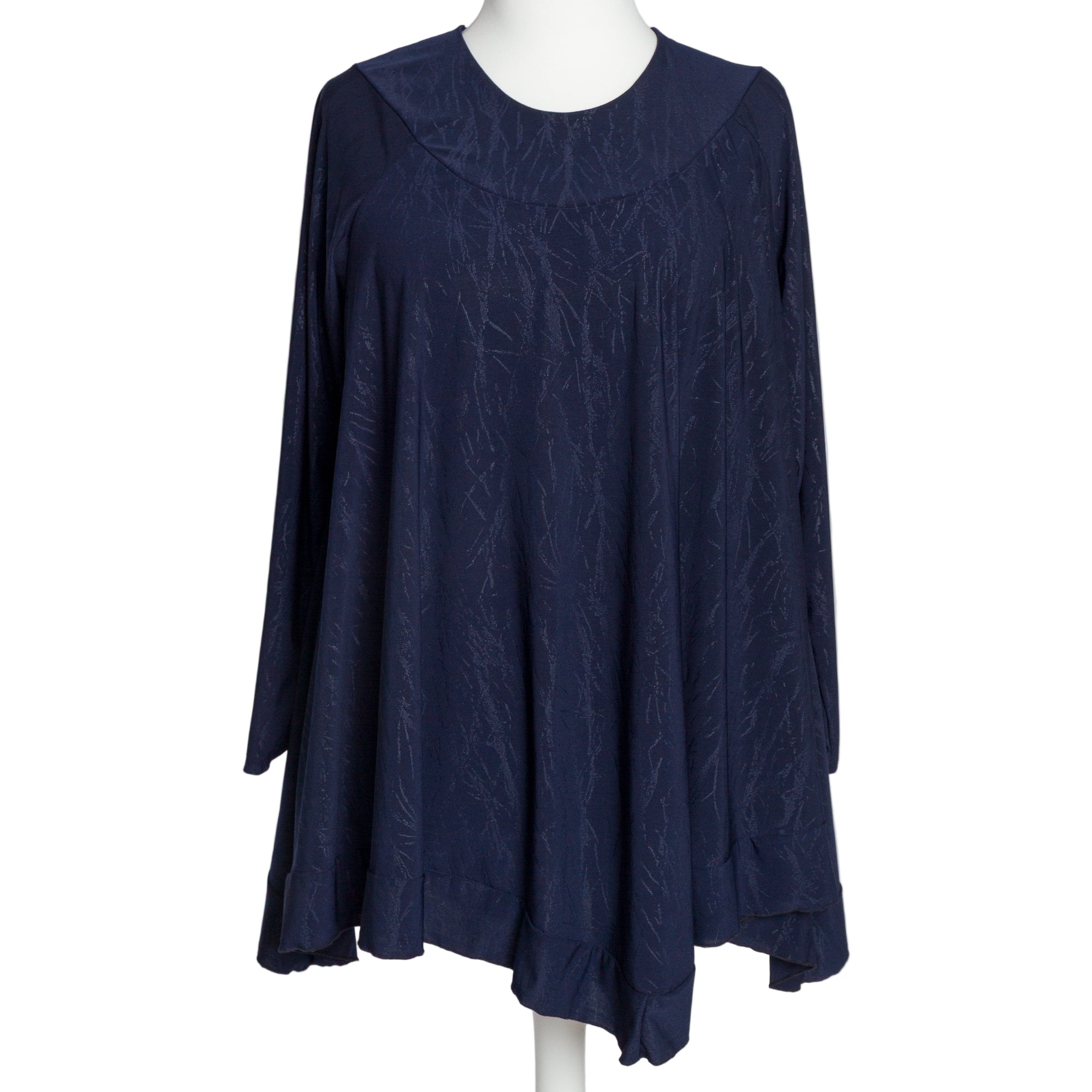 Елегантна туника в тъмносин цвят, изработена от 100% вискоза с фина релефна текстура, напомняща клонковиден мотив. Материята е мека и еластична, осигуряваща удобство и свобода на движение. Разкроената кройка прикрива деликатно тялото, а облият кант на деколтето добавя изискан завършек. Подходяща е за официални поводи, вечерни излизания и есенно-зимния сезон.