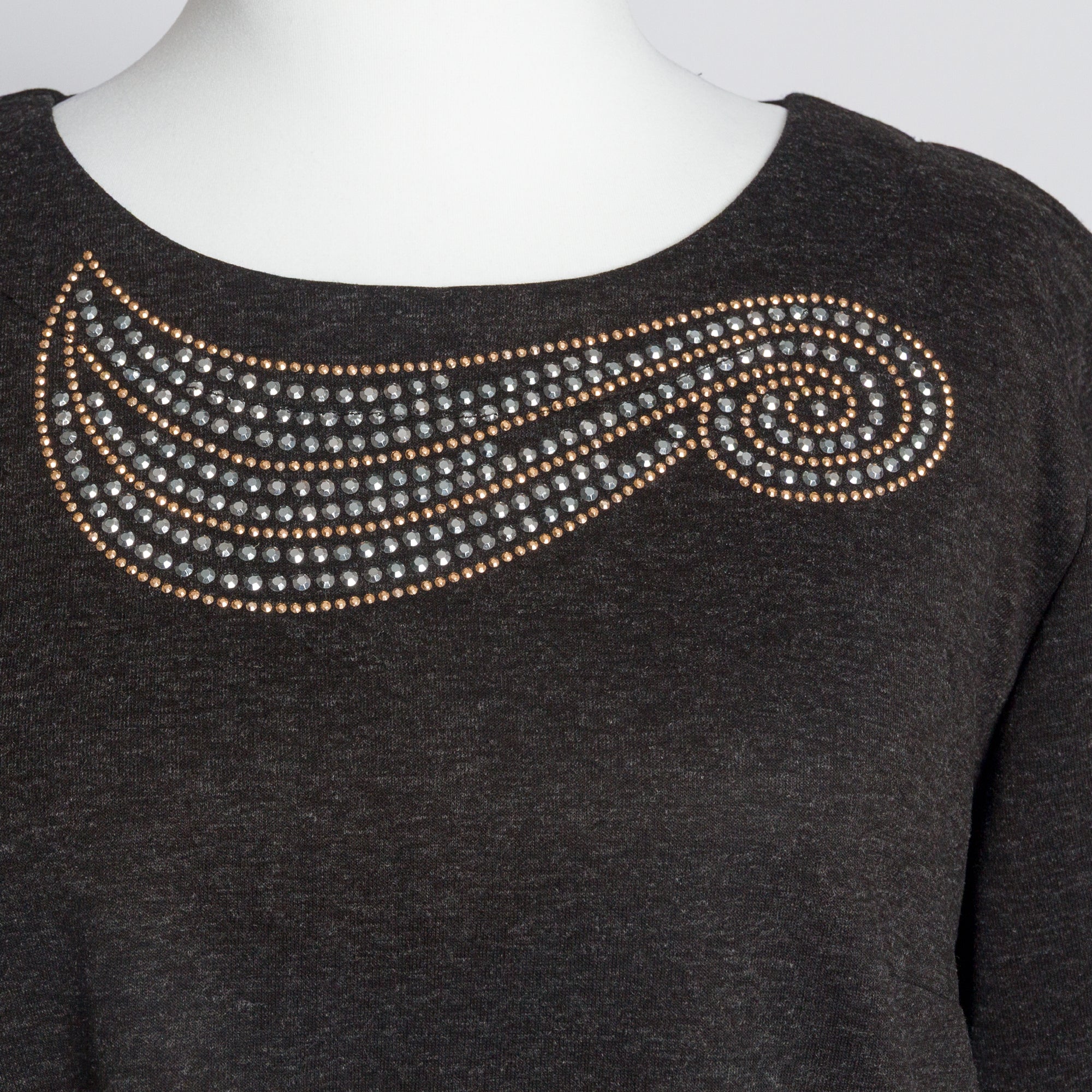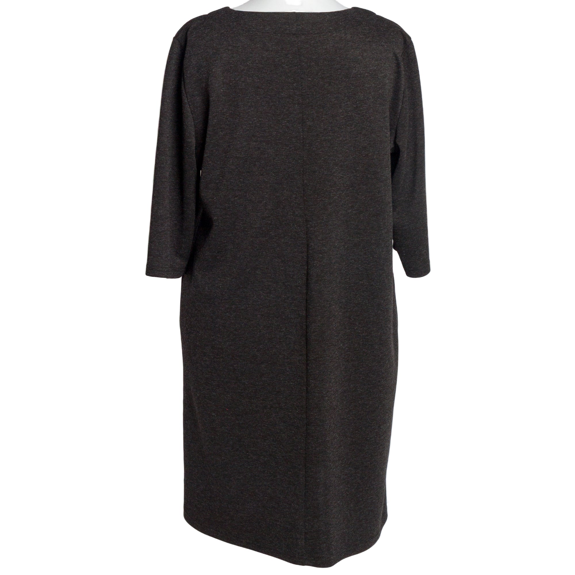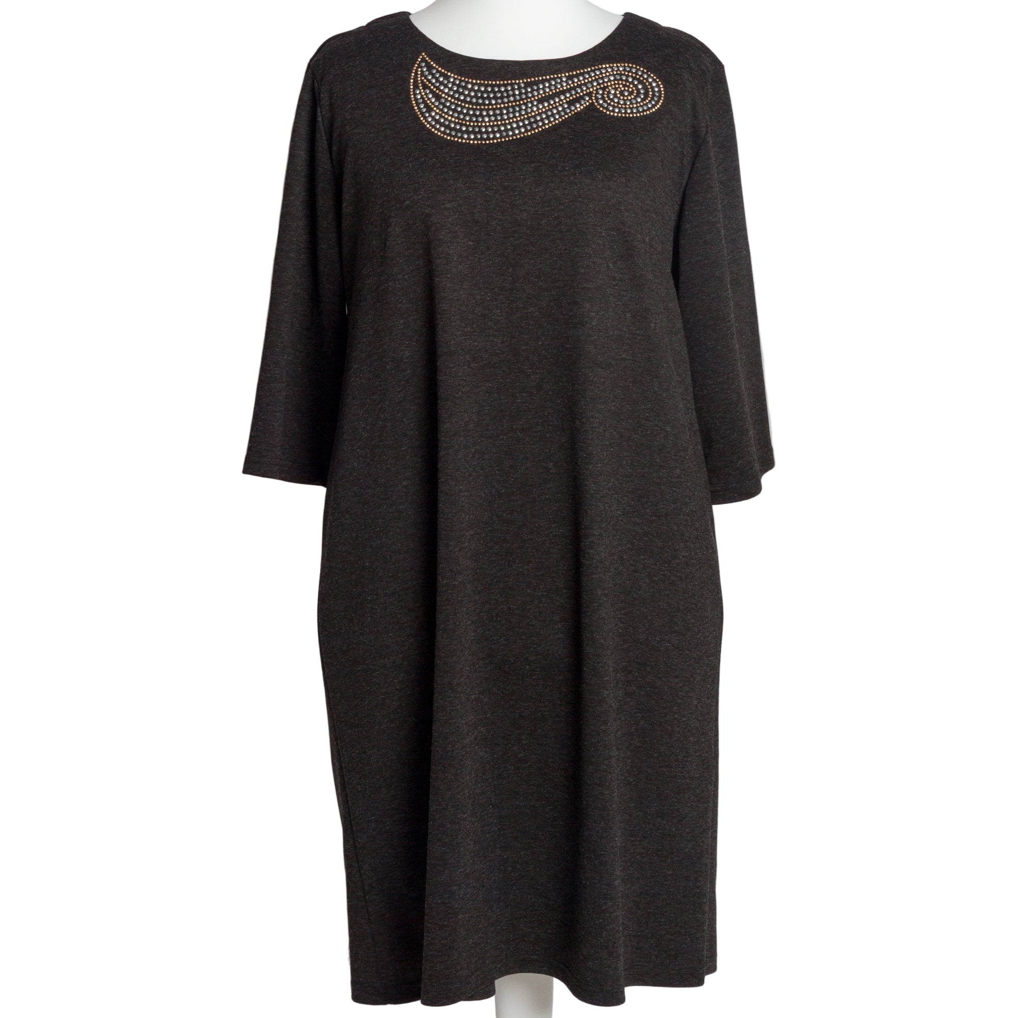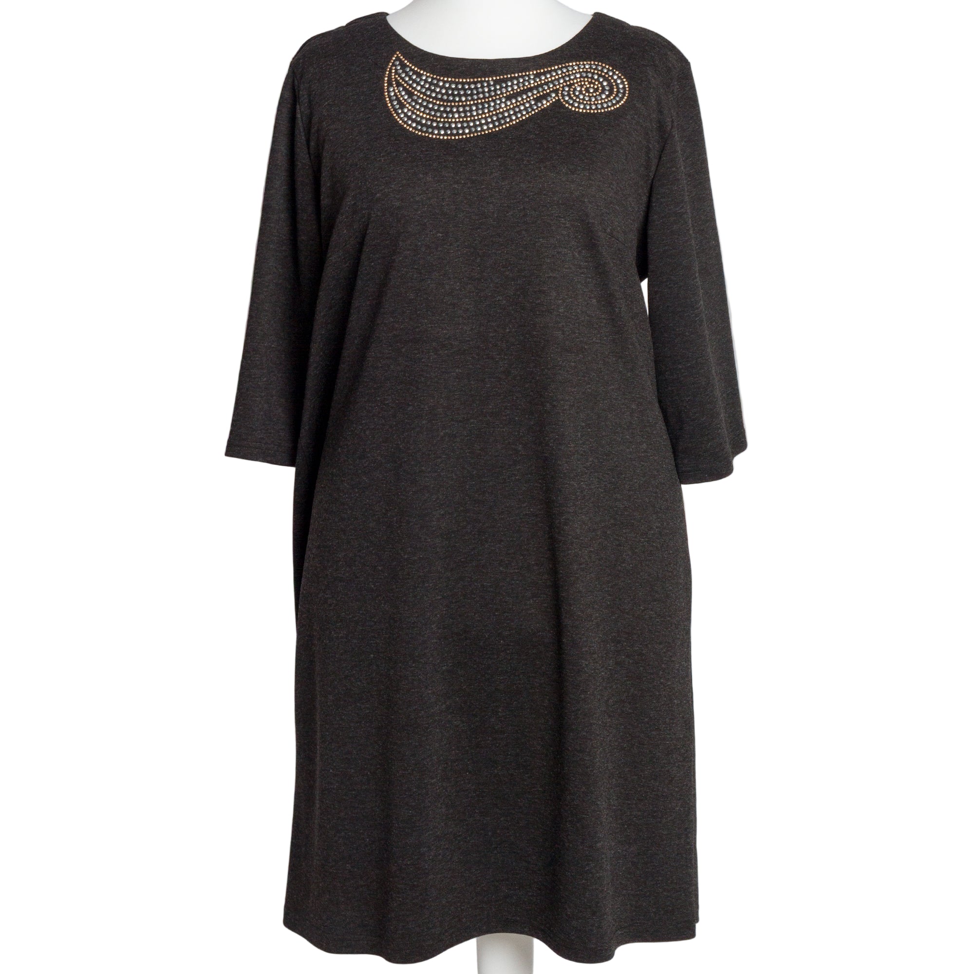 Тази тъмносива рокля е идеален избор за дами, които ценят изчистената визия и удобството. Материята е мека, еластична и се усеща приятно върху кожата. Правата кройка стои свободно по тялото и създава комфорт и увереност при носене. Облото деколте е украсено с декоративни камъни, които придават стил и изтънченост, без да правят визията прекалено официална. Тъмносивият цвят е универсален и лесен за съчетаване с всички видове аксесоари, което прави роклята подходяща както за ежедневието, така и за официални събития.