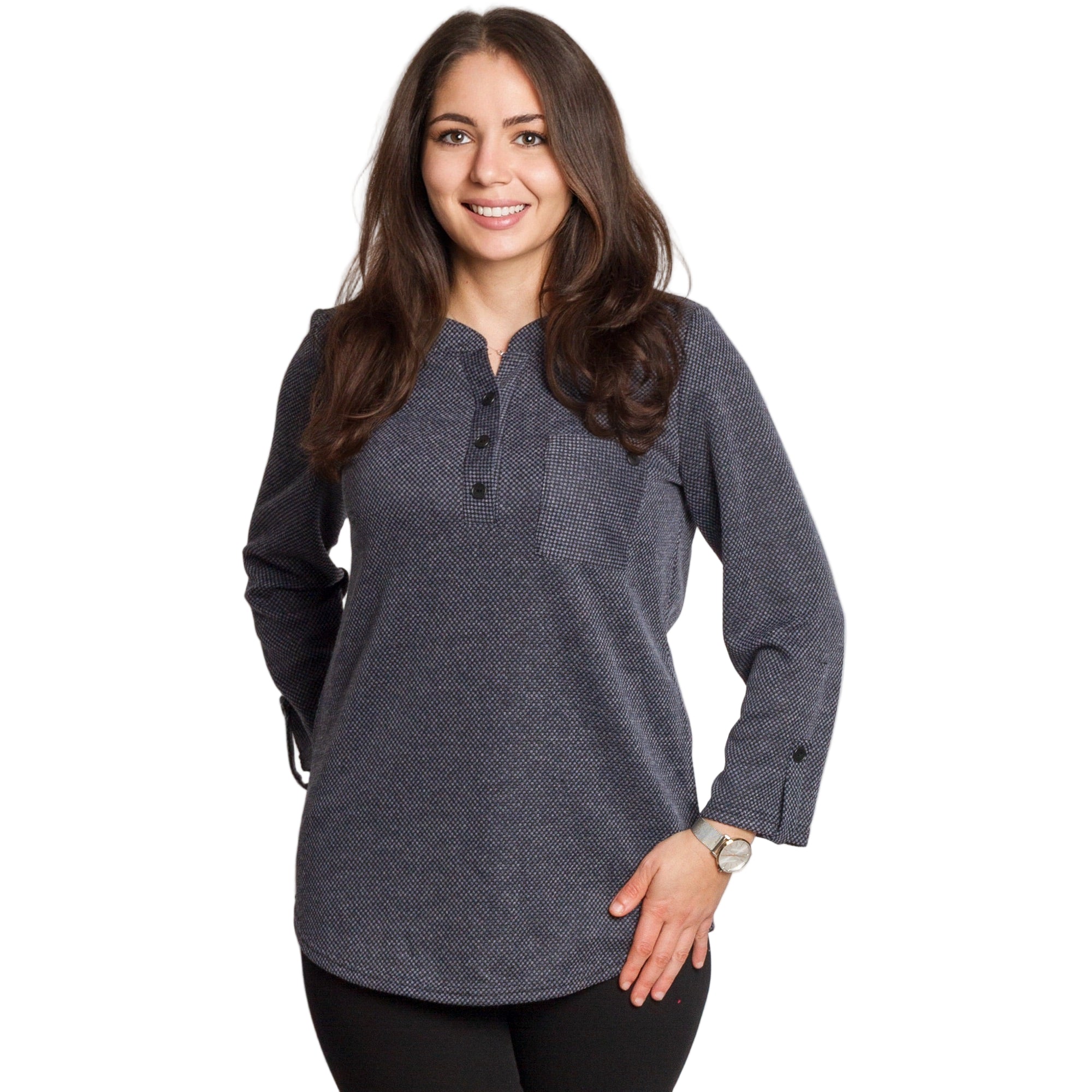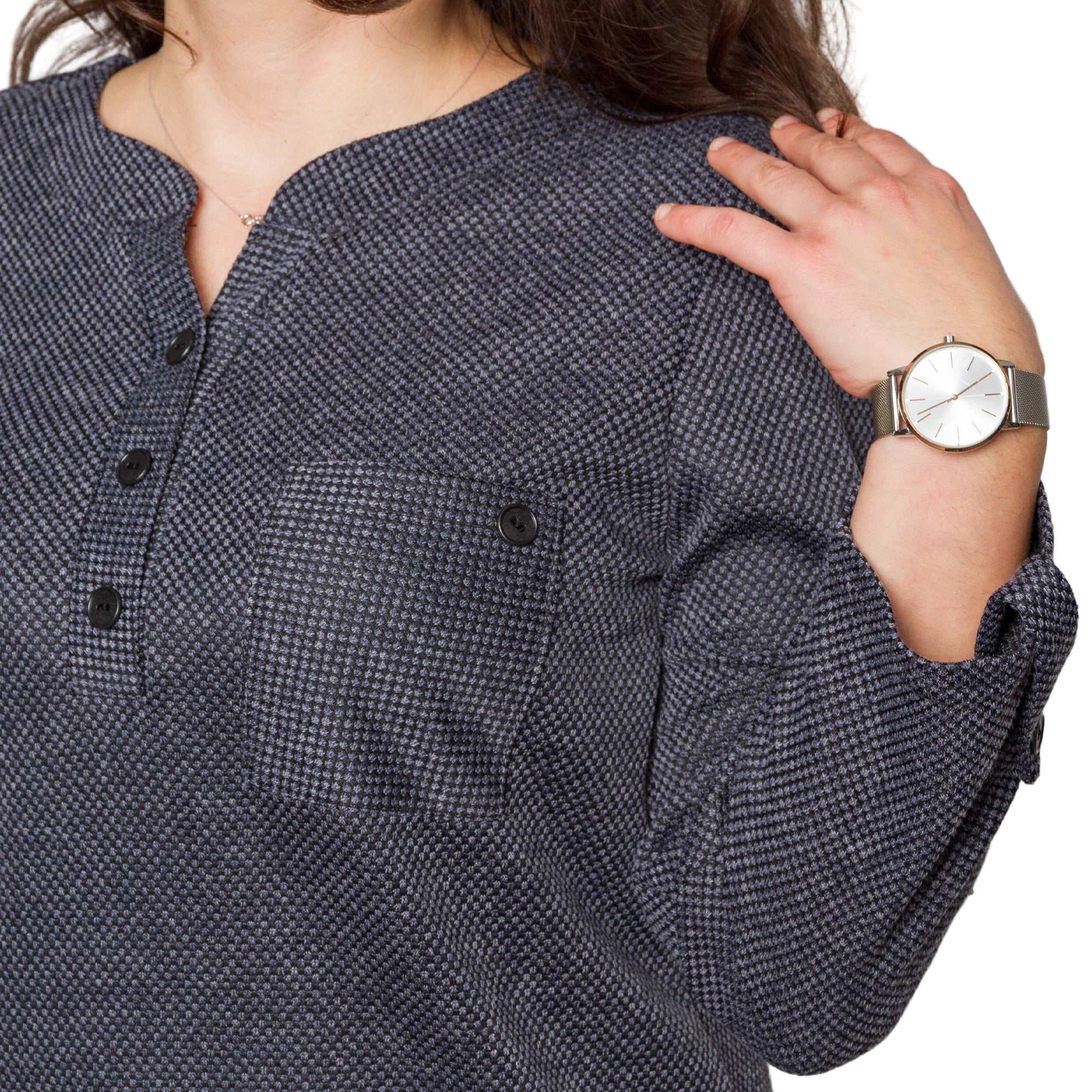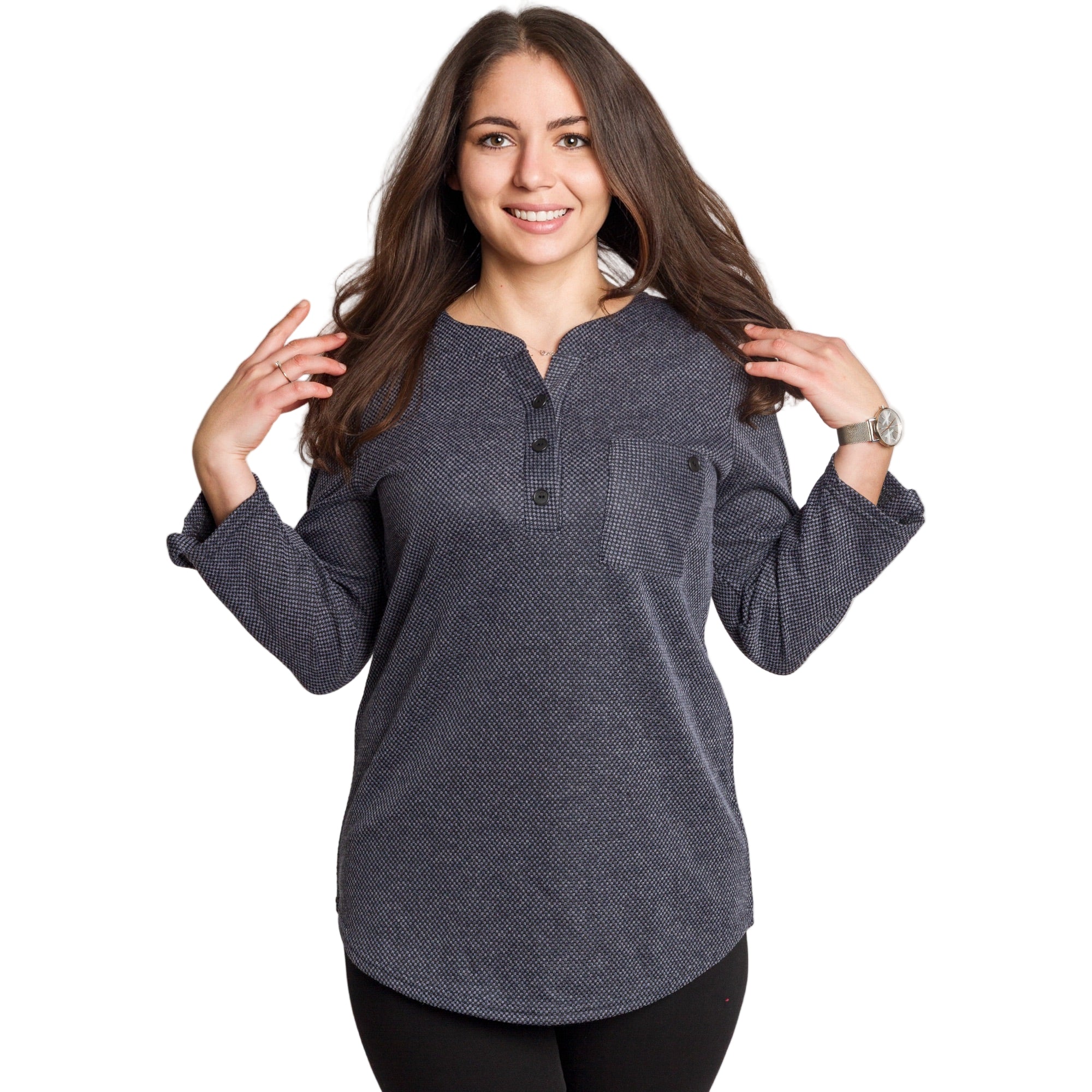 Елегантна и удобна туника в тъмносив цвят с фин геометричен принт. Меката материя от 100% полиестер пада свободно по тялото и не прилепва, което я прави идеална за ежедневието и за плюс сайз фигури. Правата кройка осигурява комфорт, а облото деколте с копчета добавя стилен акцент. Моделът има преден джоб с декоративно копче и ръкави, които могат да се носят спуснати или навити и фиксирани. Универсална и лесна за комбиниране туника за всяка ежедневна визия.
