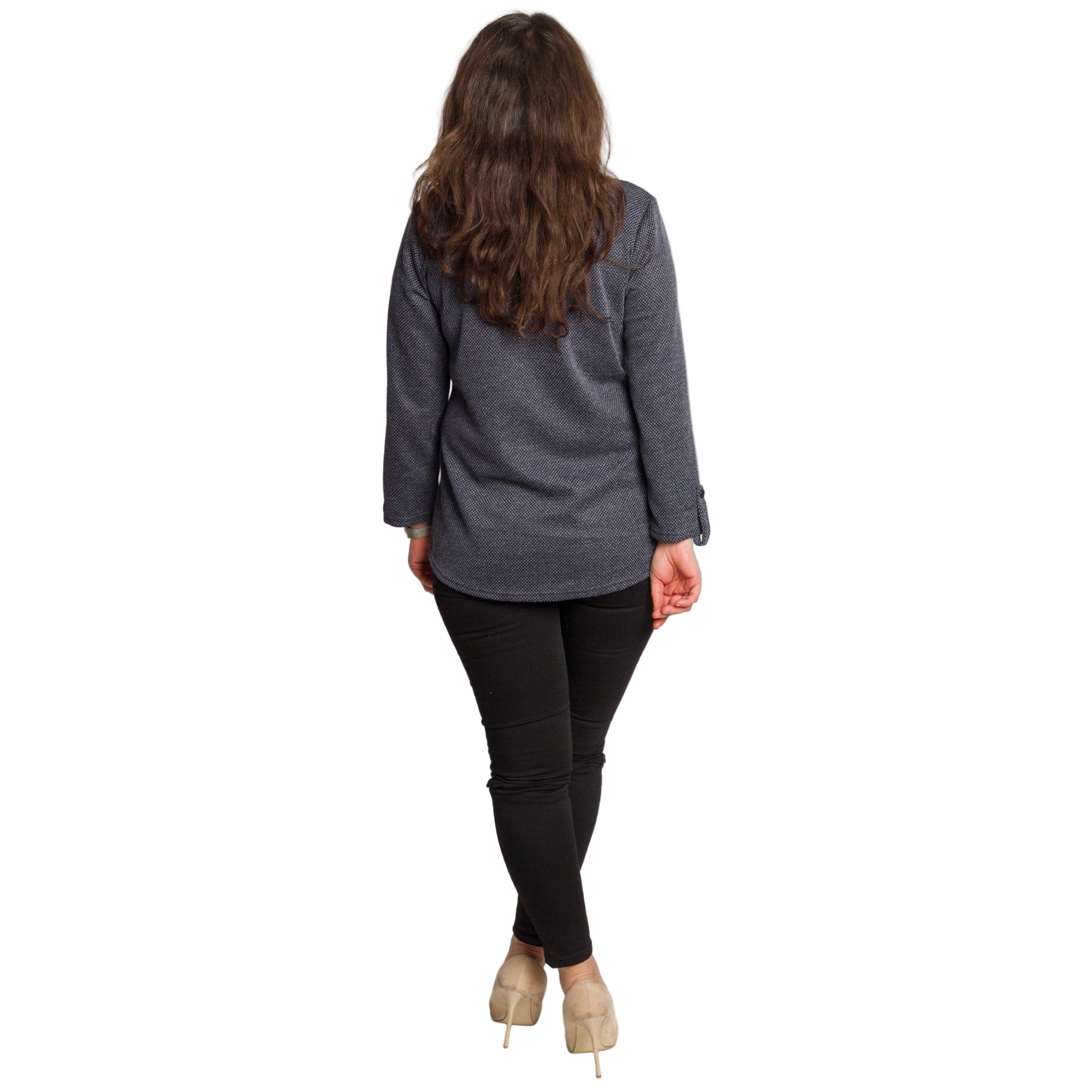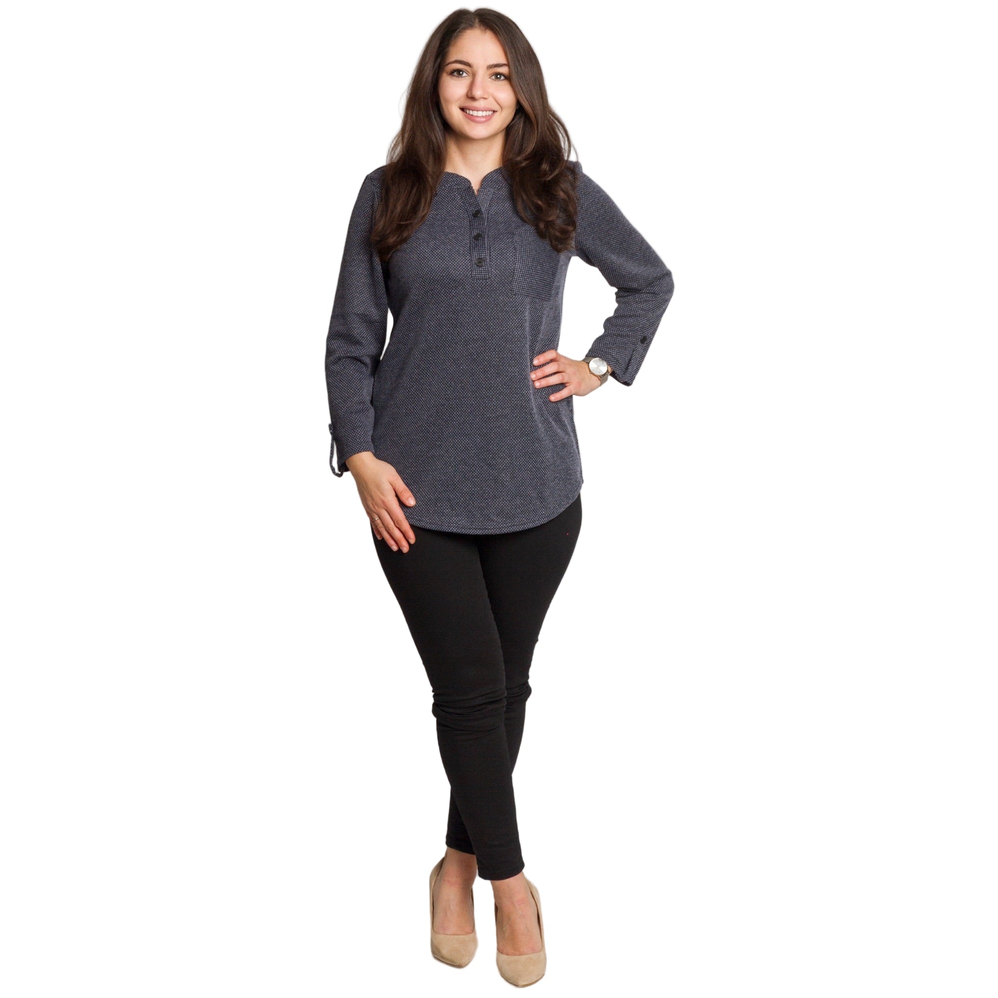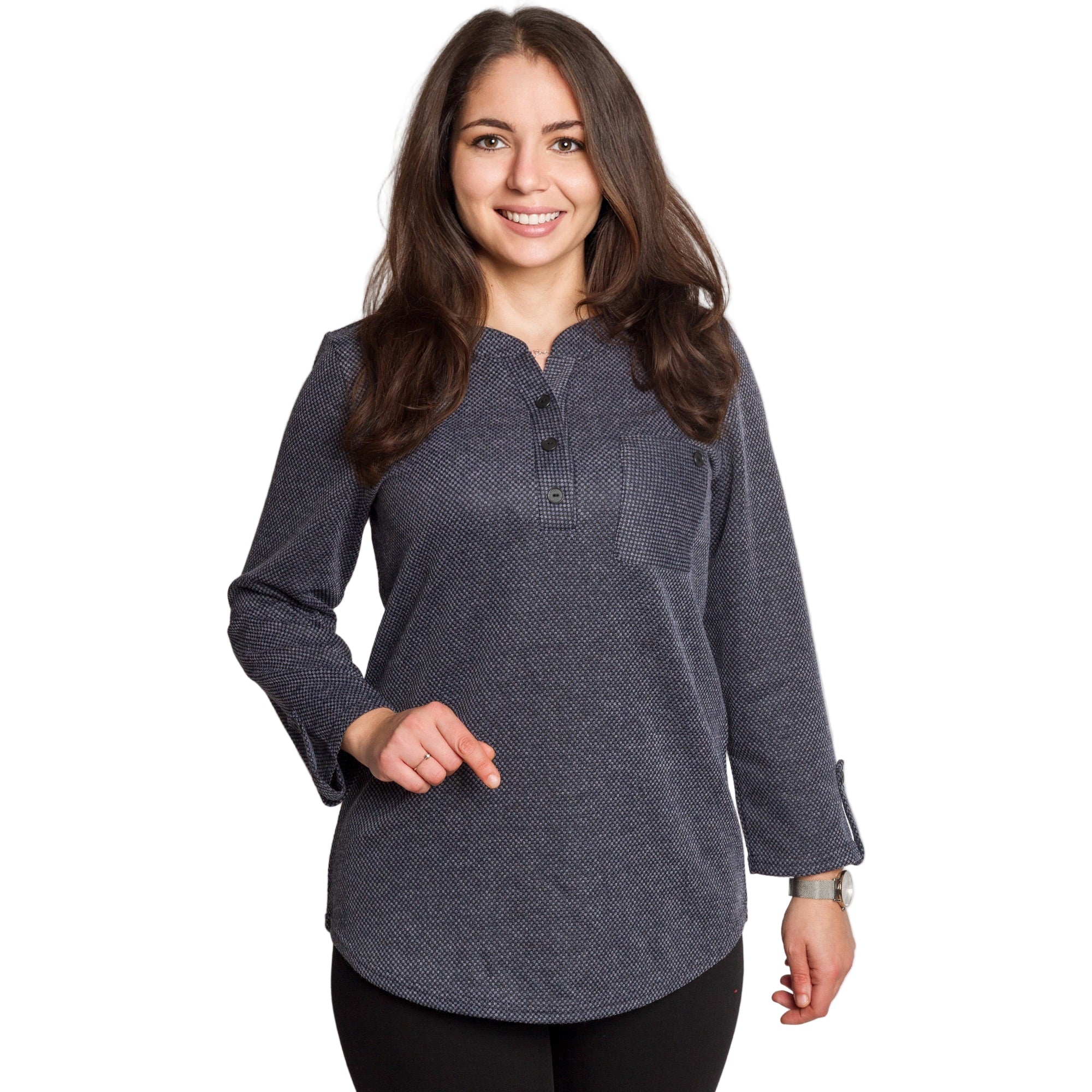 Елегантна и удобна туника в тъмносив цвят с фин геометричен принт. Меката материя от 100% полиестер пада свободно по тялото и не прилепва, което я прави идеална за ежедневието и за плюс сайз фигури. Правата кройка осигурява комфорт, а облото деколте с копчета добавя стилен акцент. Моделът има преден джоб с декоративно копче и ръкави, които могат да се носят спуснати или навити и фиксирани. Универсална и лесна за комбиниране туника за всяка ежедневна визия.