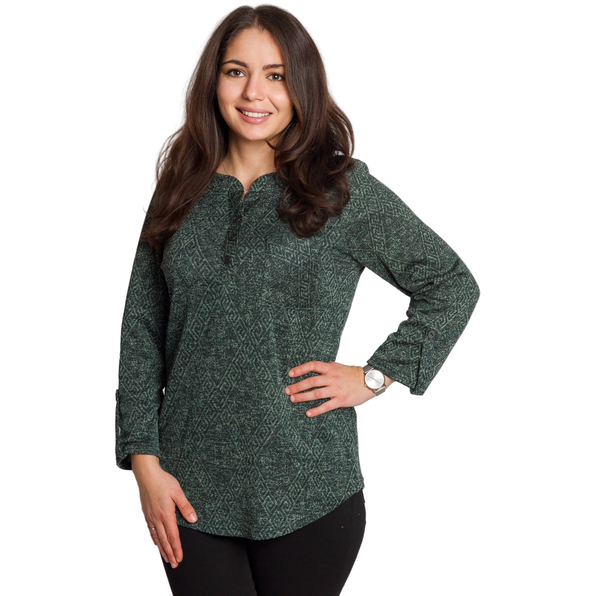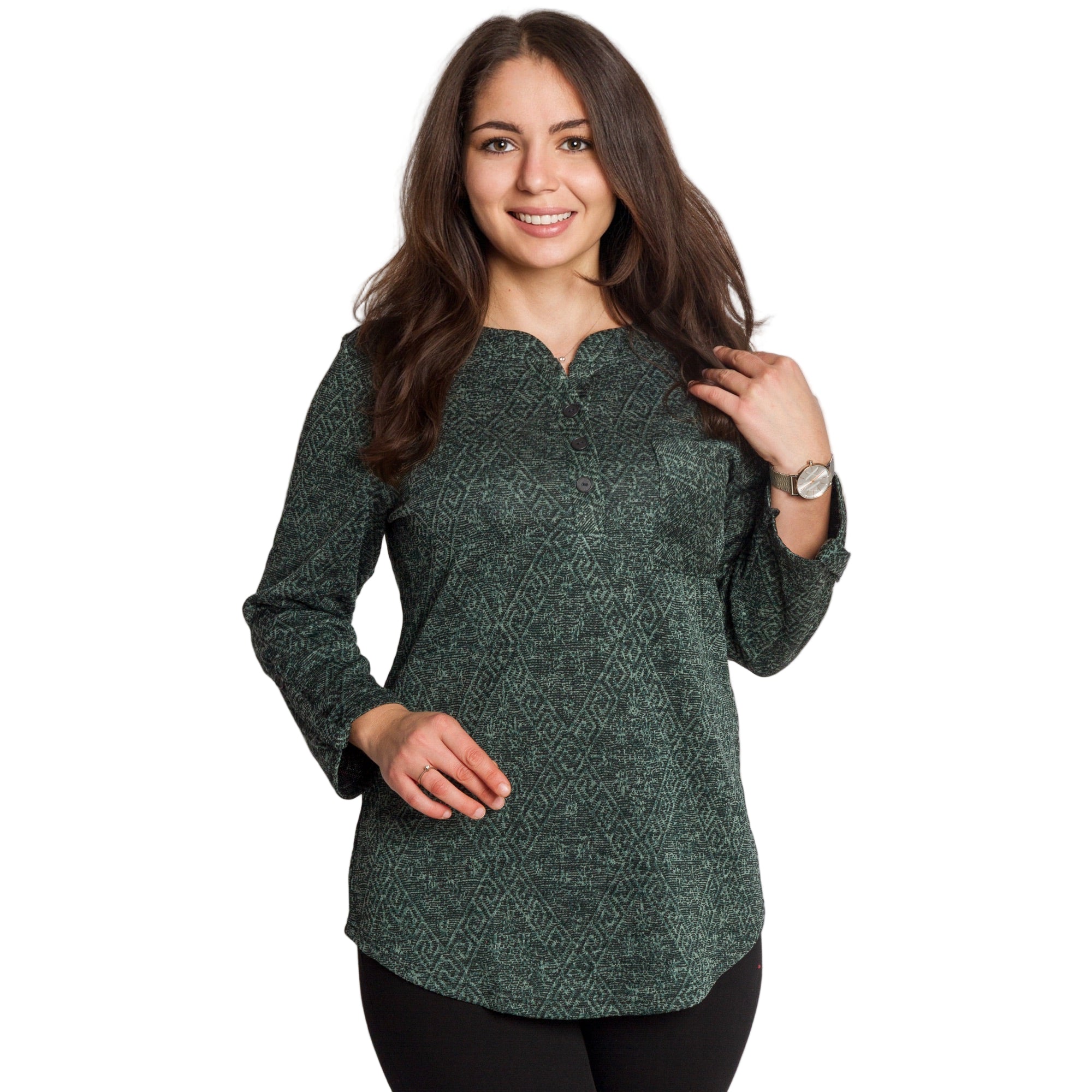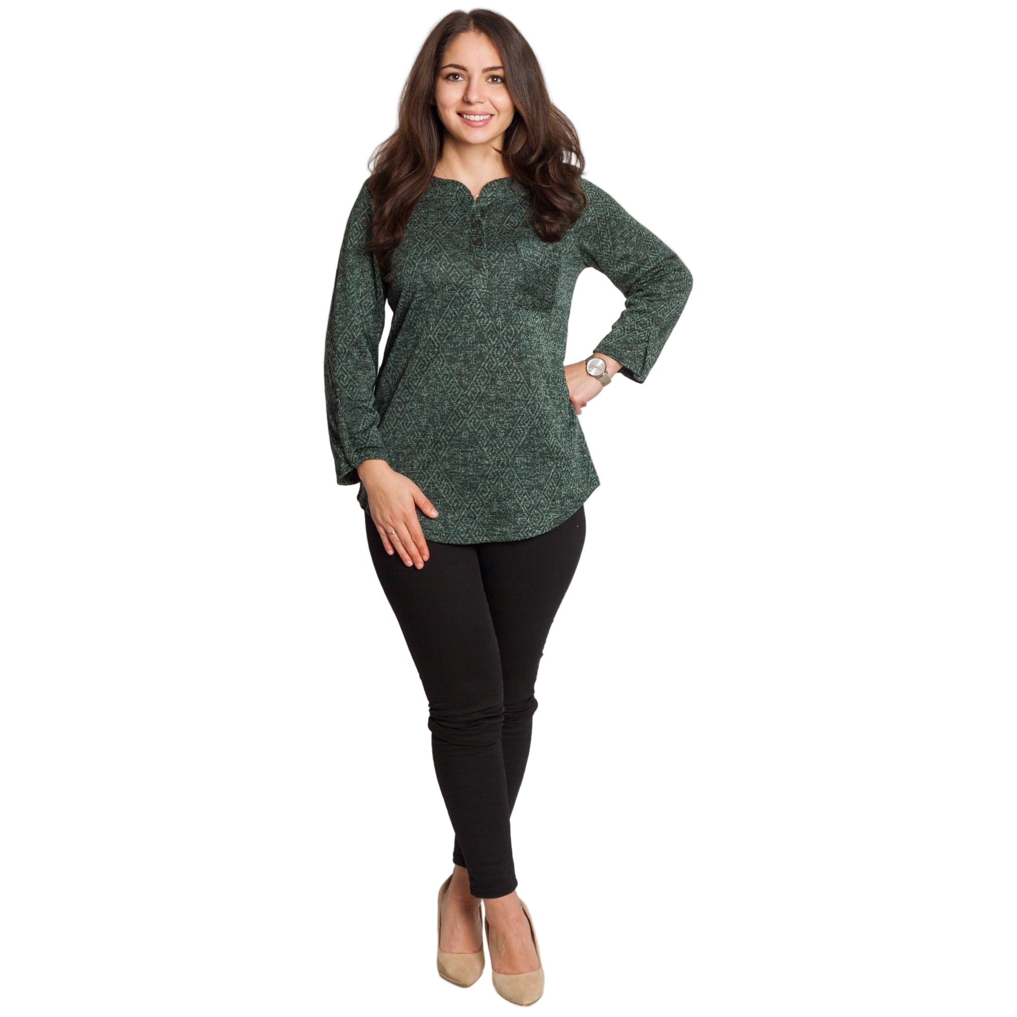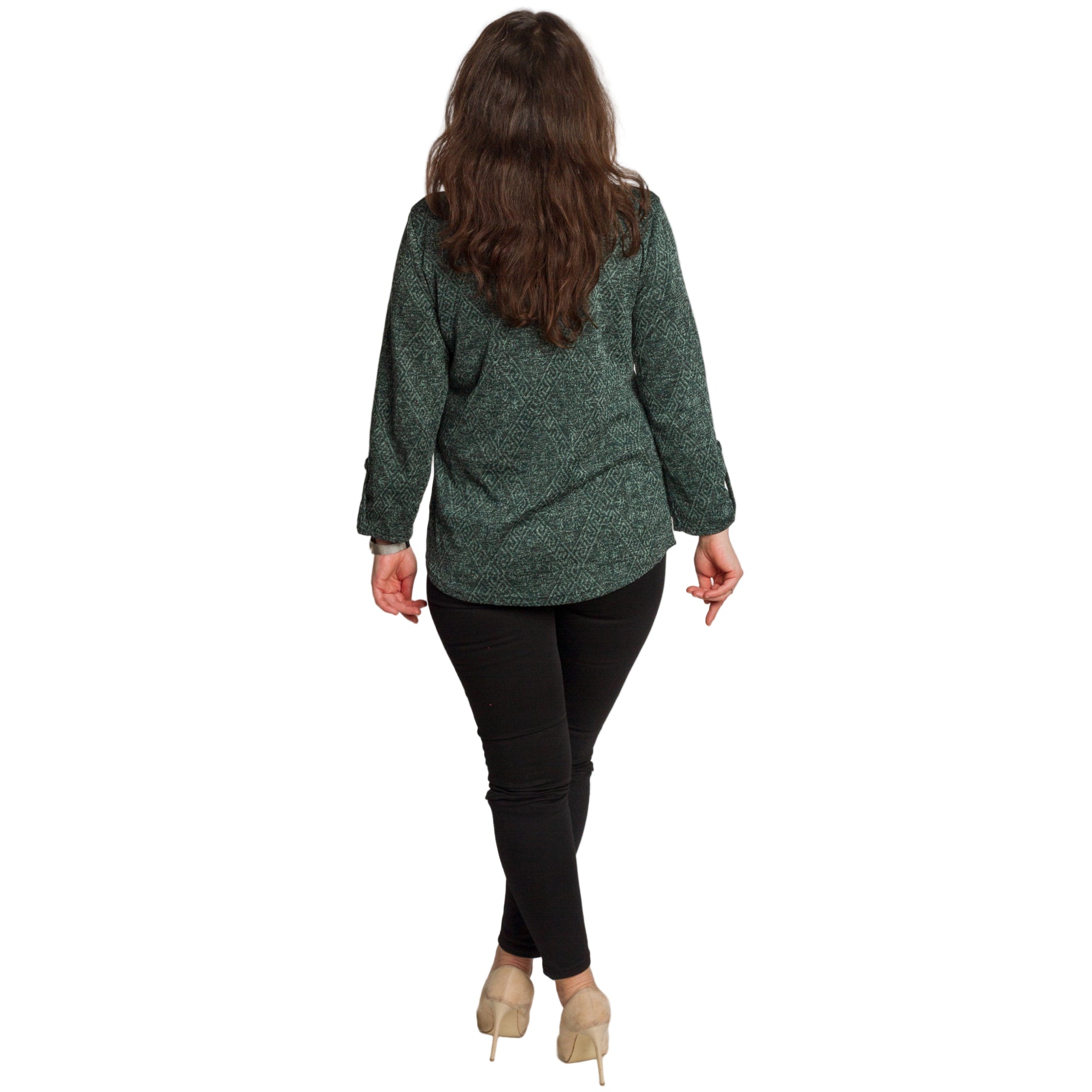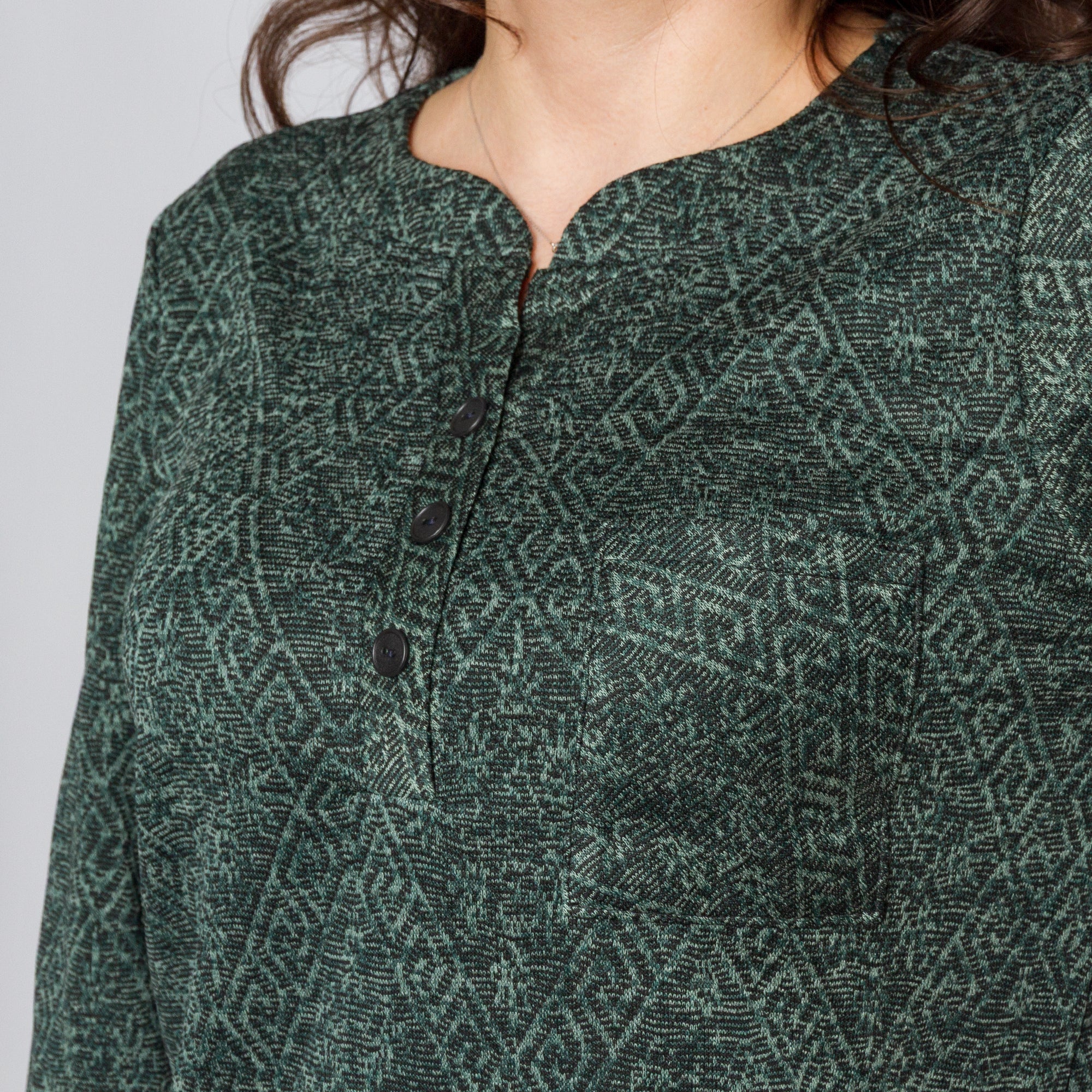 Елегантна и удобна плюс сайз туника в тъмнозелен цвят с фин геометричен принт. Меката материя от 100% полиестер пада свободно по тялото и не се надува, което осигурява комфорт през целия ден. Правата кройка подчертава силуета, без да прилепва, а обло деколте с копчета създава изчистена и стилна визия. Моделът разполага с практичен джоб отпред и ръкави, които могат да се носят спуснати или навити и фиксирани с копче. Идеална за ежедневието – лесно се комбинира с панталон, дънки или клин.