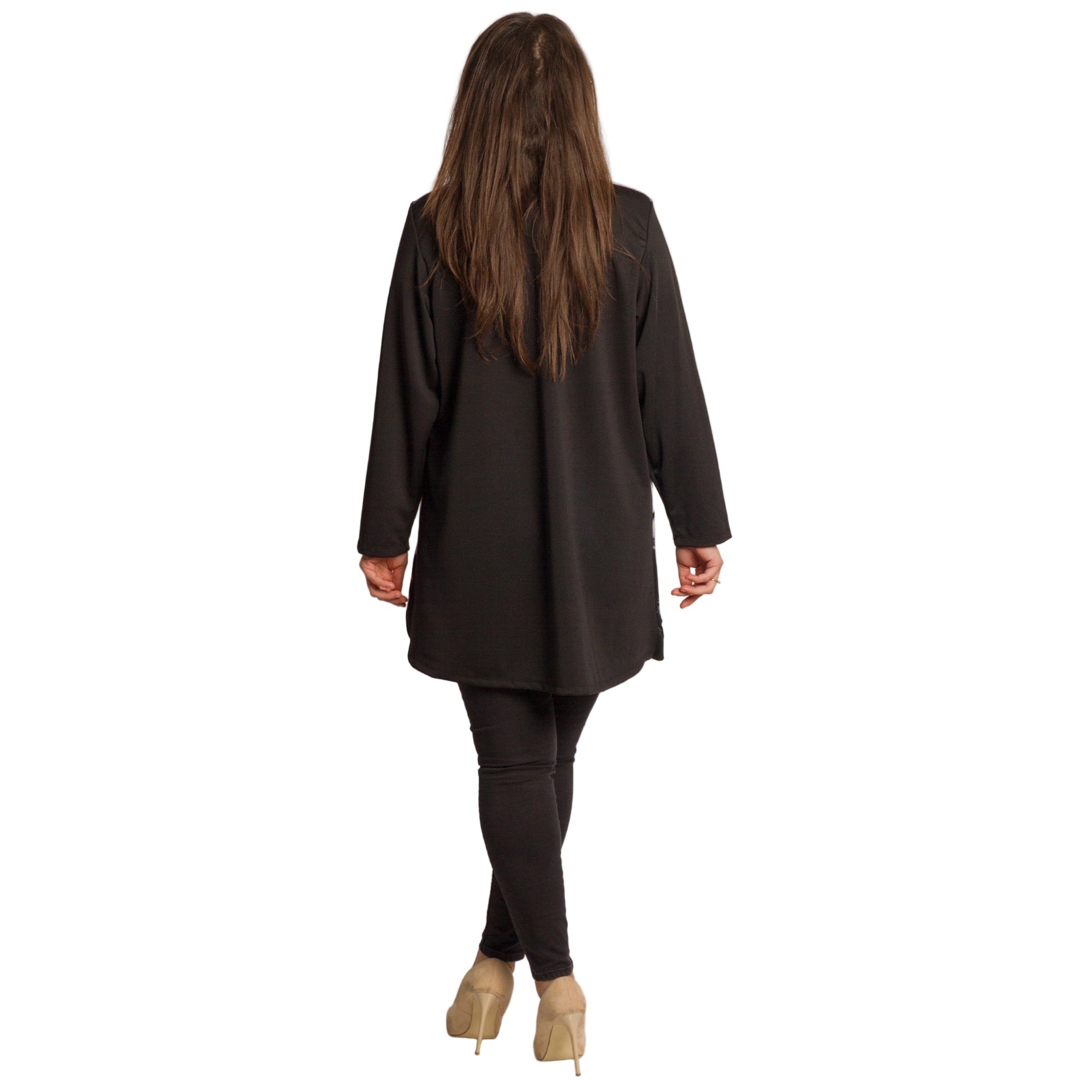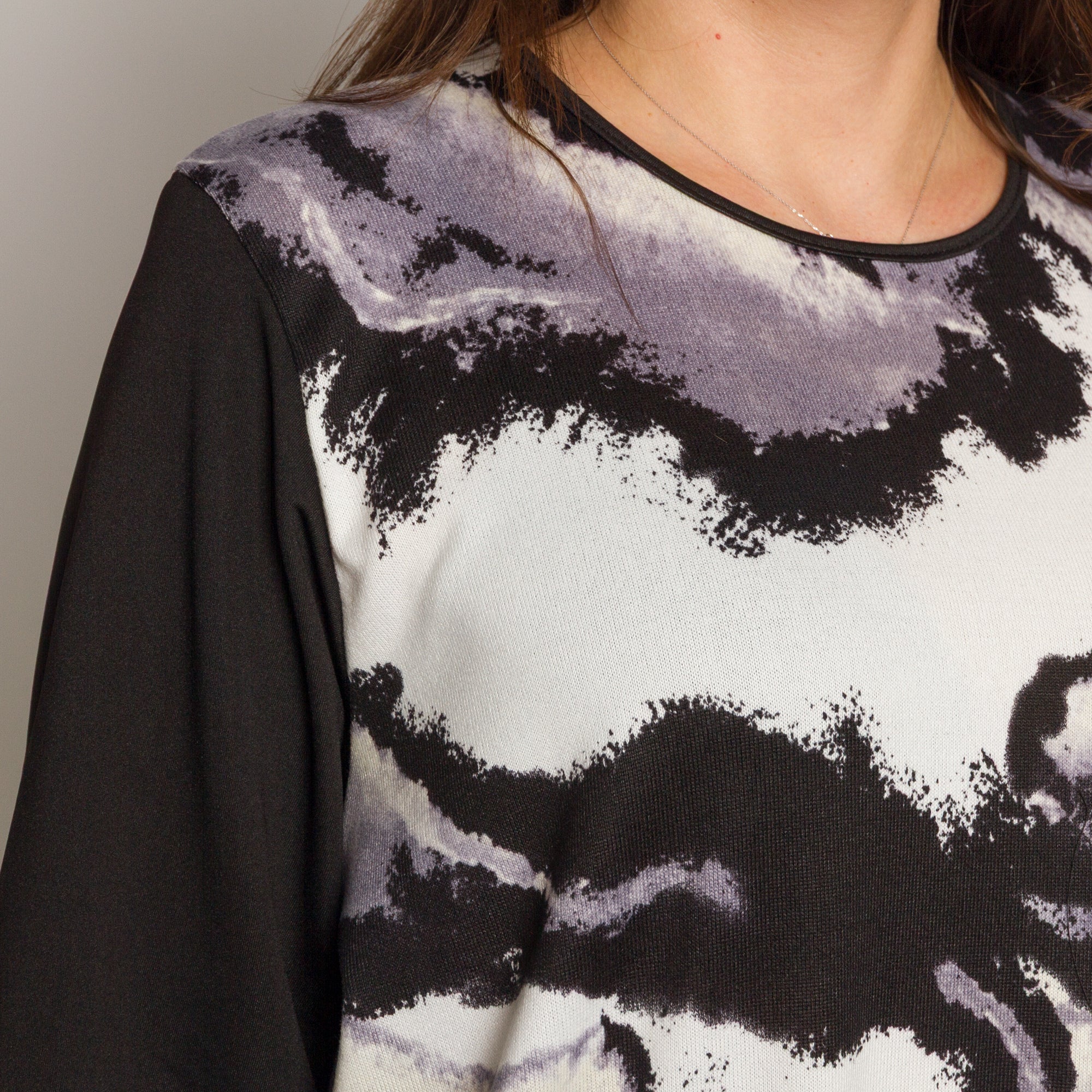 Елегантна туника в големи размери, съчетаваща комфорт и стил. Предната част е с атрактивен абстрактен десен в черно, бяло и лилаво, а ръкавите и гърбът са изчистени в черен цвят. Кръглото деколте и свободната кройка осигуряват удобство, а дългите ръкави я правят подходяща за по-хладните сезони. Туниката е универсален избор за ежедневието, но също така и за по-официални поводи, когато се комбинира с подходящи аксесоари.