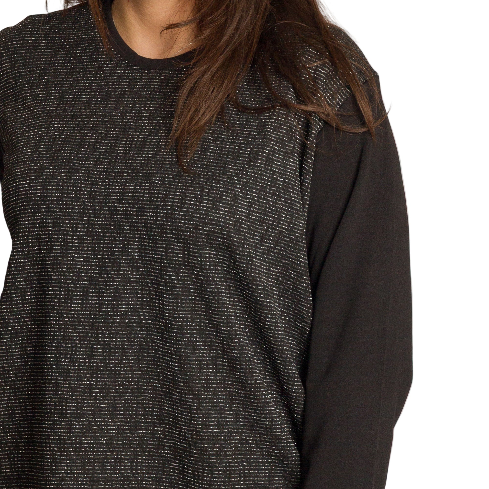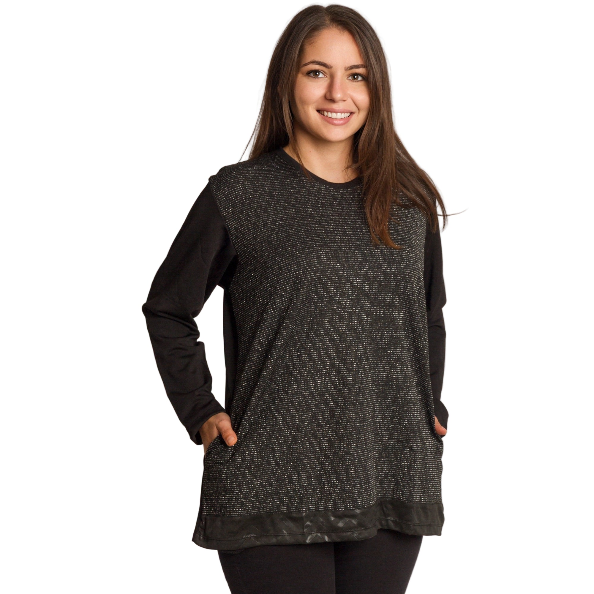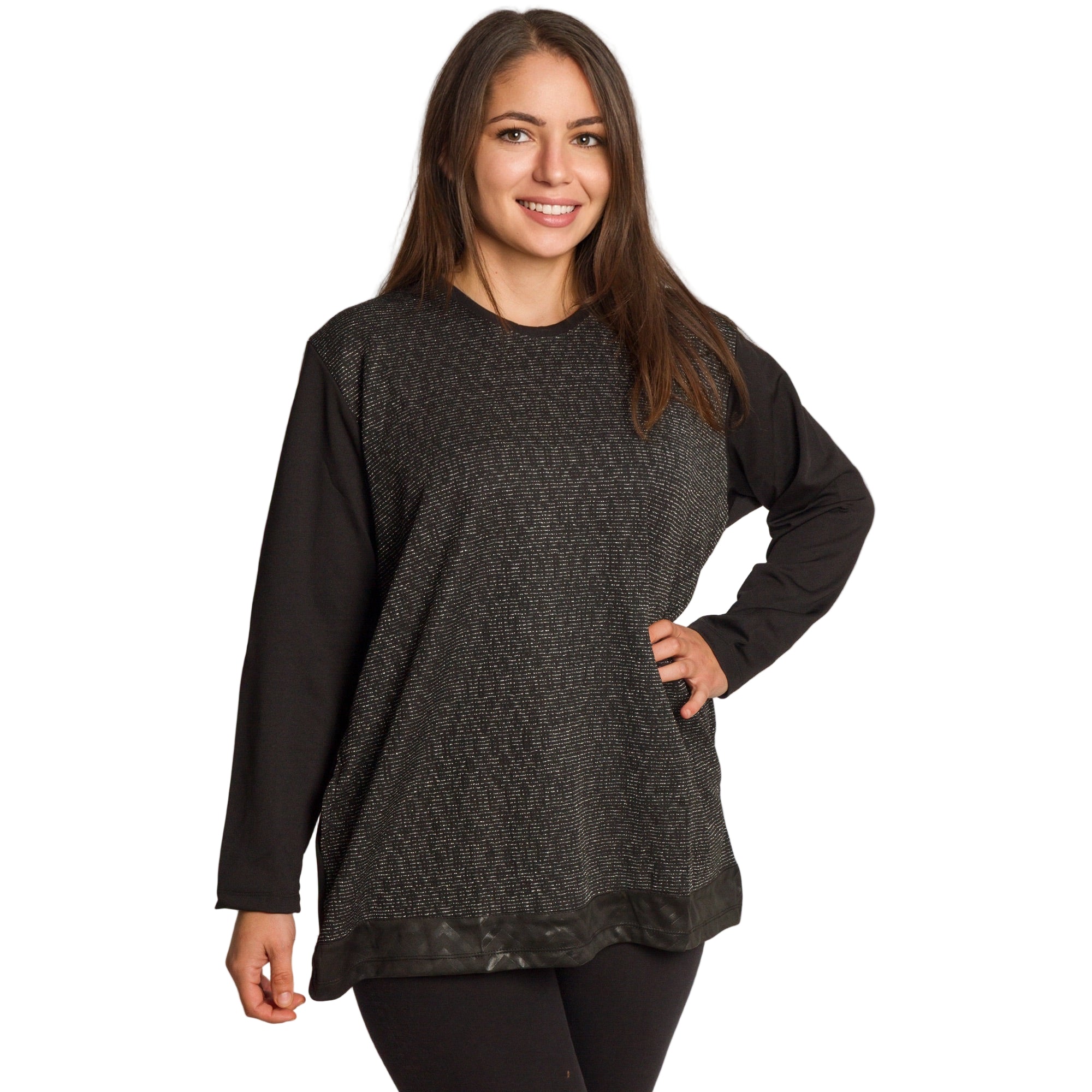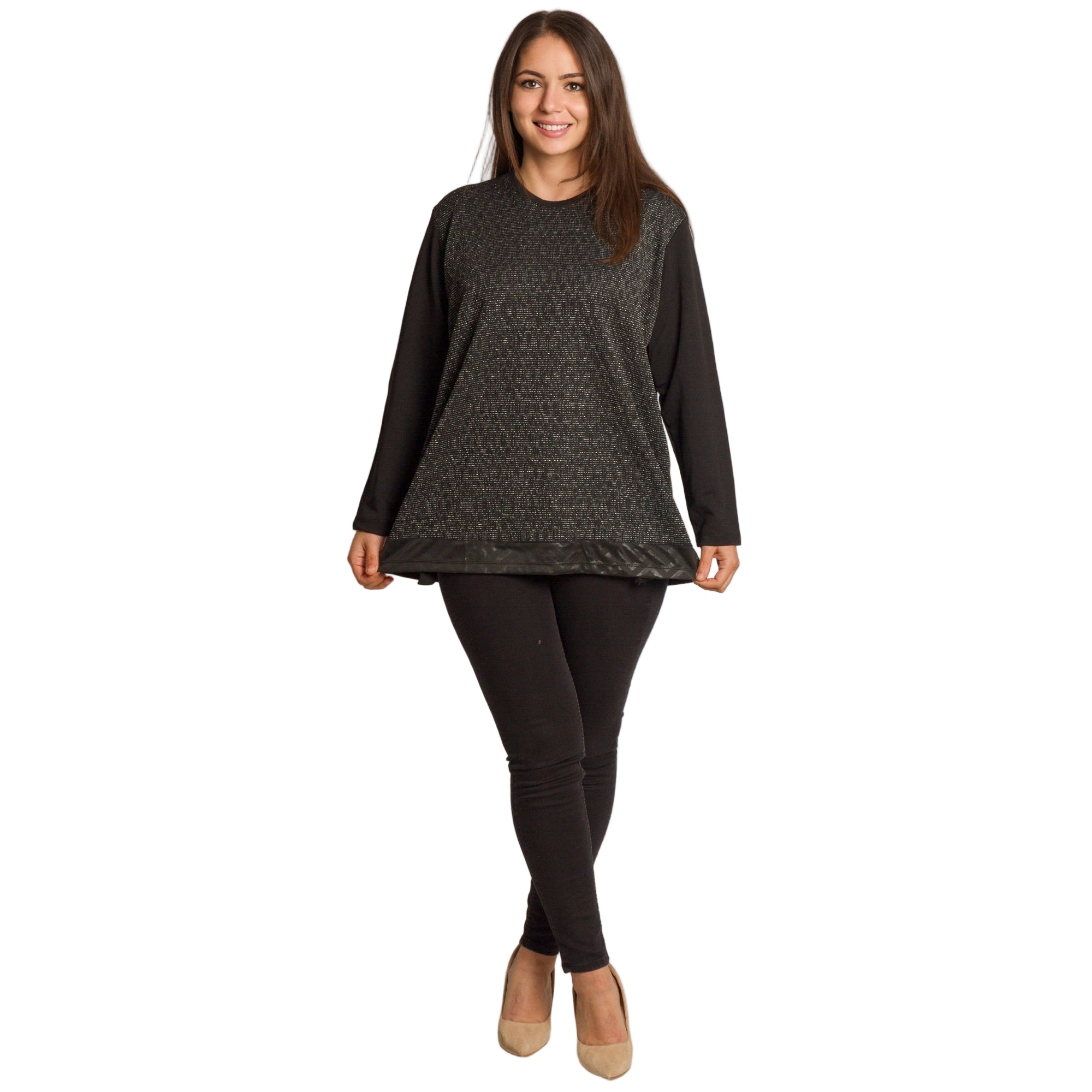 Елегантна туника в големи размери със свободна и удобна кройка, създадена за жени, които търсят комфорт и стил. Предната част е с фино сребристо райе върху черна основа, а ръкавите и гърбът са изчистени в черно. Моделът е с дълги ръкави, кръгло деколте и декоративен кант в долната част, което придава завършеност и изисканост. Практичните джобове отстрани правят туниката едновременно удобна и модерна. Подходяща е както за ежедневието, така и за по-официални поводи през есенно-зимния сезон.