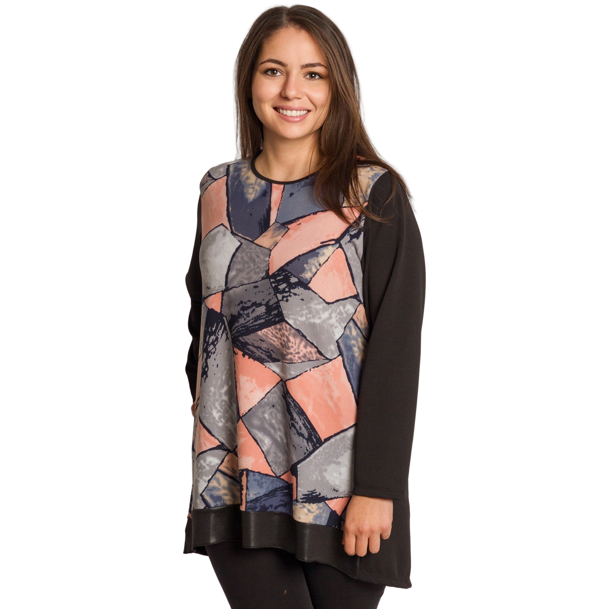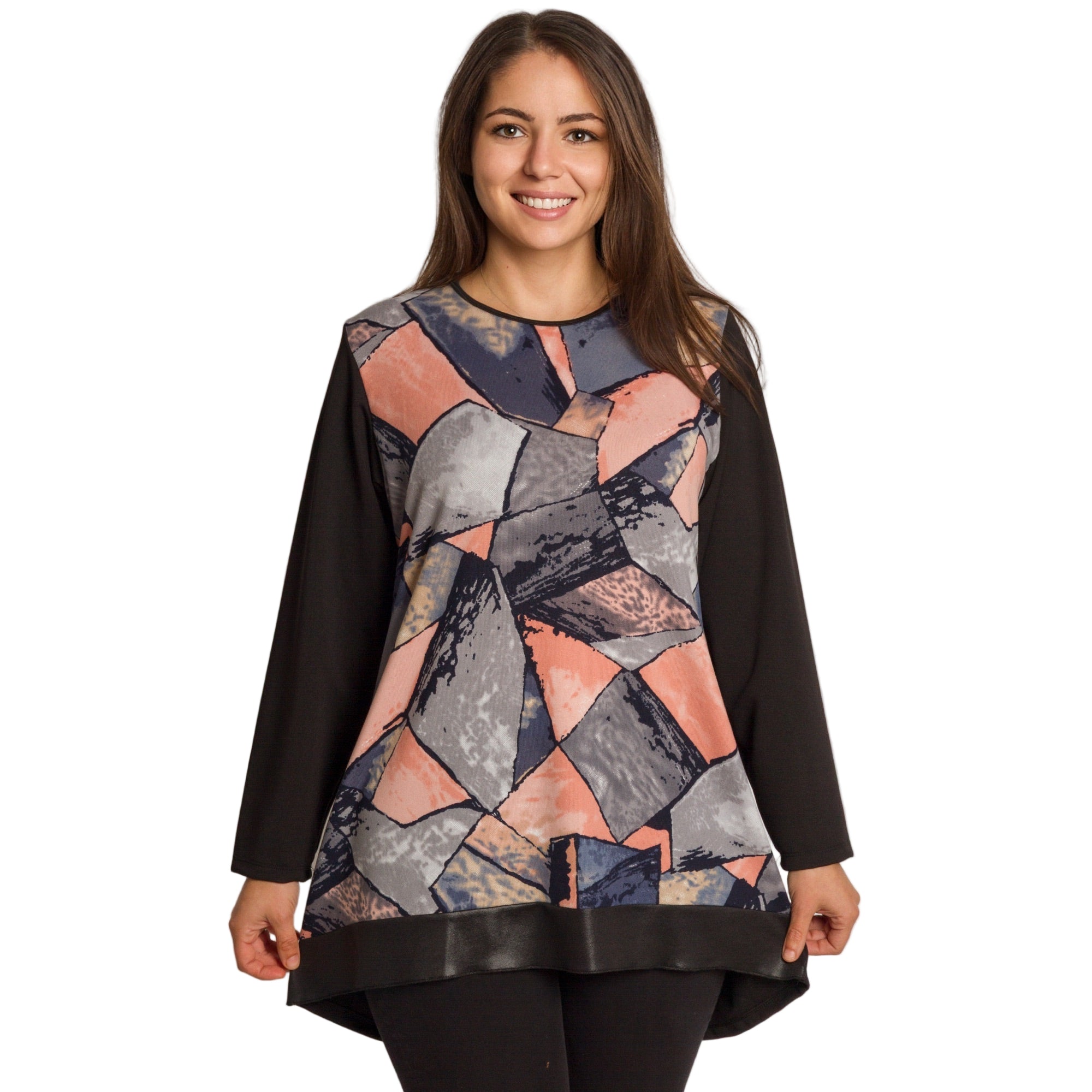 Модерна туника в големи размери със свободна кройка и дълъг ръкав, идеална за есенно-зимния сезон. Предната част е с ефектен геометричен десен в коралово, сиво и тъмносиньо, комбиниран с изчистен черен гръб и ръкави. Кръглото деколте и асиметричният подгъв с черна лента придават завършен и стилен вид. Подходяща е както за ежедневието, така и за по-официални поводи, когато се комбинира с панталон или клин.