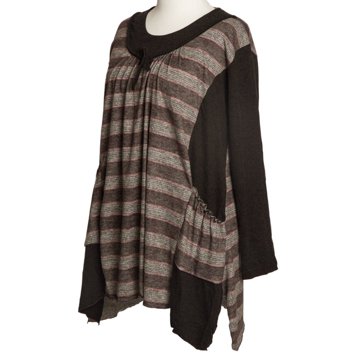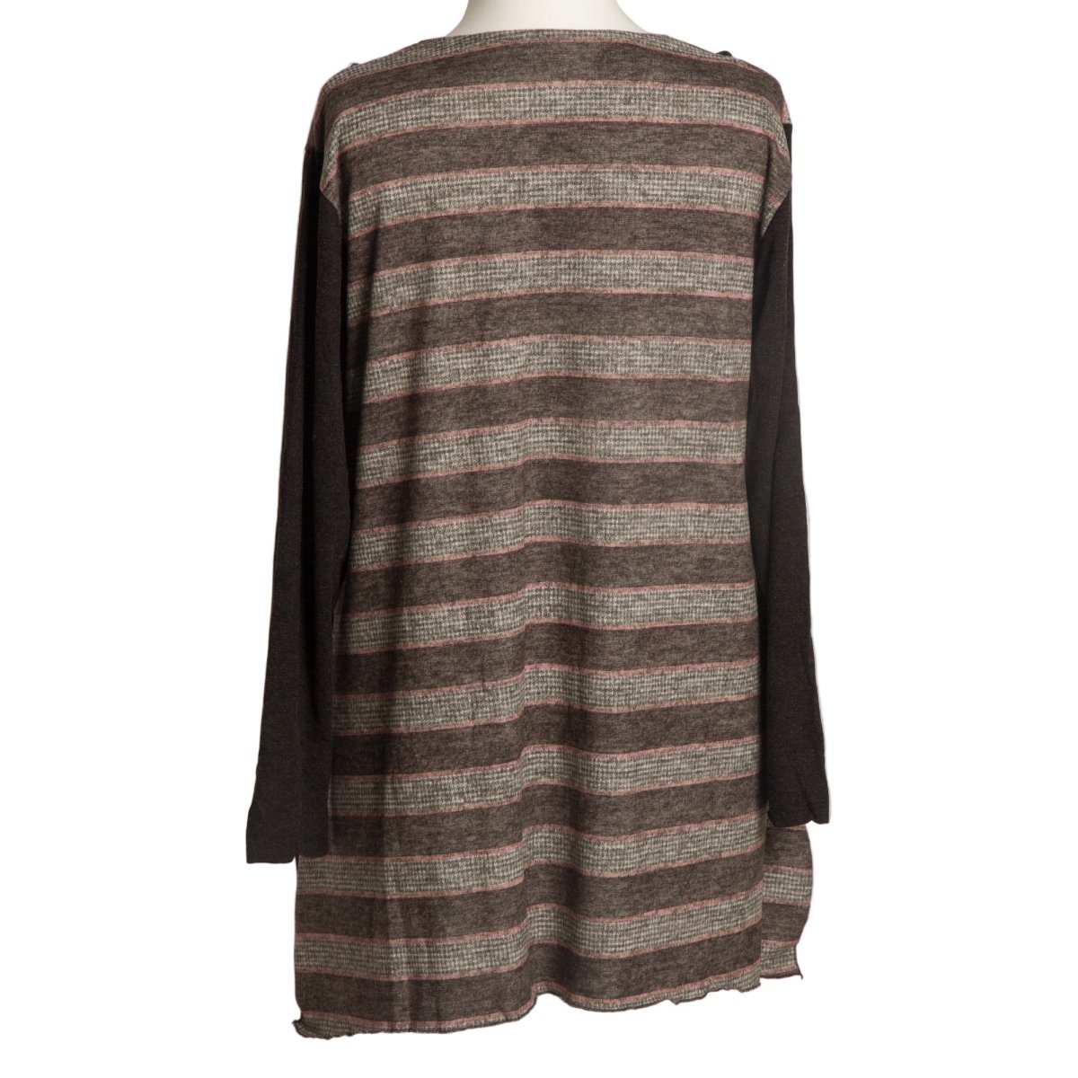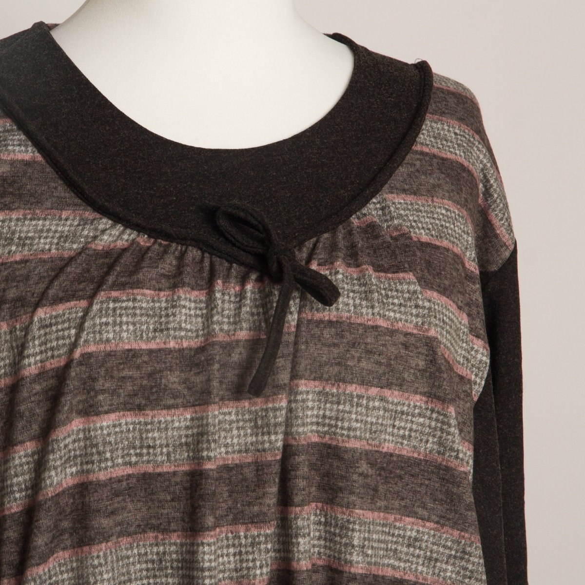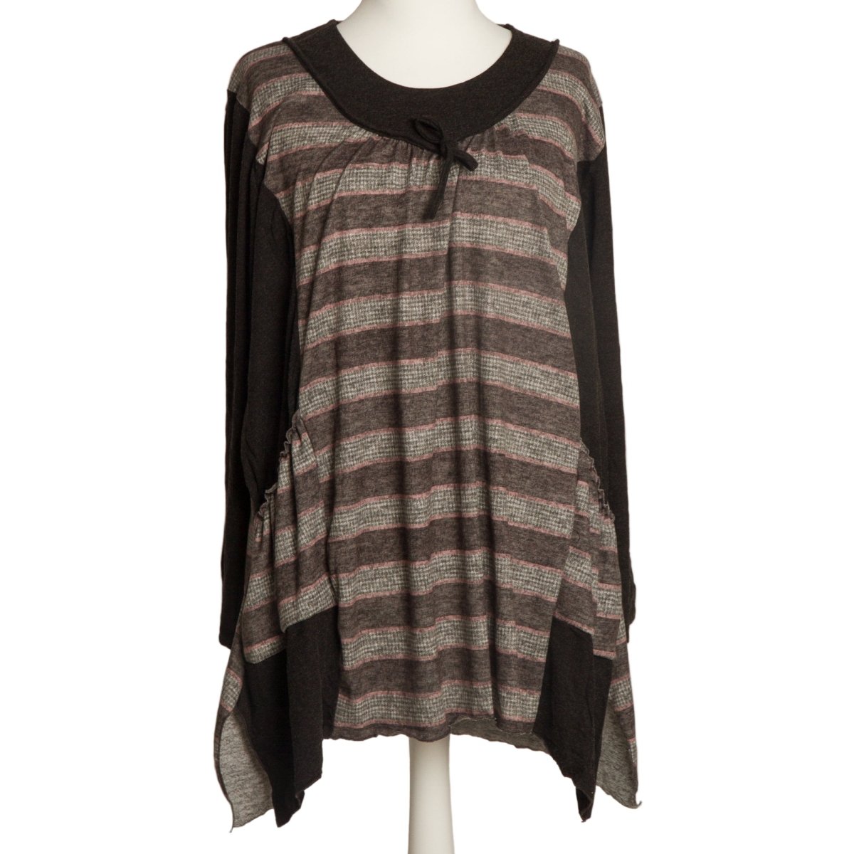 Еластична и удобна туника в големи размери, съчетаваща практичност и стил. Изработена от висококачествена вискоза с еластан, моделът осигурява комфорт и лекота при носене. Разкроената кройка подчертава силуета, без да прилепва, а кръглото деколте е акцентирано с връзки за допълнителен ефект. Джобчетата добавят практична нотка, която прави туниката подходяща както за ежедневието, така и за официални поводи. Многоцветният десен носи настроение и свежест през есенно-зимния сезон.