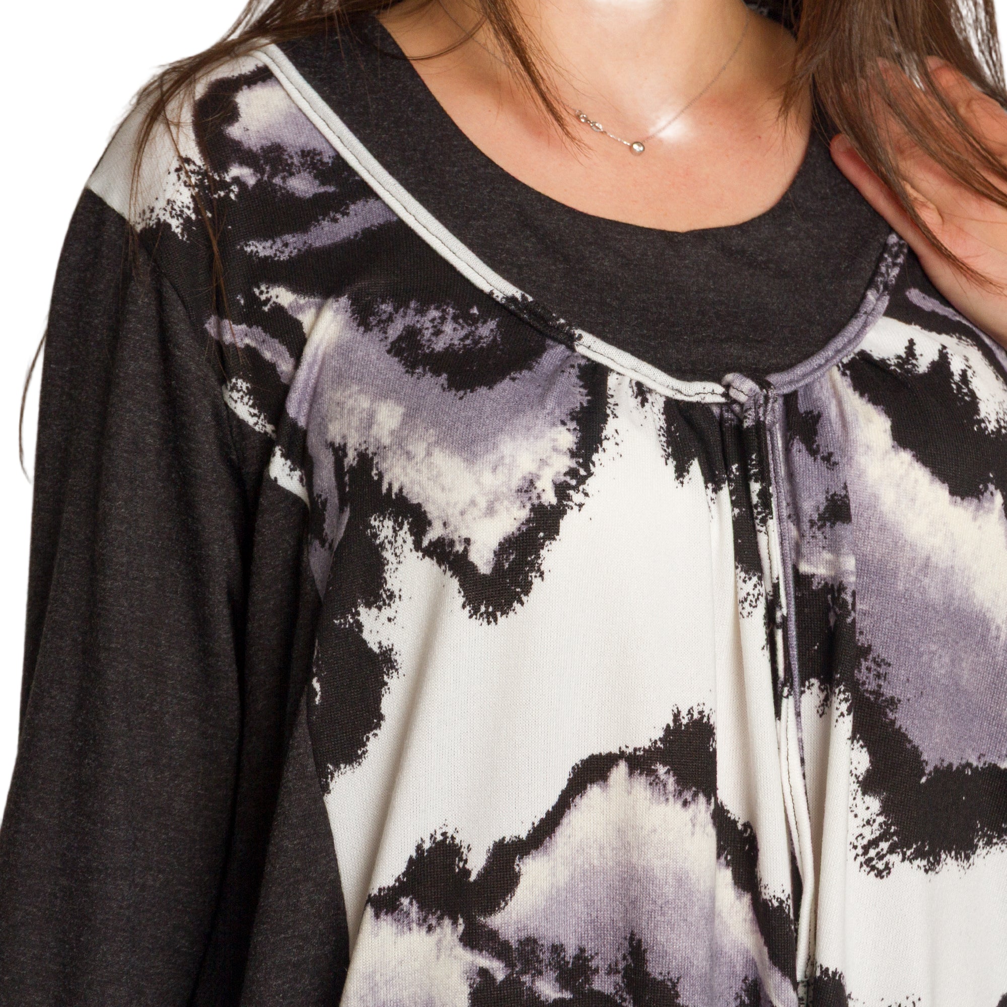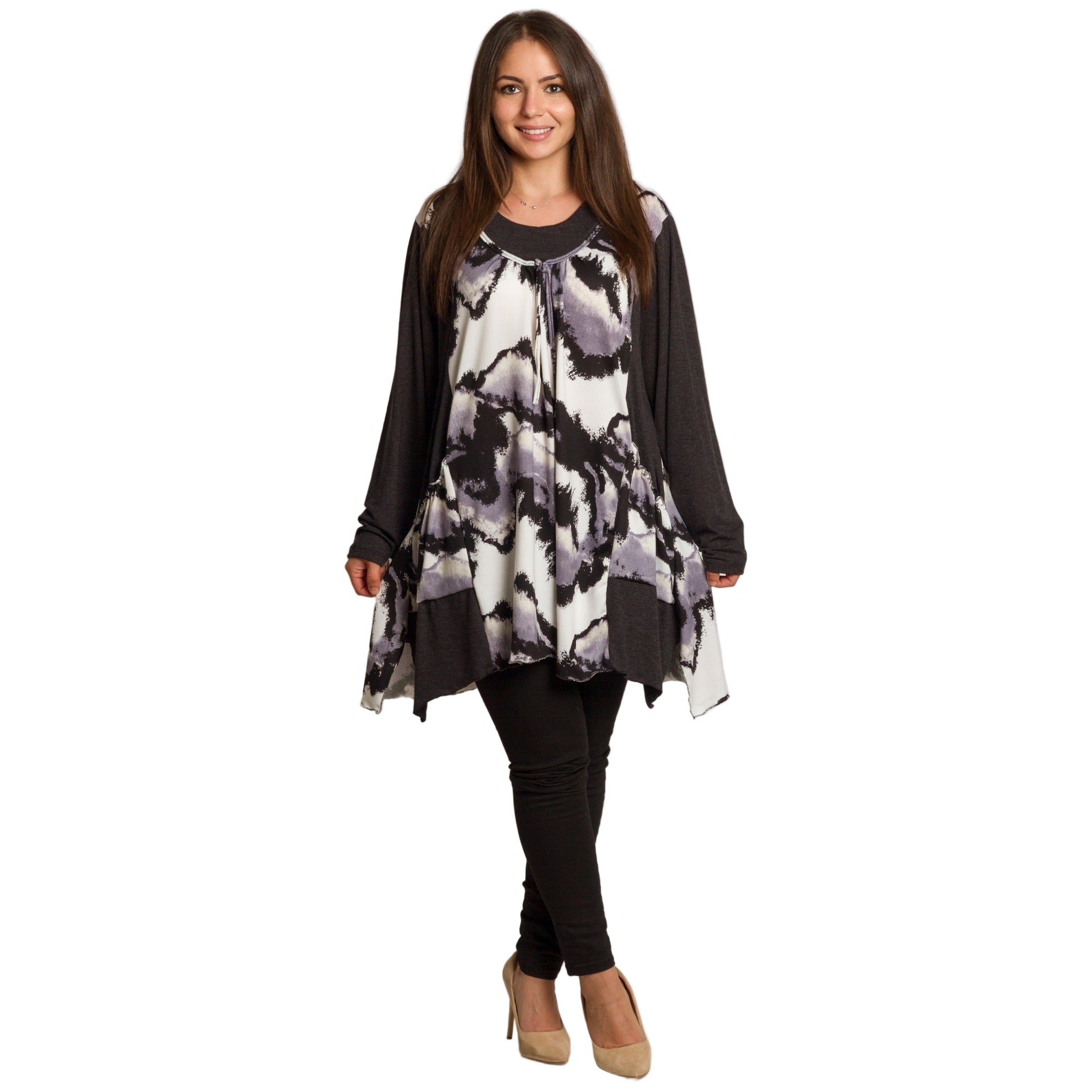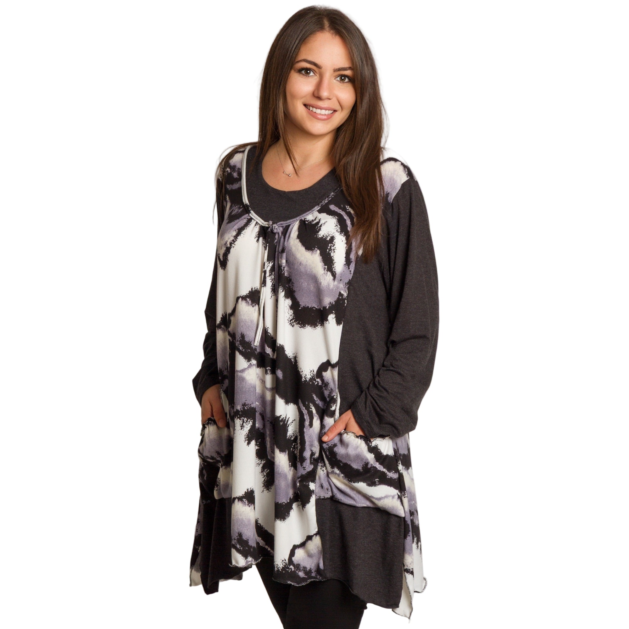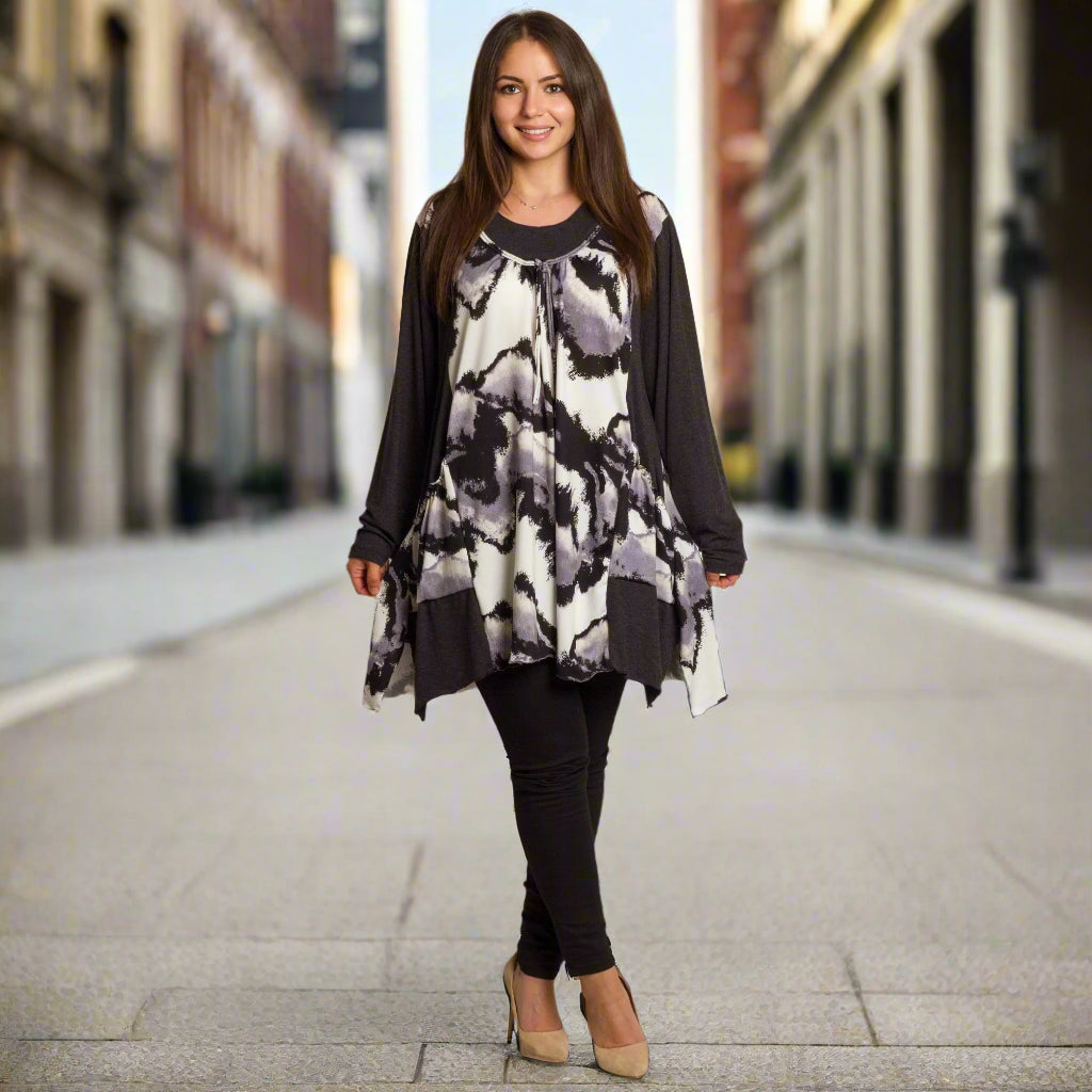 Елегантна и модерна туника с абстрактен десен в черно, бяло и лилаво, създадена да придава стил и комфорт. Изработена е от мека и еластична материя, която осигурява удобство и свобода на движение. Моделът е с кръгло деколте, декорирано с връзки, и дълги ръкави в едноцветен тъмен цвят за красив контраст. Страничните джобове добавят практичност, а разкроената кройка подчертава женствеността, като същевременно прикрива зоните, които искате да остават дискретни. Подходяща е както за ежедневни разходки, така и за по-елегантни поводи през есенно-зимния сезон.