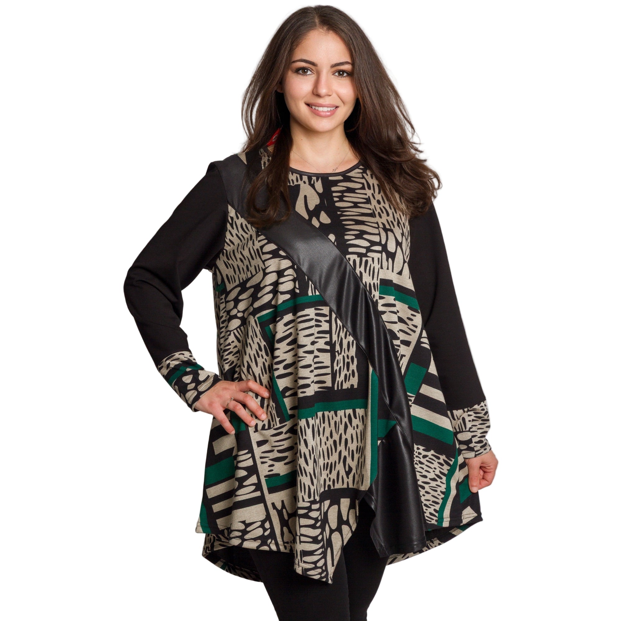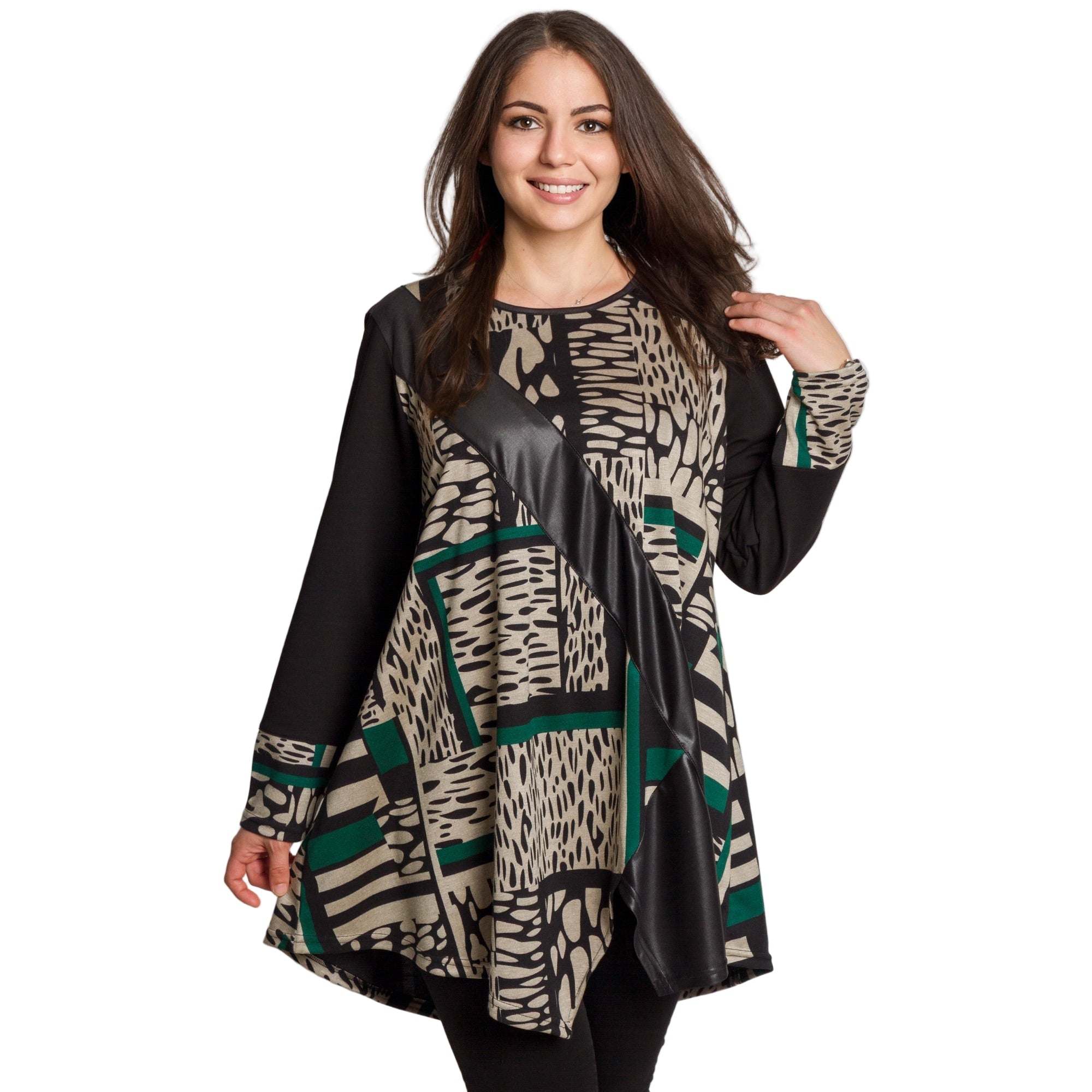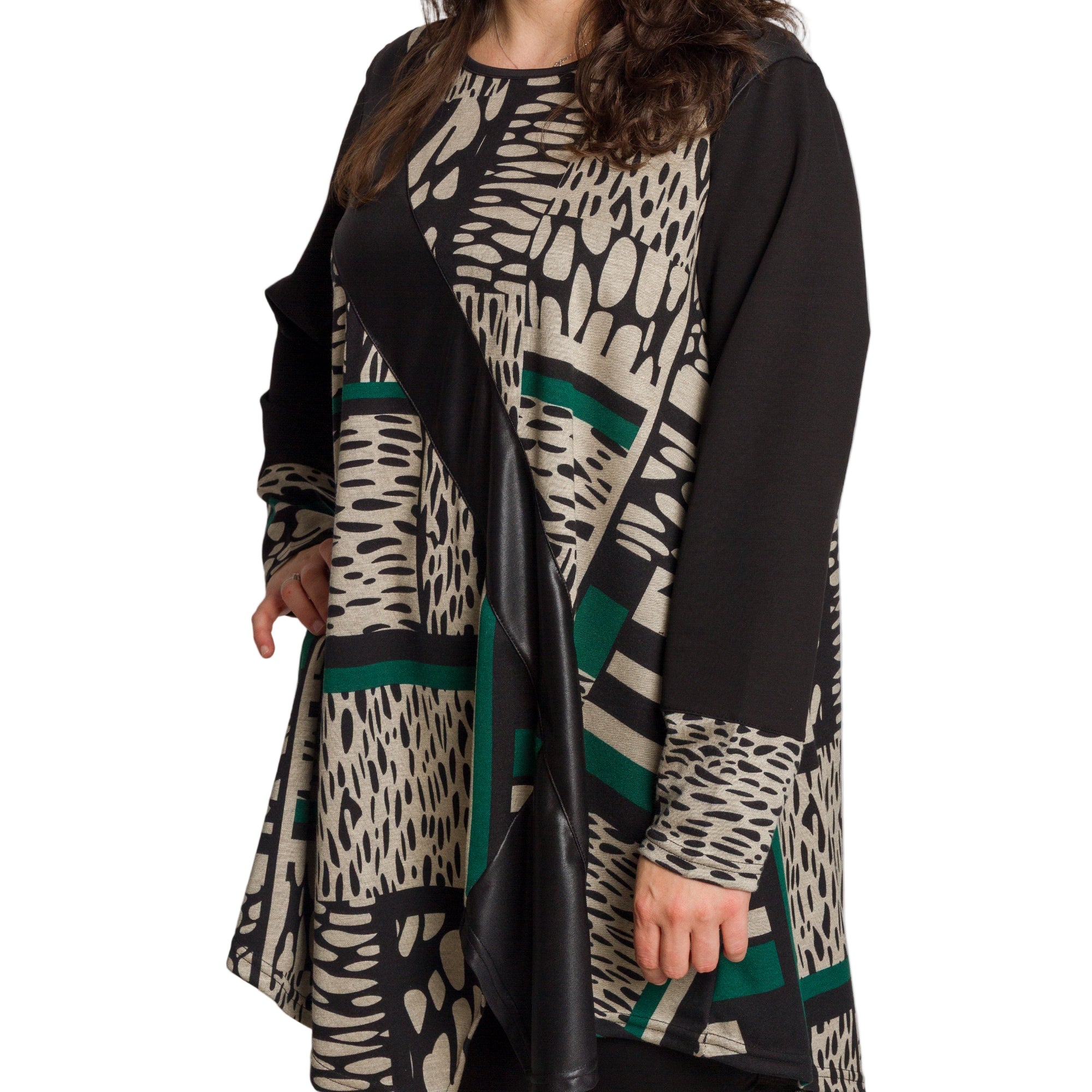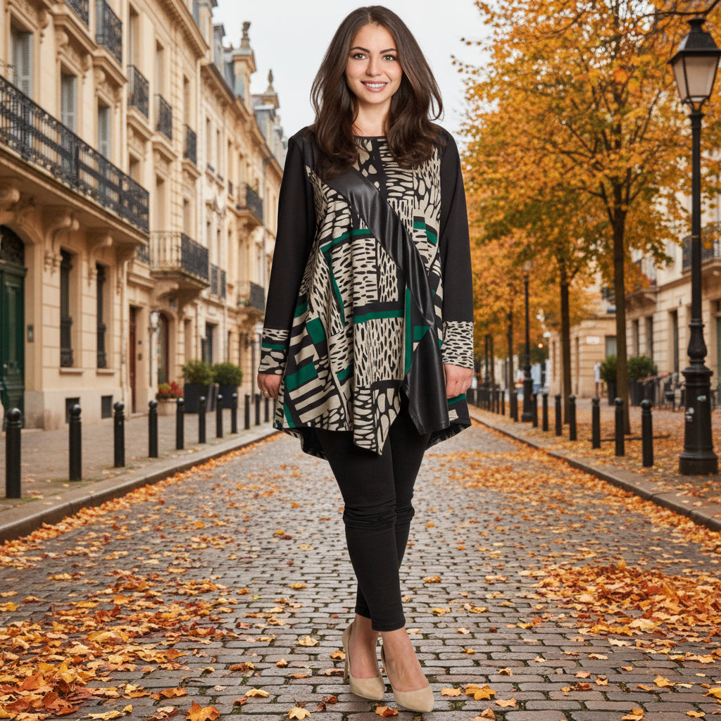 Модерна туника с абстрактен графичен десен. Акцентът е декоративната диагонална лента от еко кожа, която придава изискан и съвременен вид. Изработена от мека и еластична материя с високо съдържание на полиамид, туниката осигурява удобство и комфорт при носене. Свободната кройка и обло деколте подчертават женствеността и прикриват деликатно формите, правейки модела подходящ за ежедневие и официални поводи през есенно-зимния сезон.