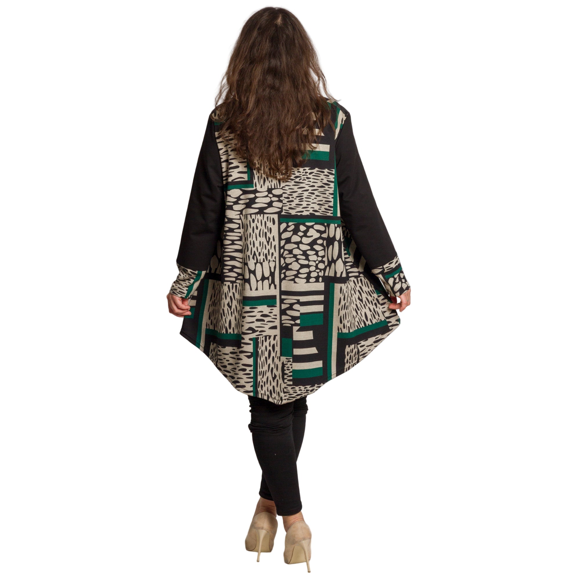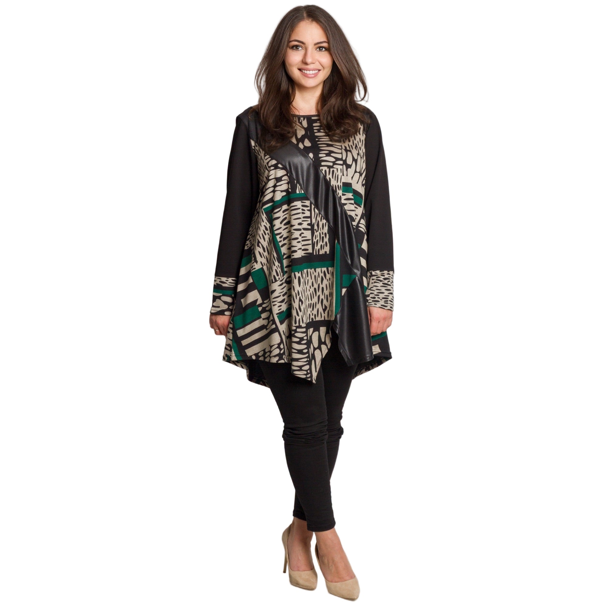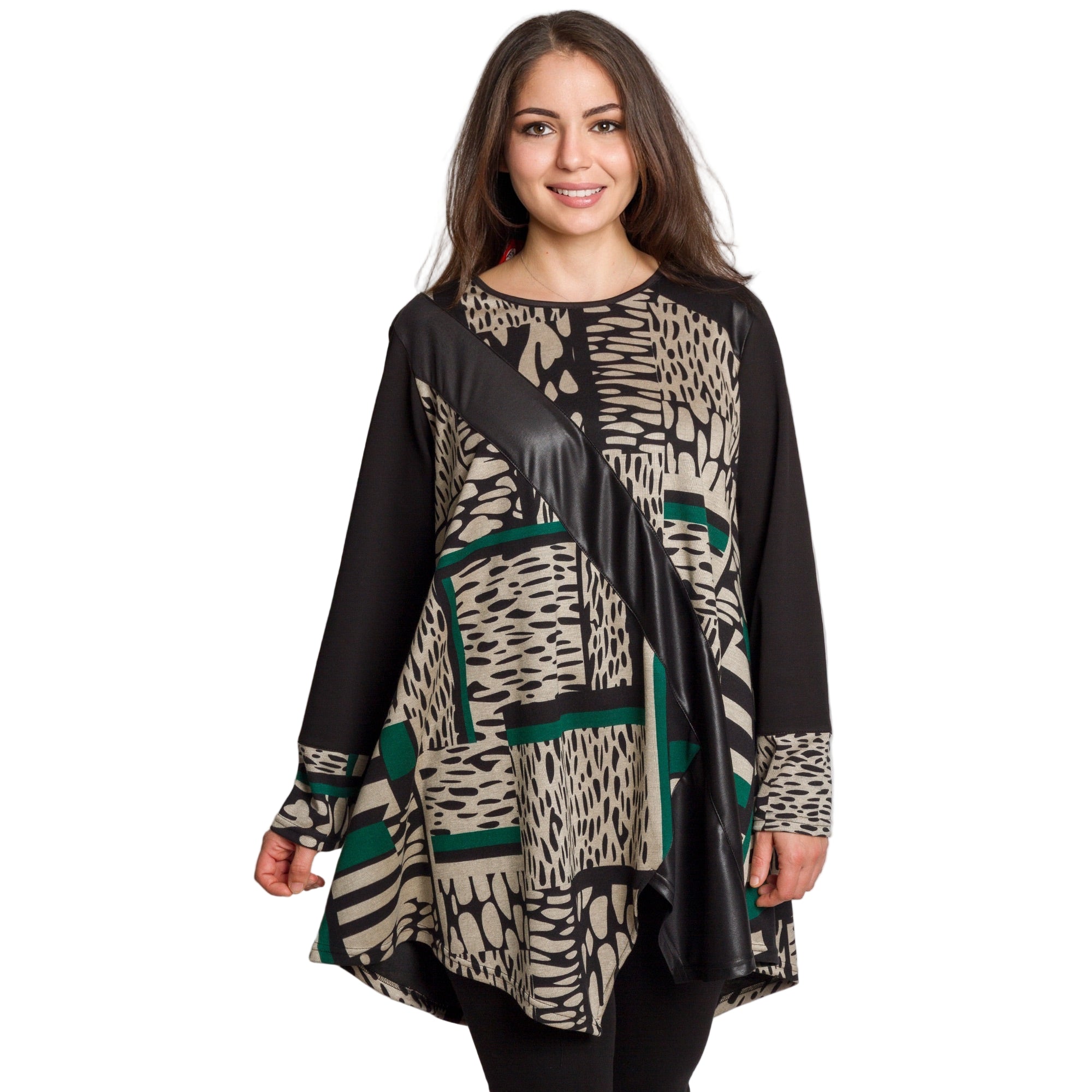 Модерна туника с абстрактен графичен десен. Акцентът е декоративната диагонална лента от еко кожа, която придава изискан и съвременен вид. Изработена от мека и еластична материя с високо съдържание на полиамид, туниката осигурява удобство и комфорт при носене. Свободната кройка и обло деколте подчертават женствеността и прикриват деликатно формите, правейки модела подходящ за ежедневие и официални поводи през есенно-зимния сезон.