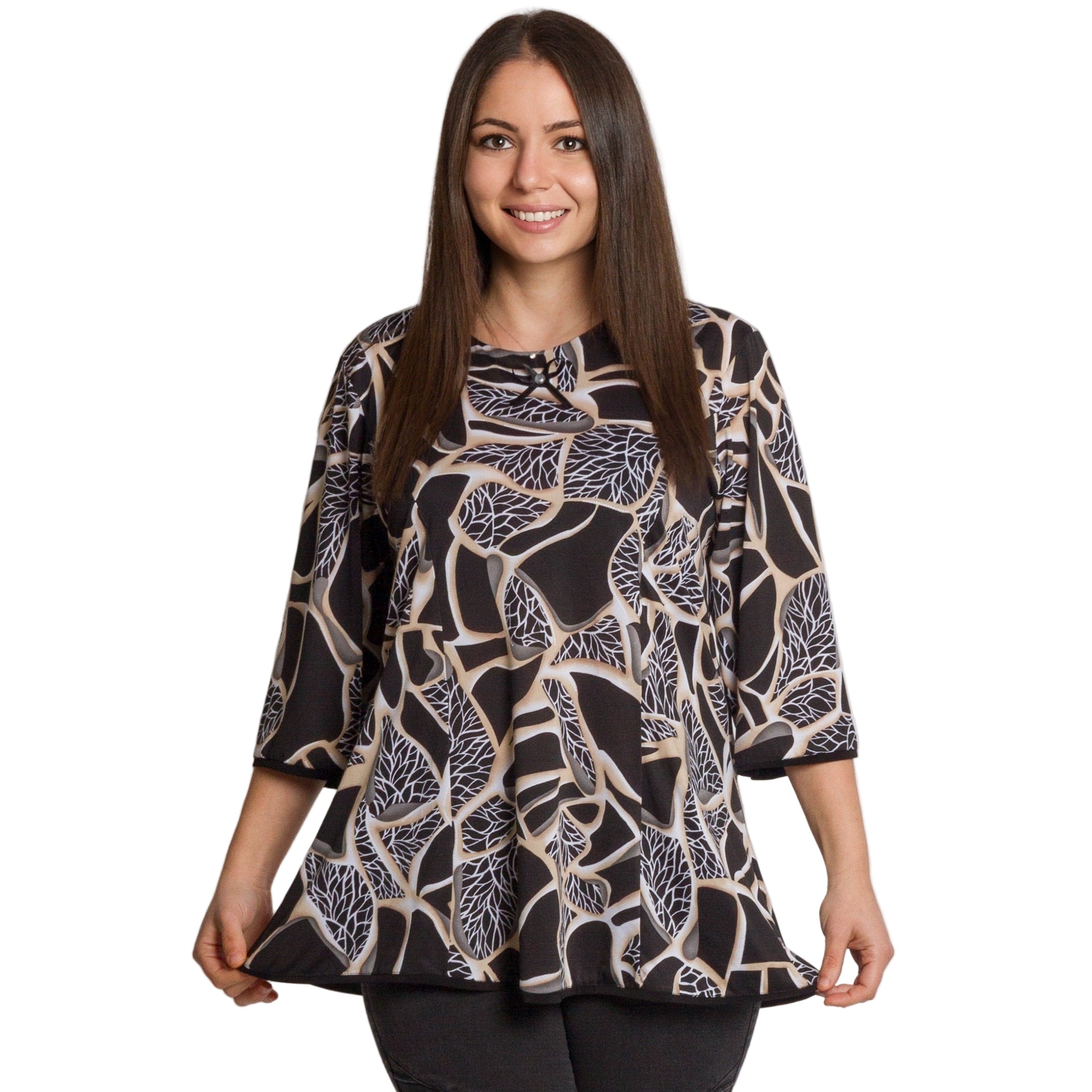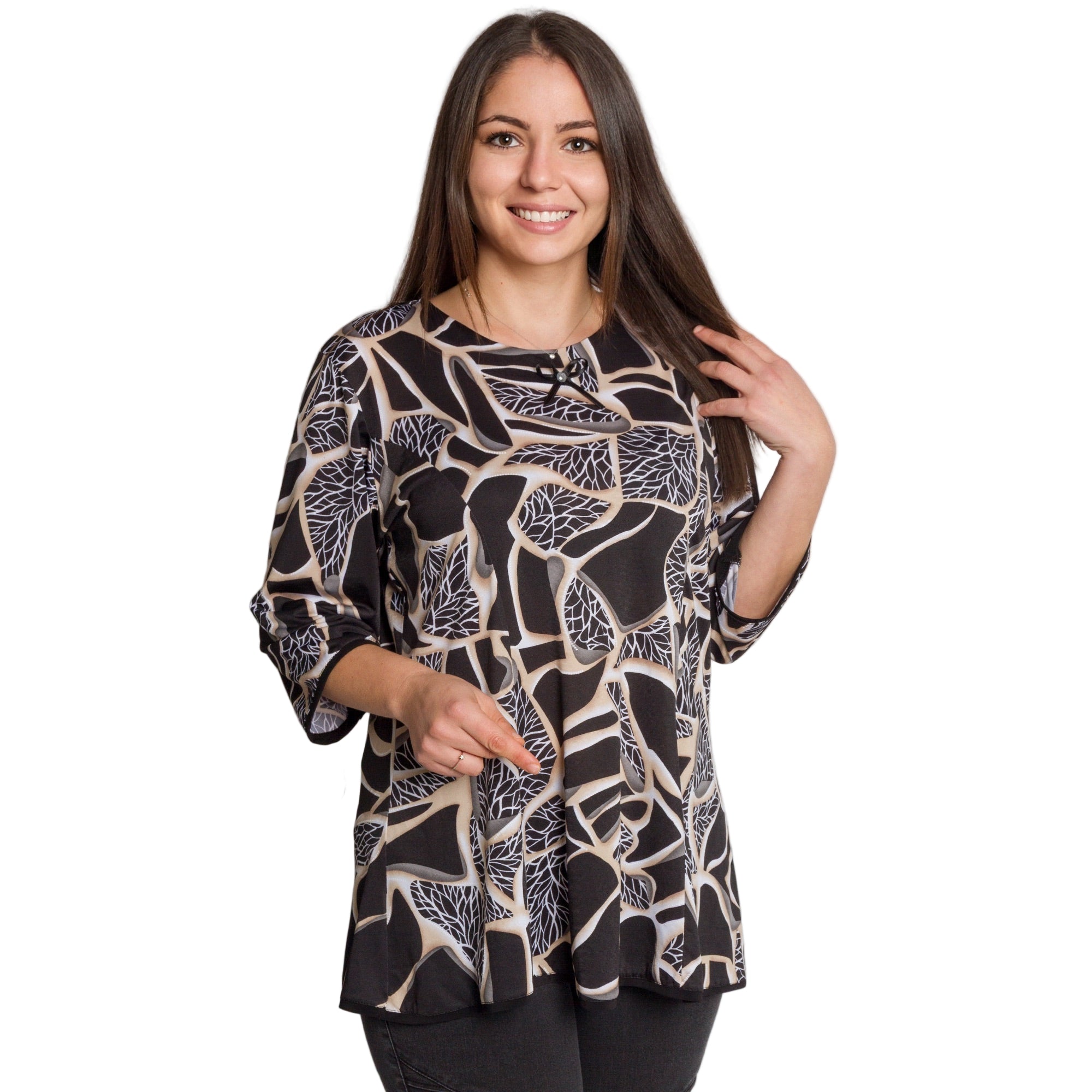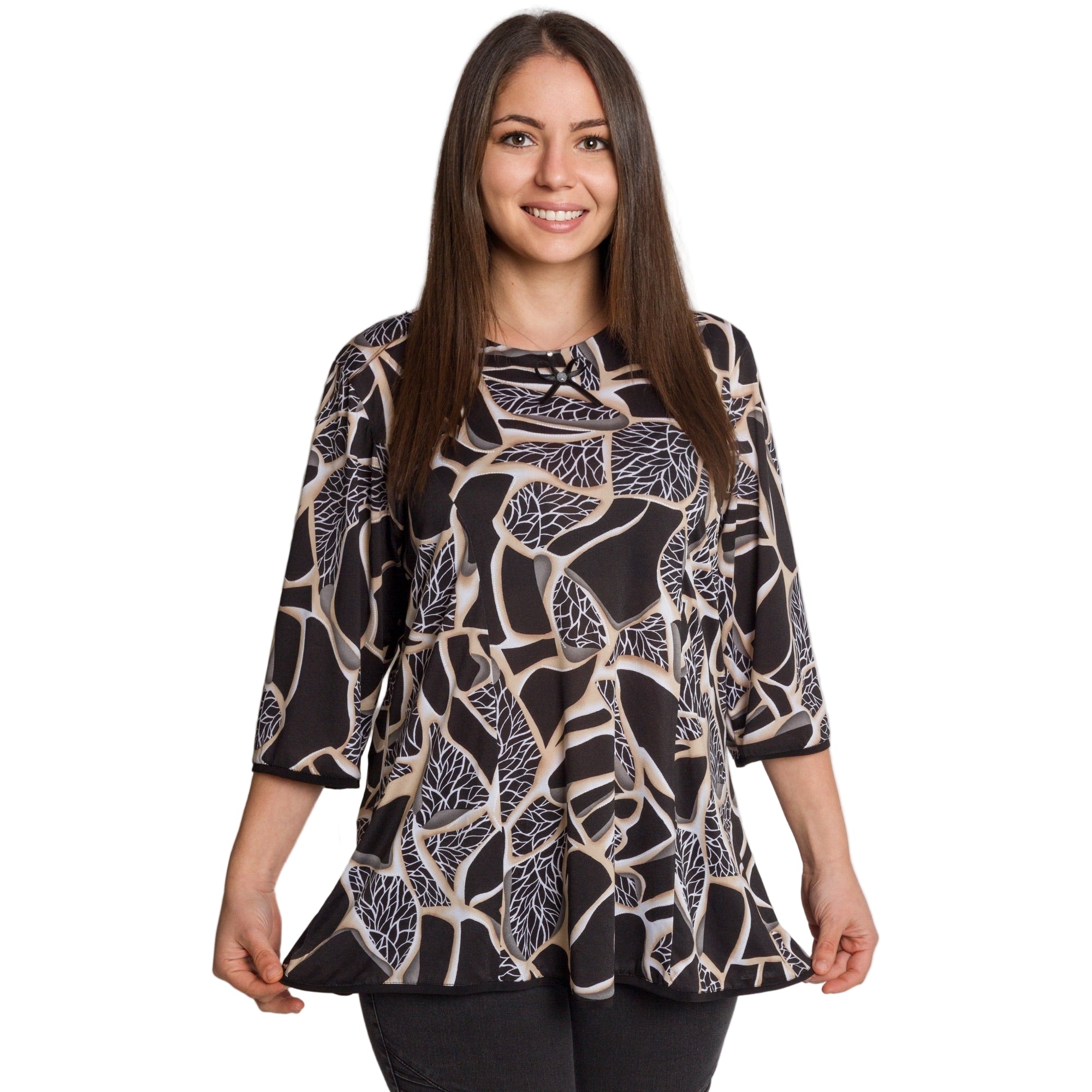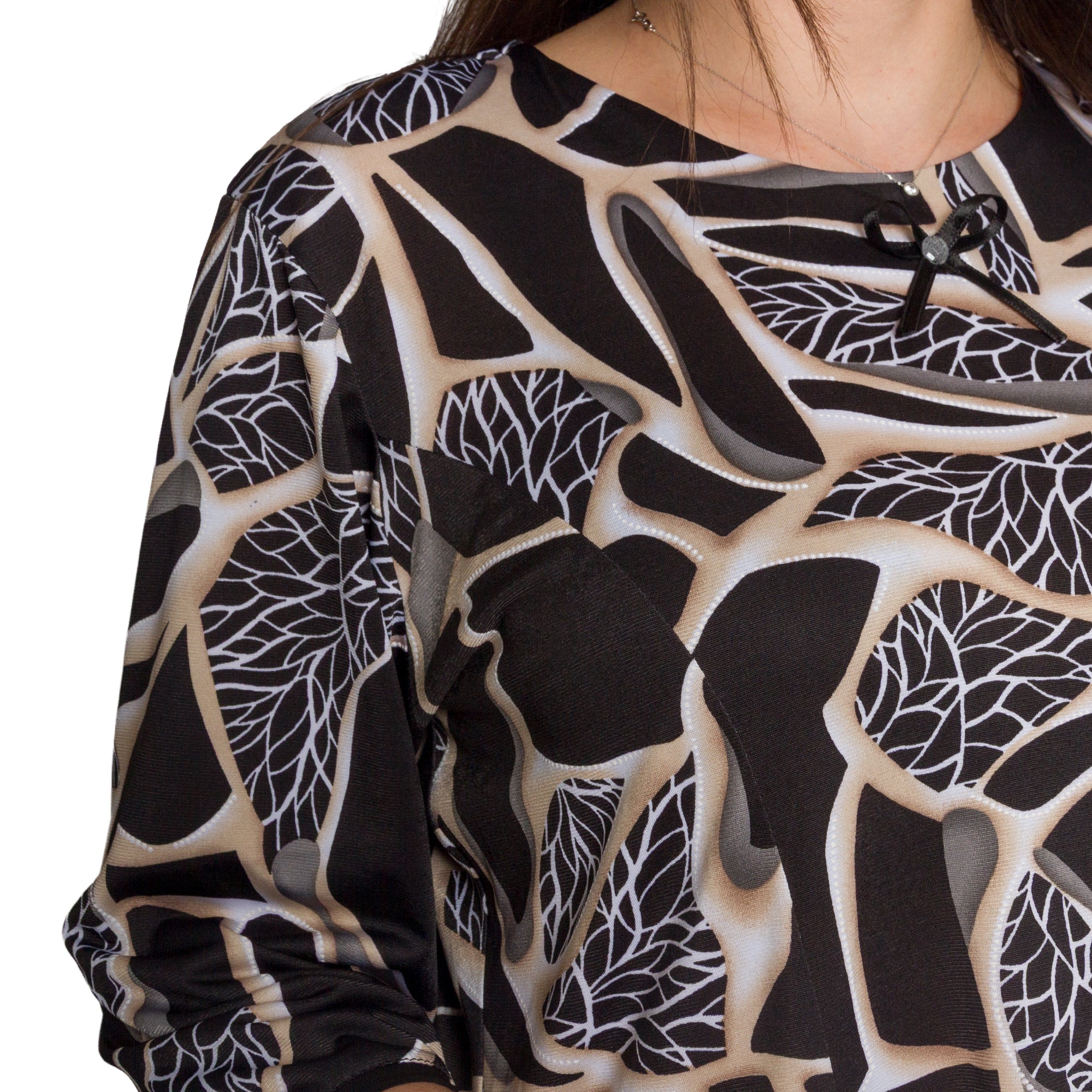 Елегантна туника с разкроена кройка и ефектен абстрактен десен в черно, бежово и бяло. Материята е лека, еластична и приятна за носене, което я прави идеален избор за ежедневието и елегантни визии през есенно-зимния сезон. Облото деколте е допълнено с декоративна черна панделка – малък, но стилен акцент, който подчертава женствеността. Ръкавите са 3/4 дължина, удобни и подходящи за всякакви комбинации с панталони или клин.