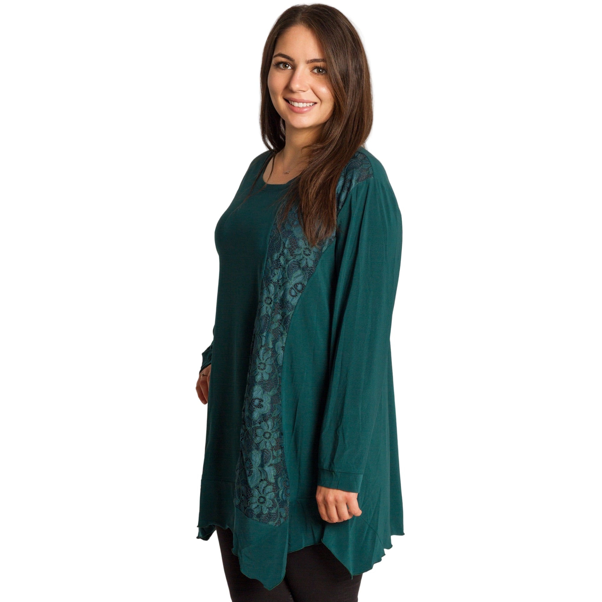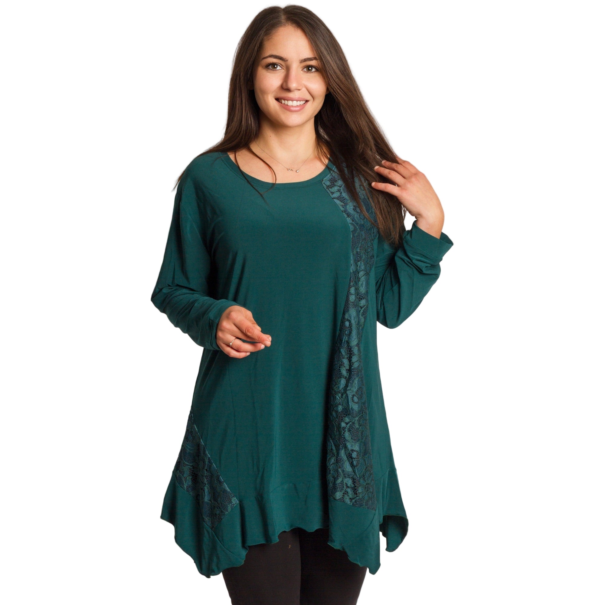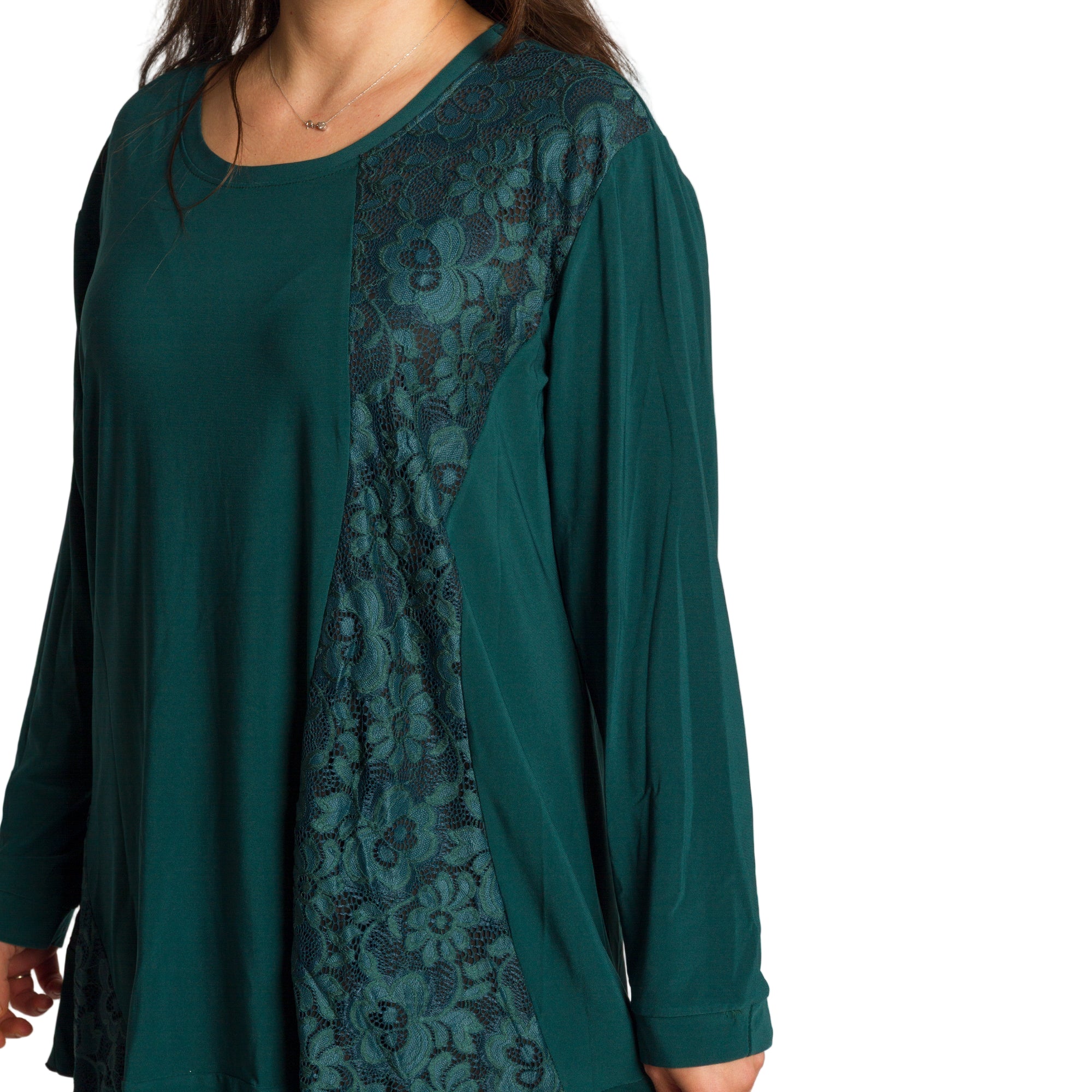 Елегантна и удобна туника в свеж зелен цвят, изработена от мека и еластична материя. Моделът е с разкроена кройка, която пада свободно по тялото и осигурява комфорт през целия ден. Красивите дантелени акценти с флорален мотив отпред придават женственост и стил, подходящи както за ежедневието, така и за официални поводи. Кръглото деколте и дългите ръкави правят туниката практичен избор за есенно-зимния сезон.