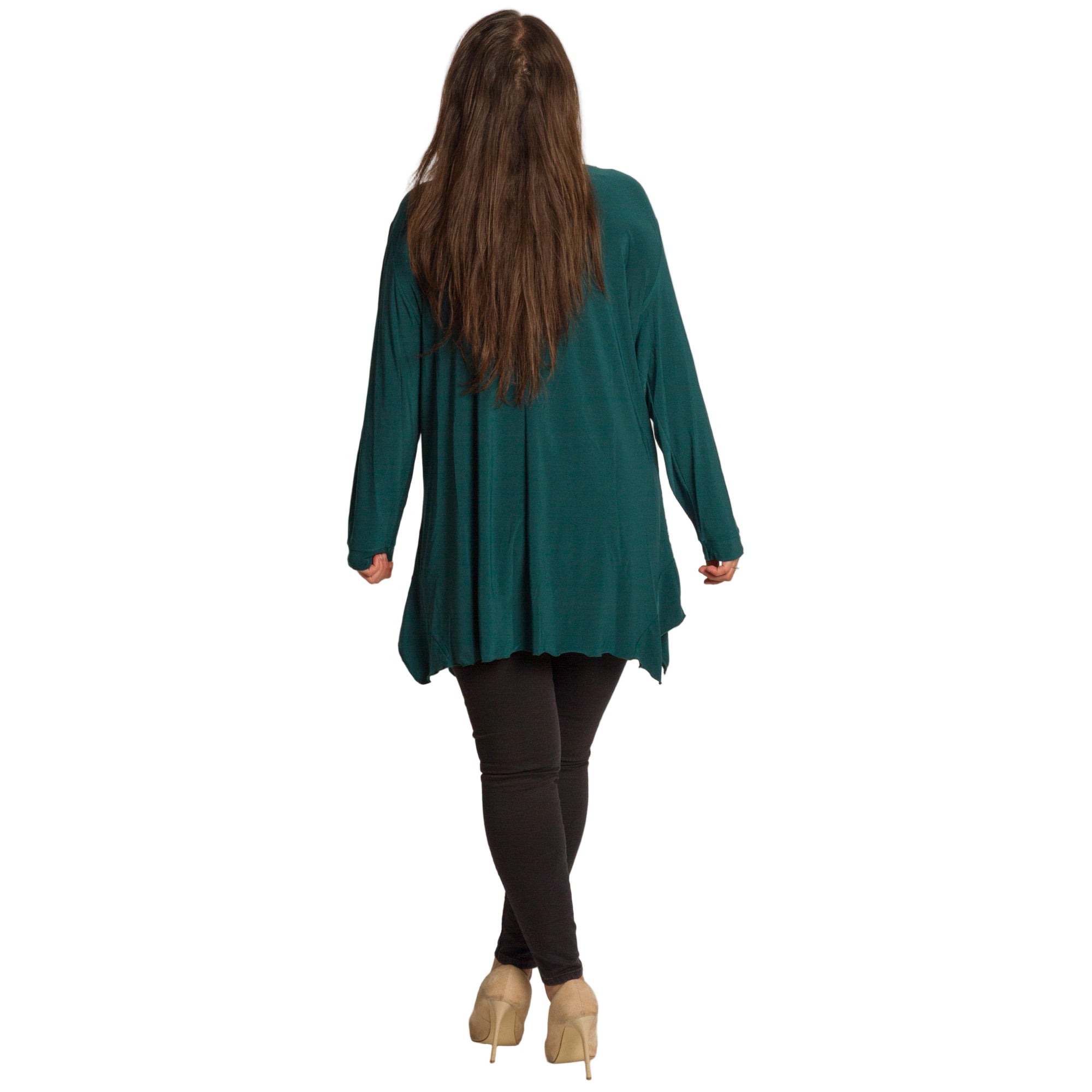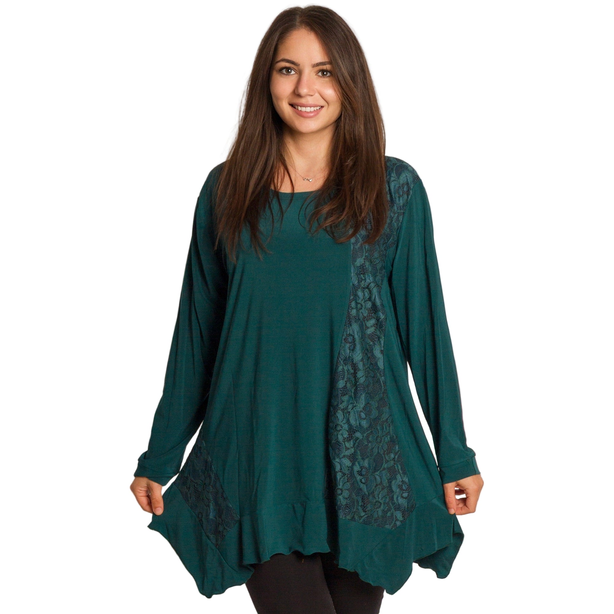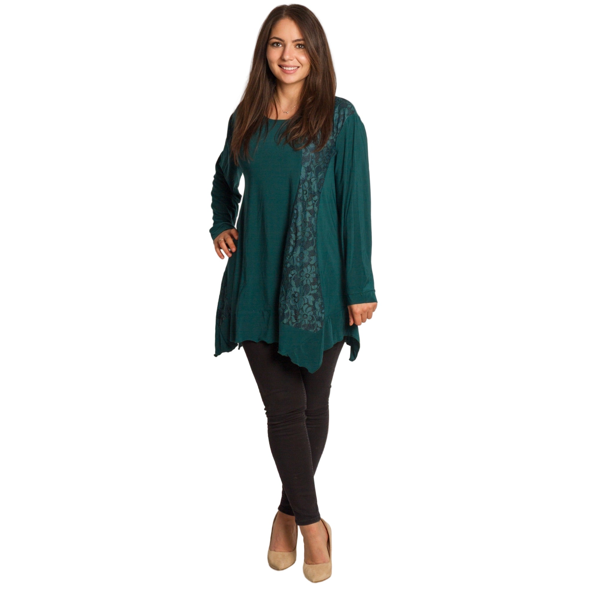 Елегантна и удобна туника в свеж зелен цвят, изработена от мека и еластична материя. Моделът е с разкроена кройка, която пада свободно по тялото и осигурява комфорт през целия ден. Красивите дантелени акценти с флорален мотив отпред придават женственост и стил, подходящи както за ежедневието, така и за официални поводи. Кръглото деколте и дългите ръкави правят туниката практичен избор за есенно-зимния сезон.