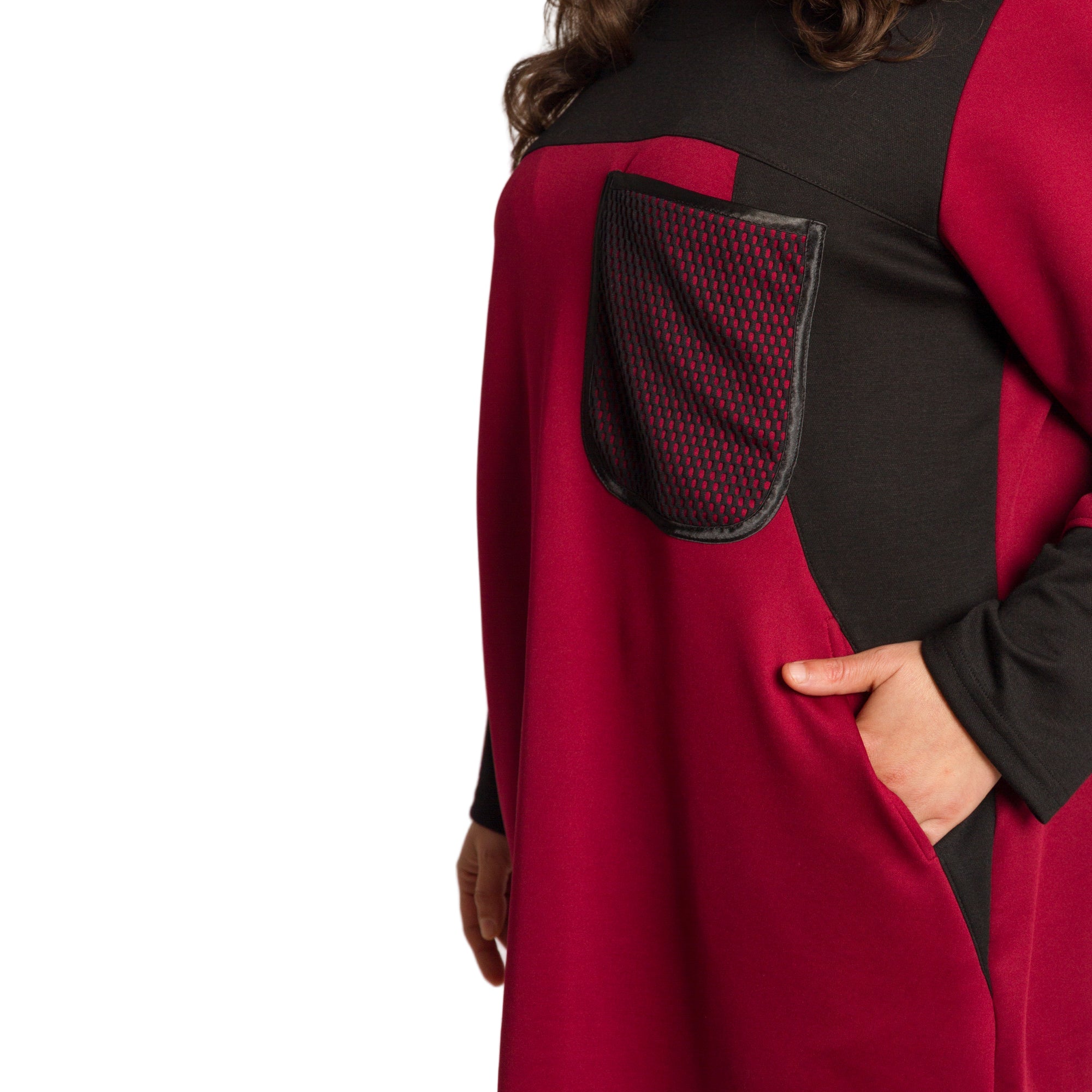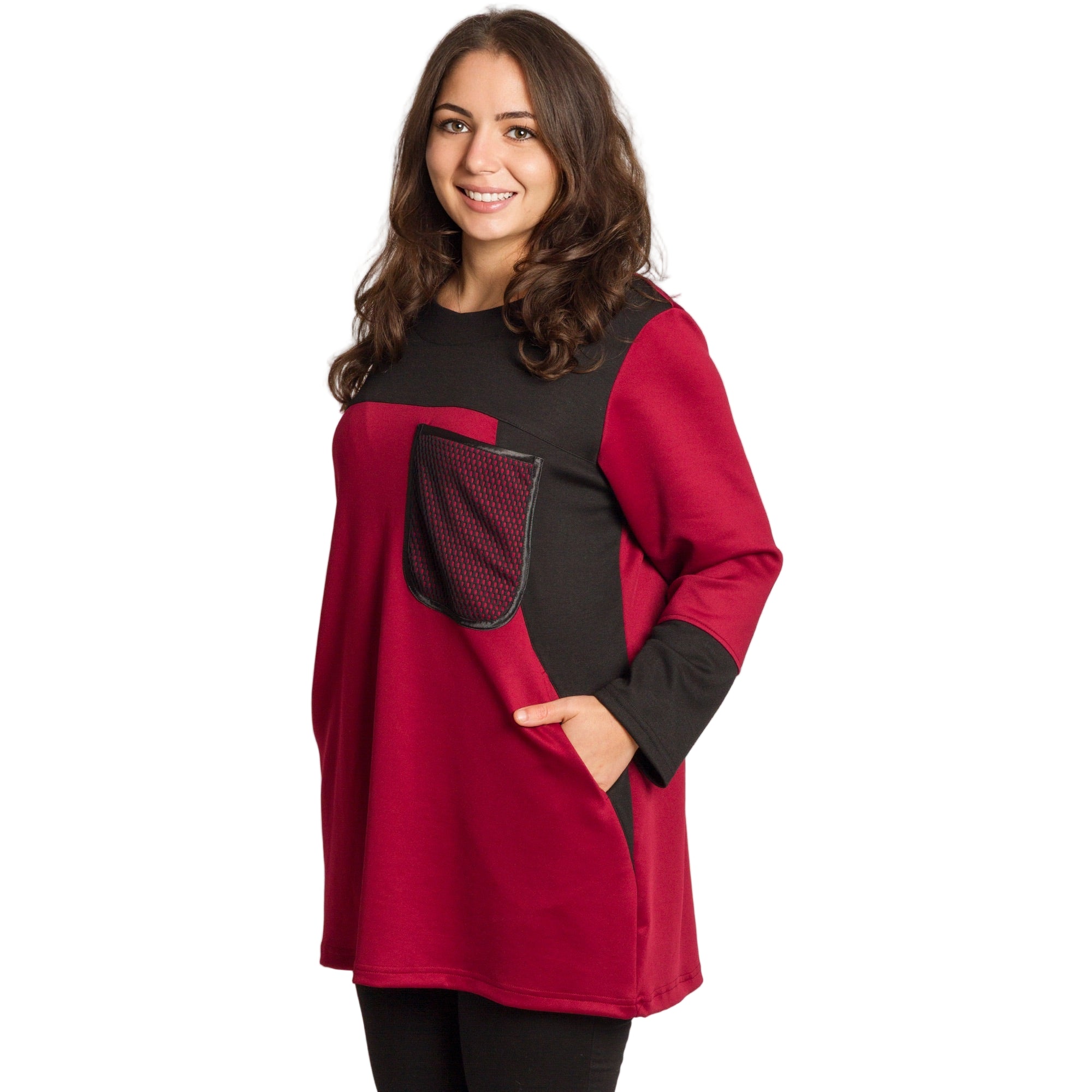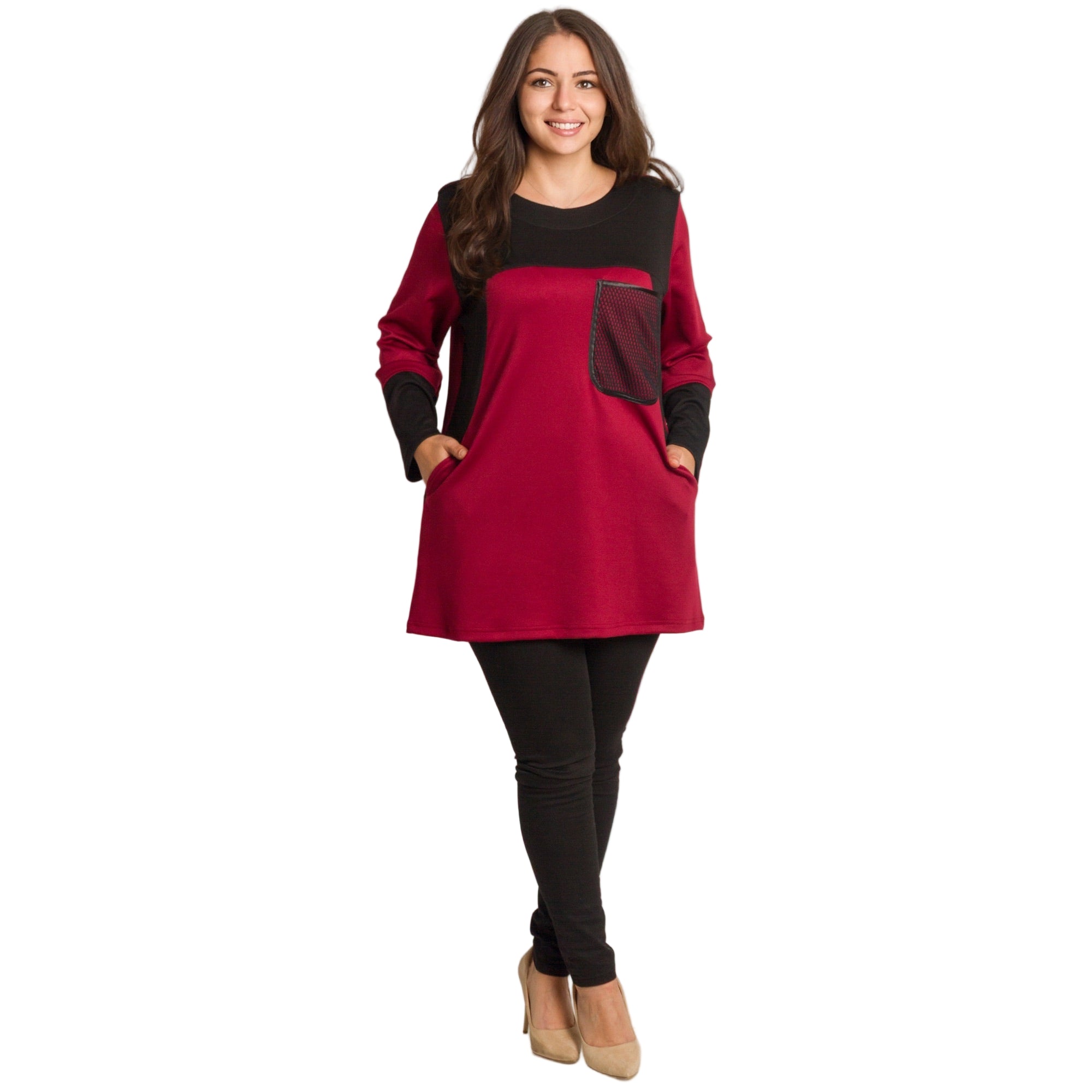 Модерна дамска туника в бордо с ефектен контрастен дизайн. Горната част и ръкавите са в черно, което визуално подчертава фигурата и създава елегантен силует. Моделът е с обло деколте, дълги ръкави и удобни странични джобове. Акцентът е големият преден джоб с декоративна мрежа и кант от еко кожа, придаващ стилен и съвременен вид. Материята е мека, еластична и приятна на допир — идеална за ежедневието и по-официални поводи през есенно-зимния сезон.