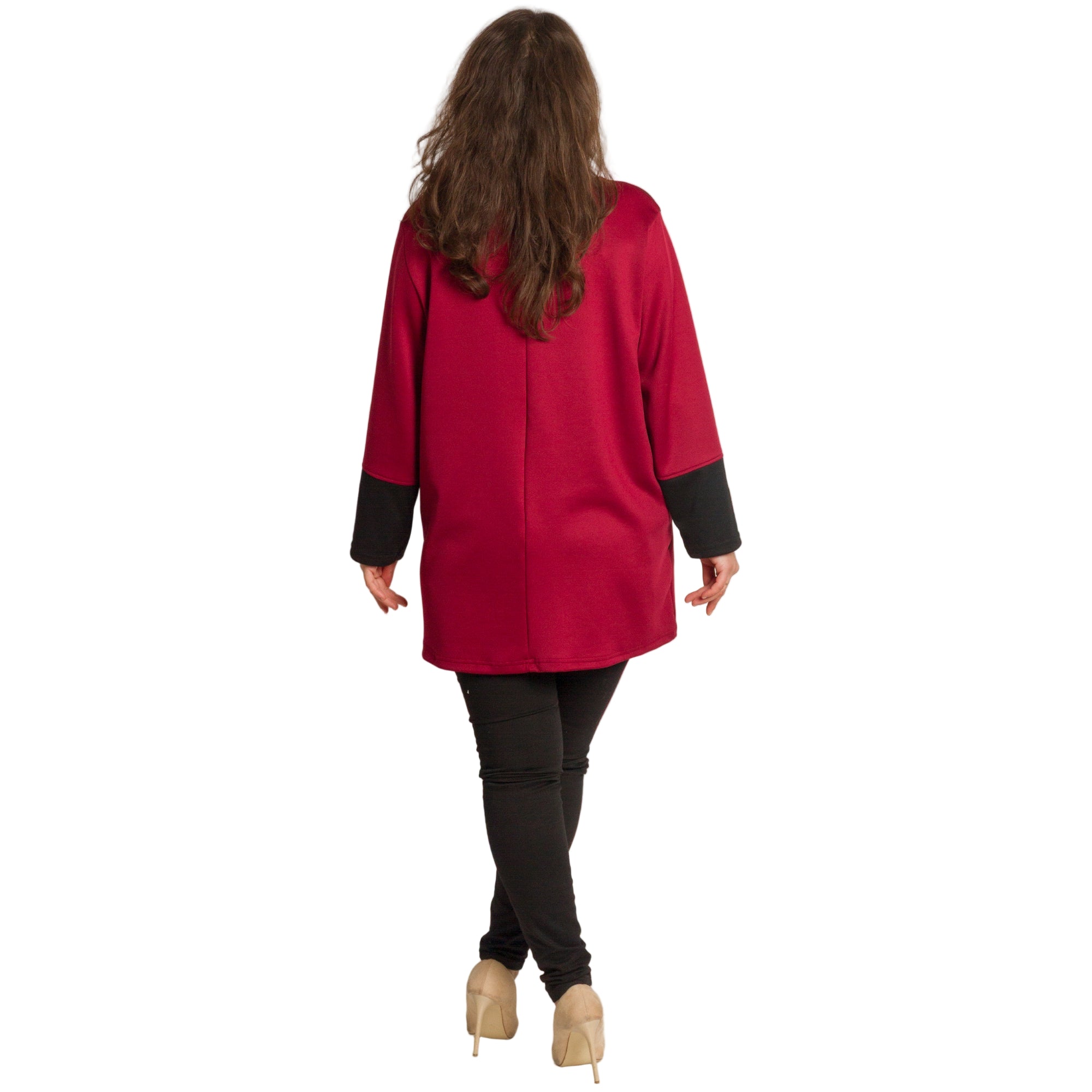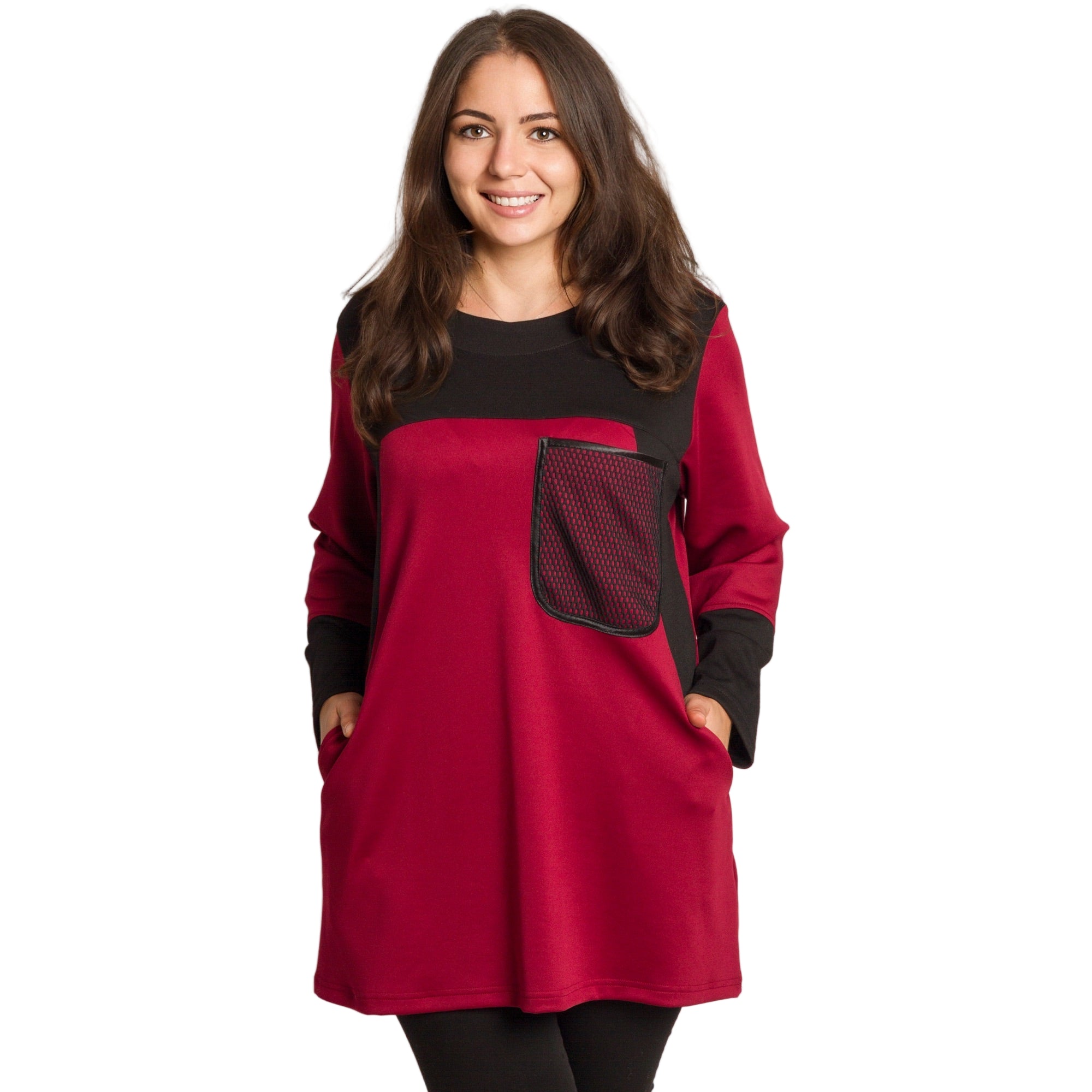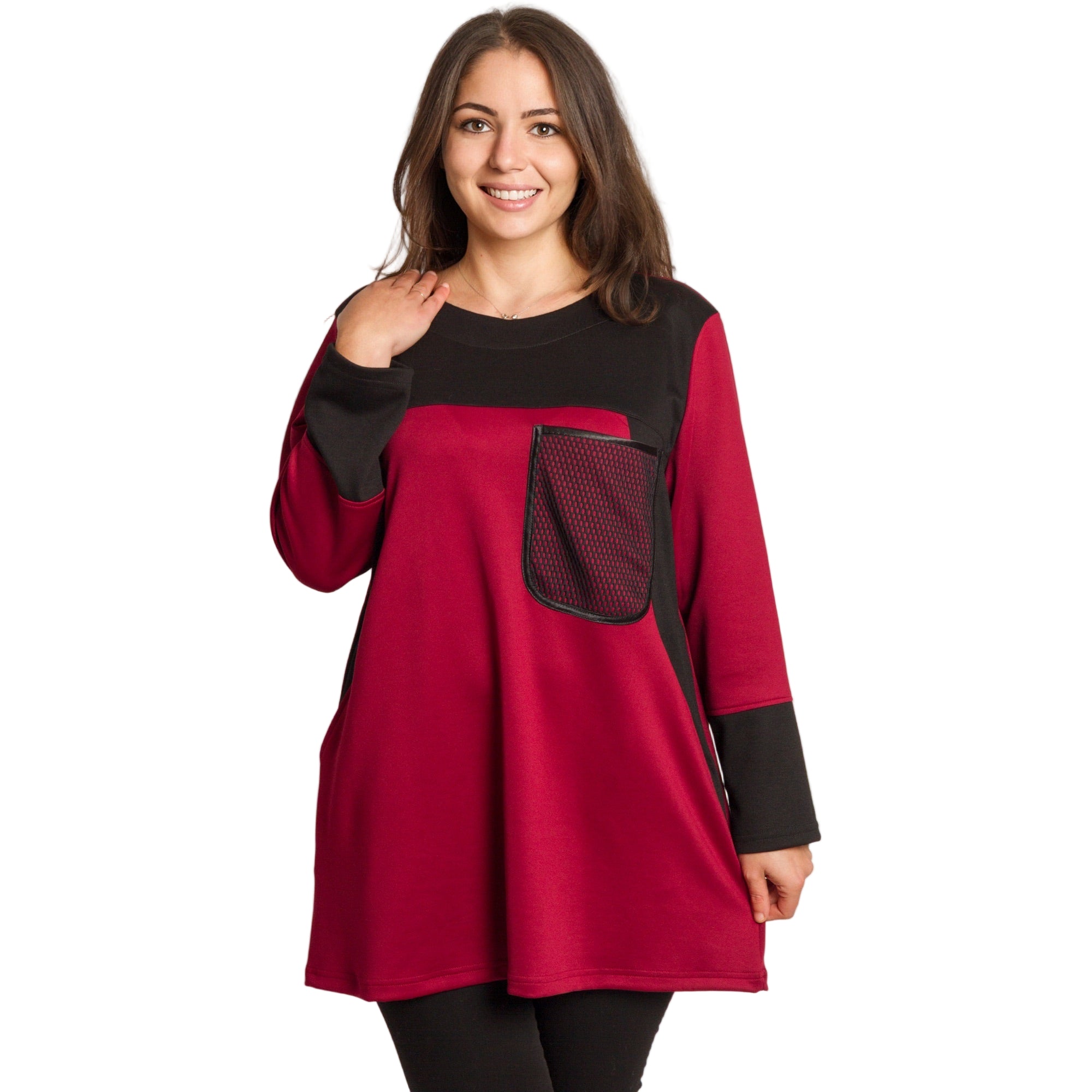 Модерна дамска туника в бордо с ефектен контрастен дизайн. Горната част и ръкавите са в черно, което визуално подчертава фигурата и създава елегантен силует. Моделът е с обло деколте, дълги ръкави и удобни странични джобове. Акцентът е големият преден джоб с декоративна мрежа и кант от еко кожа, придаващ стилен и съвременен вид. Материята е мека, еластична и приятна на допир — идеална за ежедневието и по-официални поводи през есенно-зимния сезон.