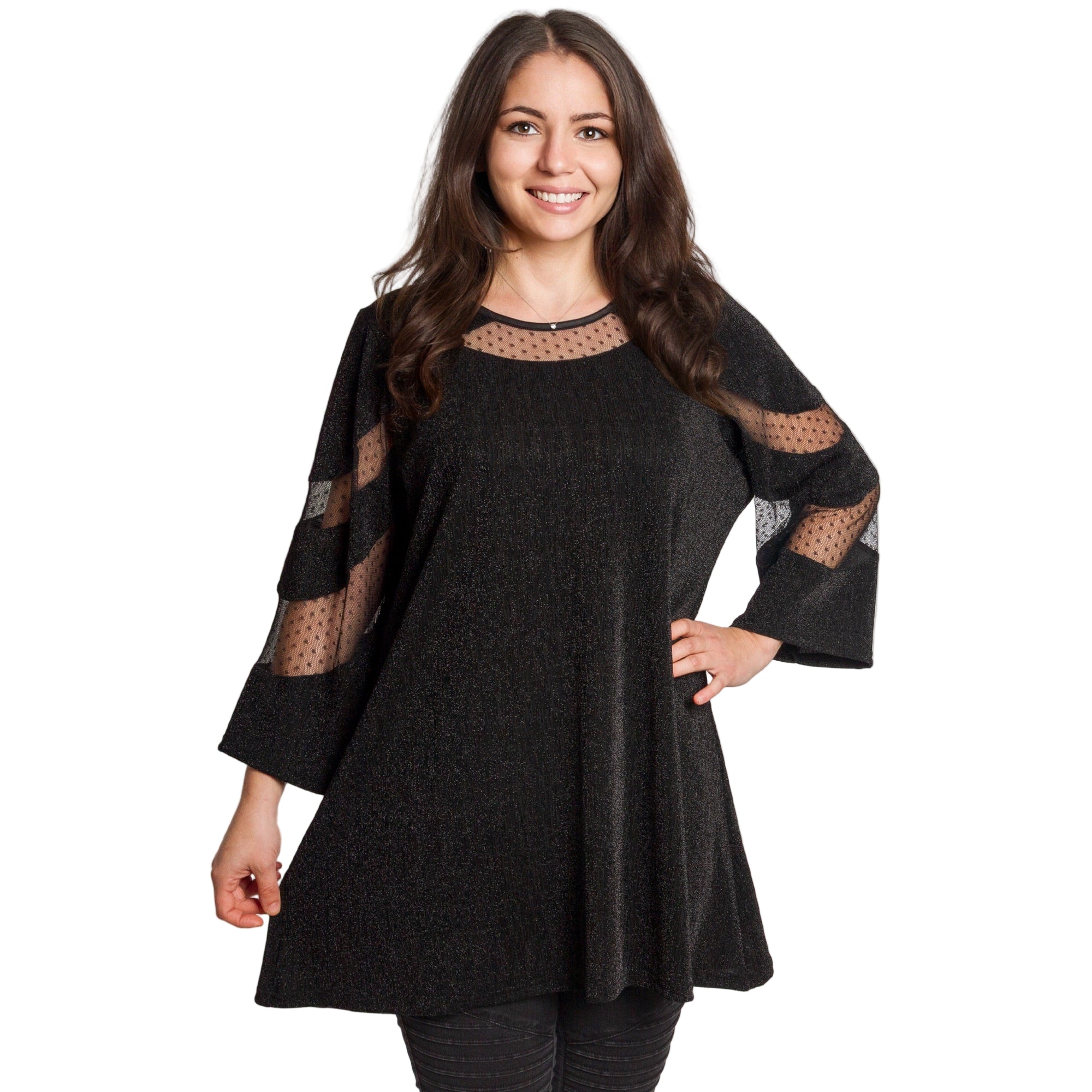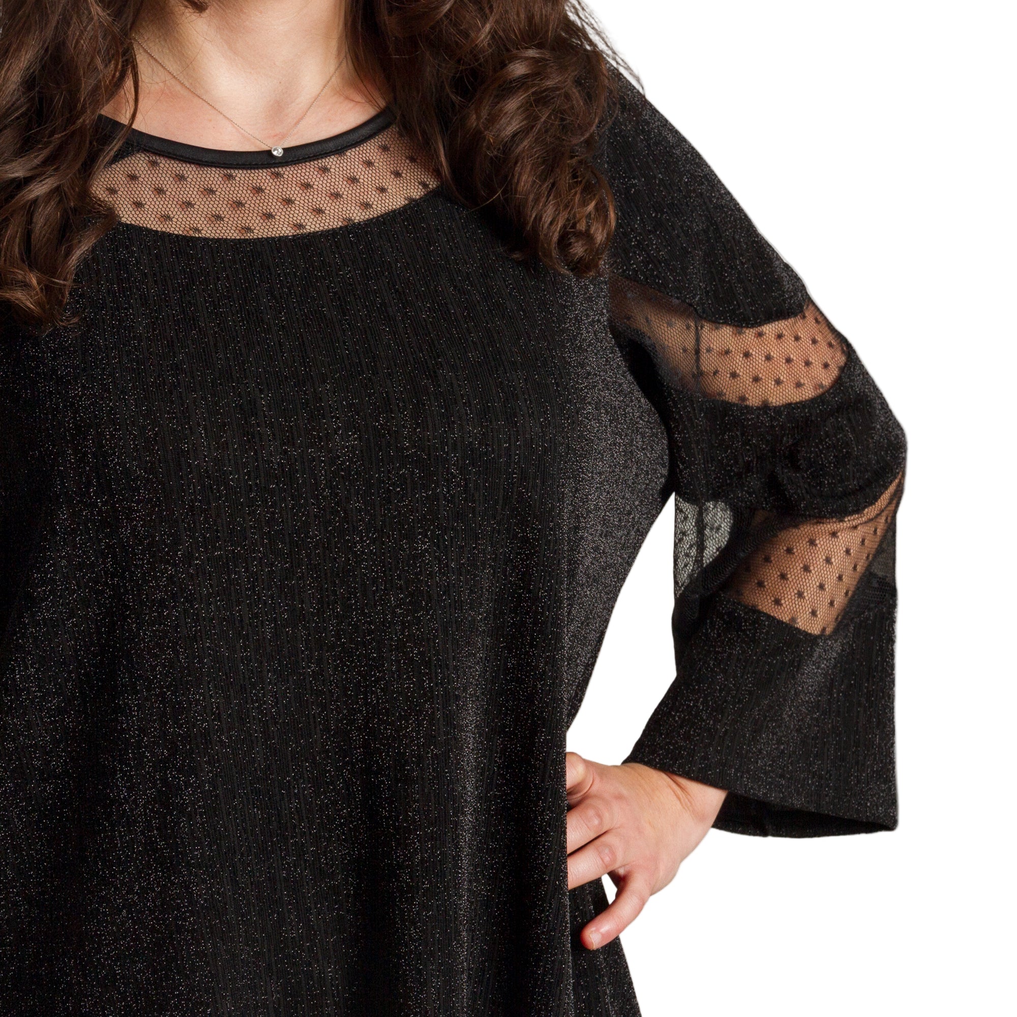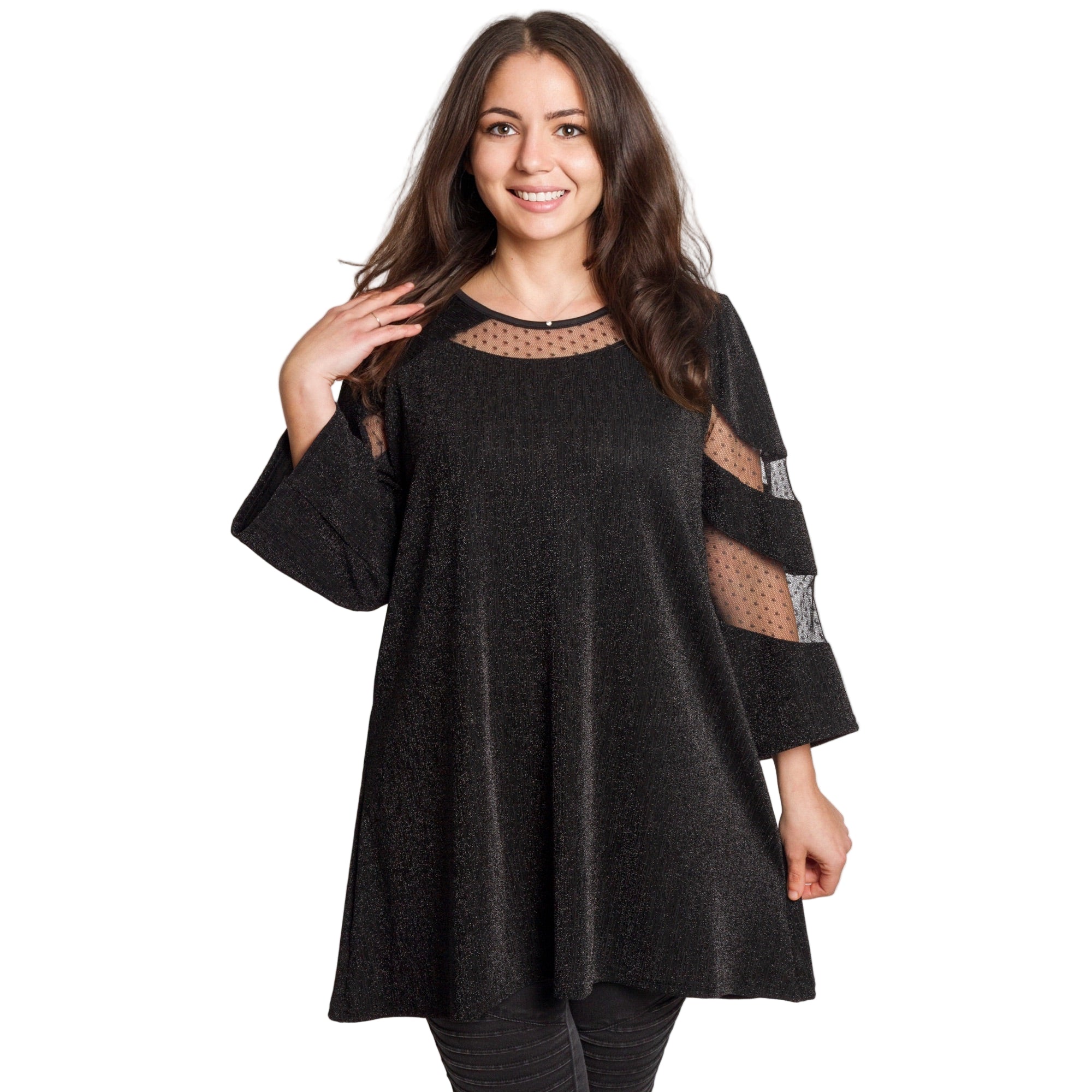 Луксозна черна туника с тюл, създадена за специални поводи и стилни вечери. Моделът е изработен от фина материя с лек блясък, който придава изискано излъчване. Деколтето и ръкавите са акцентирани с прозрачен тюл с точки, който добавя женственост и деликатен шик. Свободната кройка пада красиво по тялото и осигурява комфорт през целия ден. Подходяща за официални събития, празници и елегантни комбинации.