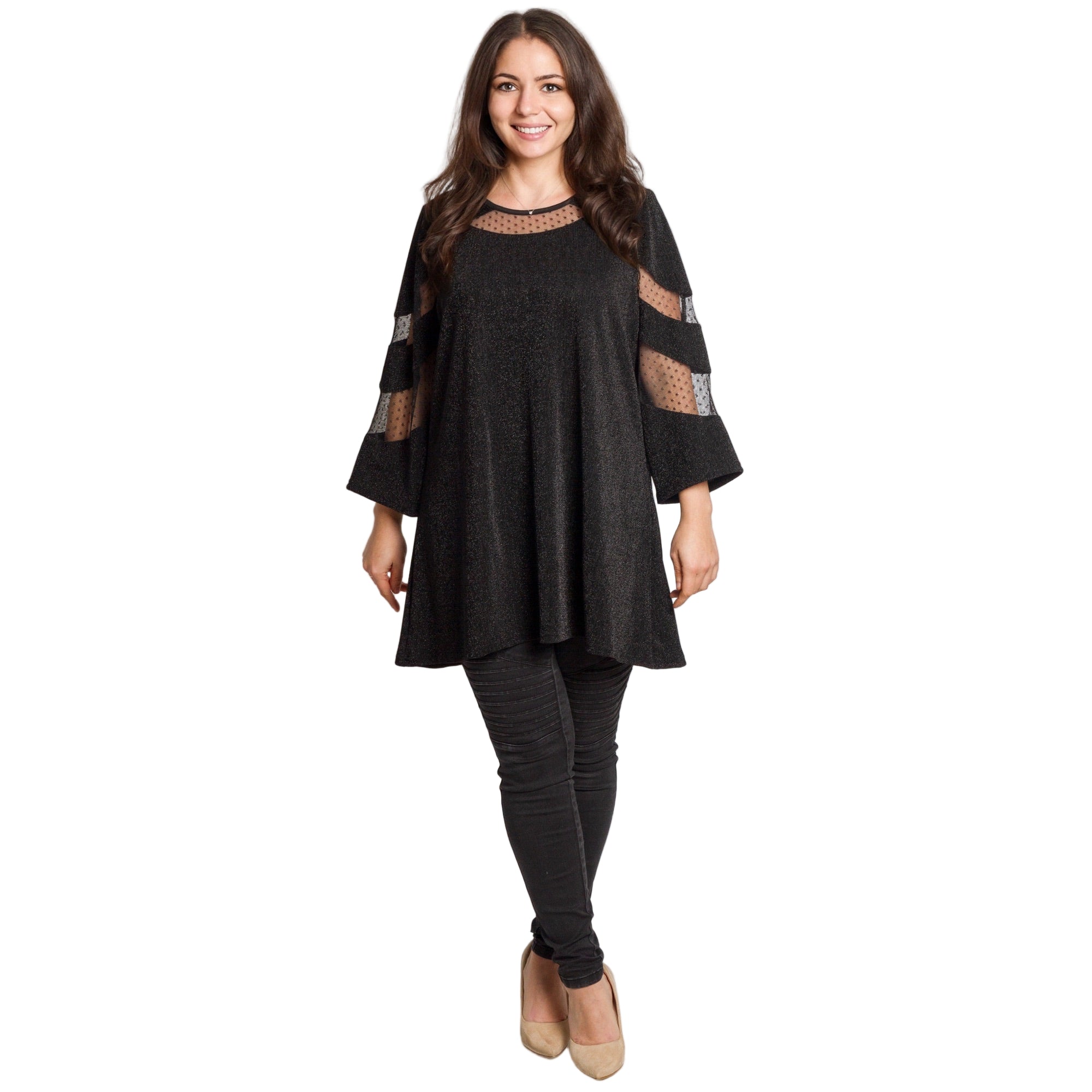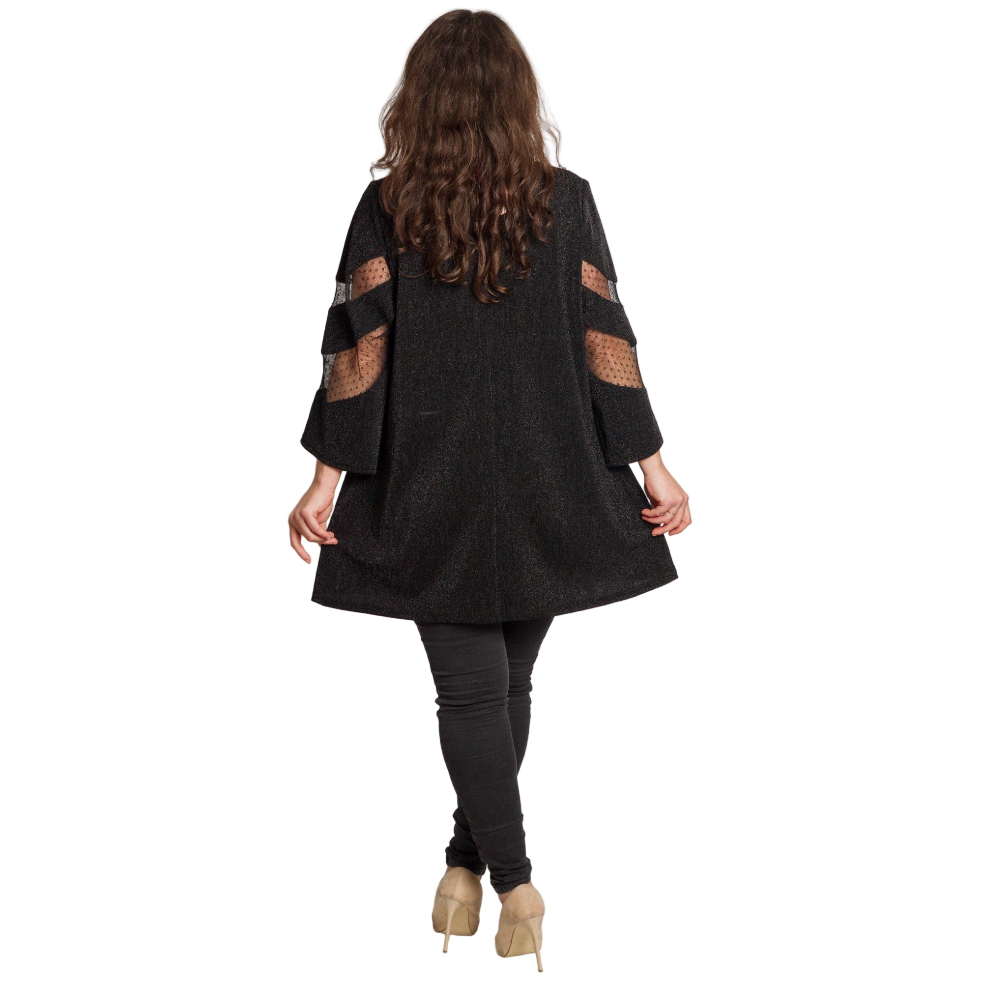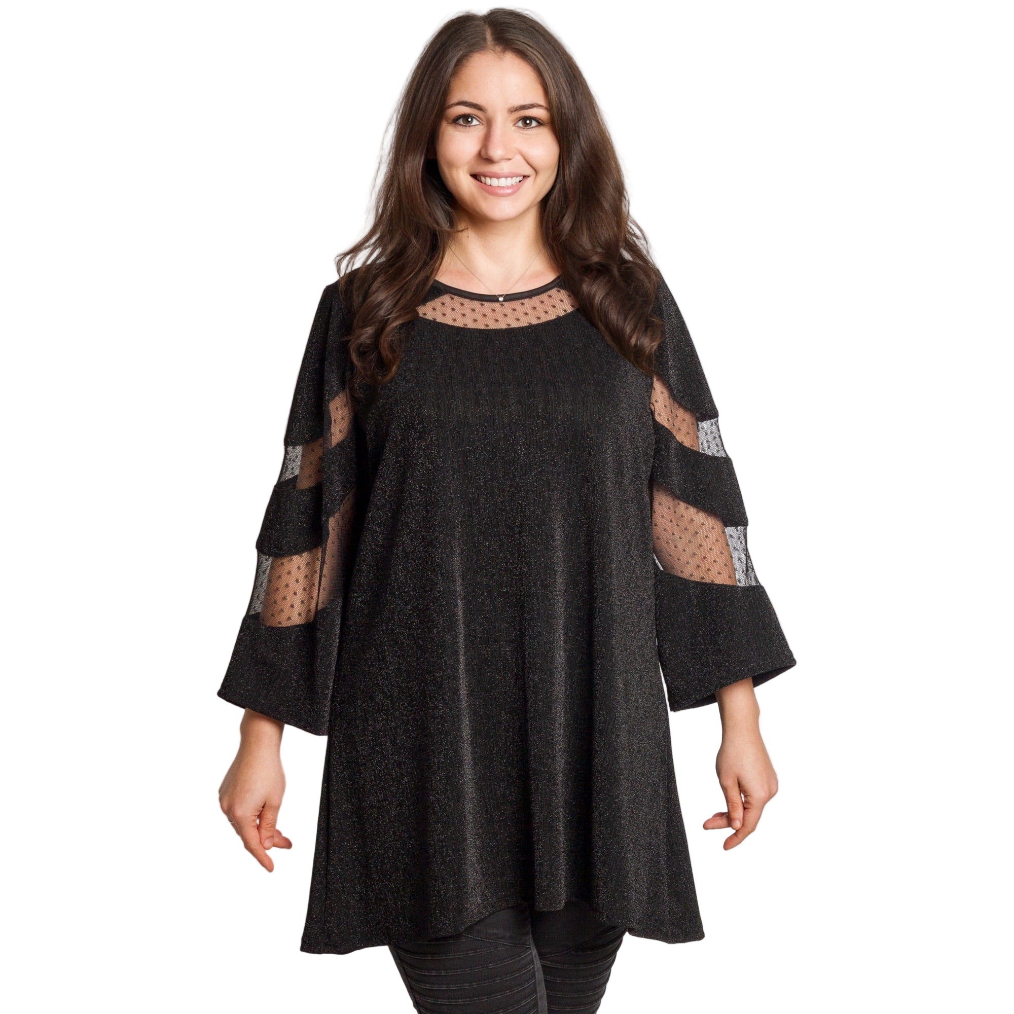 Луксозна черна туника с тюл, създадена за специални поводи и стилни вечери. Моделът е изработен от фина материя с лек блясък, който придава изискано излъчване. Деколтето и ръкавите са акцентирани с прозрачен тюл с точки, който добавя женственост и деликатен шик. Свободната кройка пада красиво по тялото и осигурява комфорт през целия ден. Подходяща за официални събития, празници и елегантни комбинации.