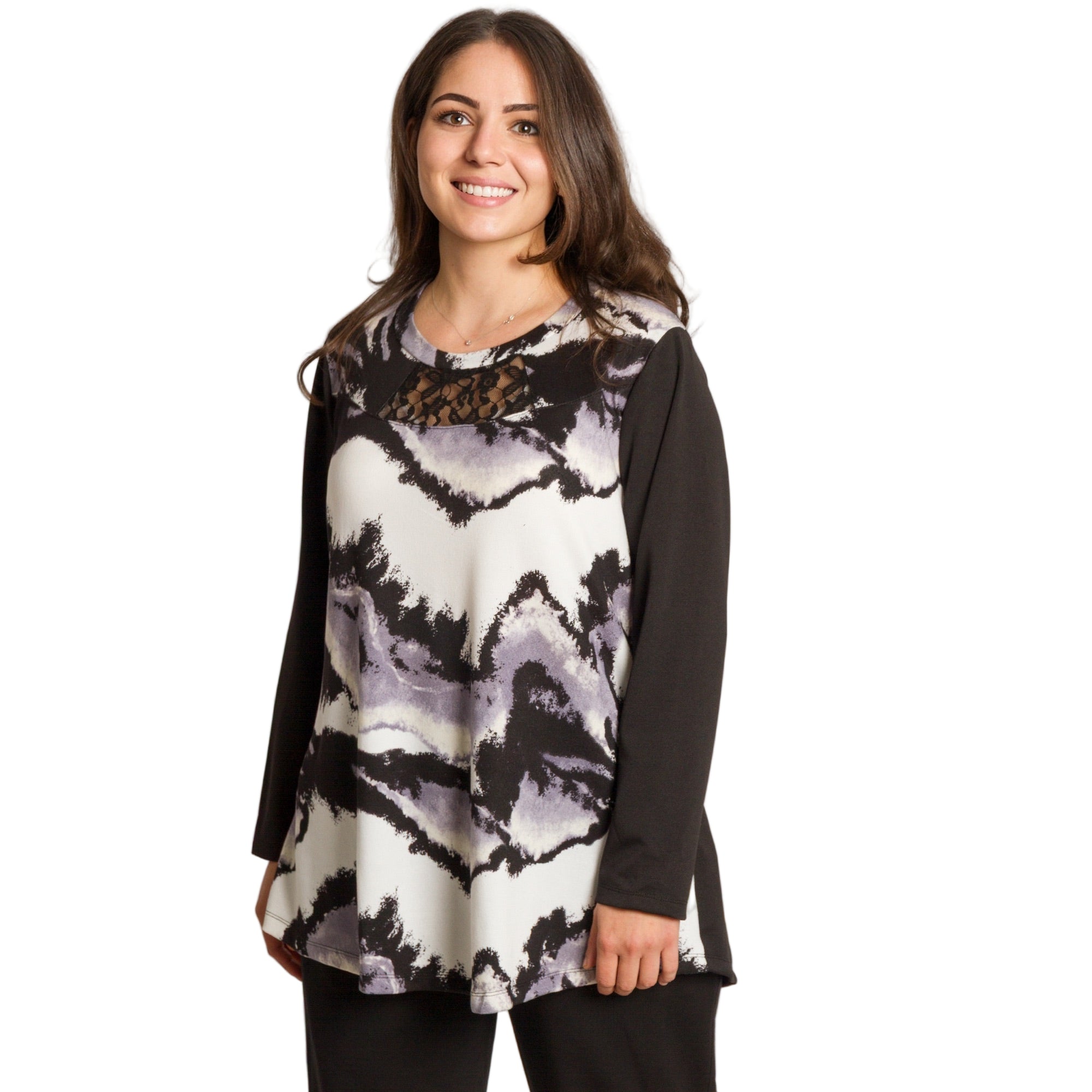 Добавете изисканост и комфорт към ежедневието си с тази стилна туника в големи размери. Предната част впечатлява с артистичен абстрактен десен в черно, бяло и лилаво, а деликатният дантелен детайл на деколтето придава женствен и елегантен акцент. Изработена от мек памучен плат с еластан, туниката осигурява отлична еластичност и усещане за лекота. Разкроената кройка осигурява свобода на движение и подчертава фигурата по най-нежния начин.