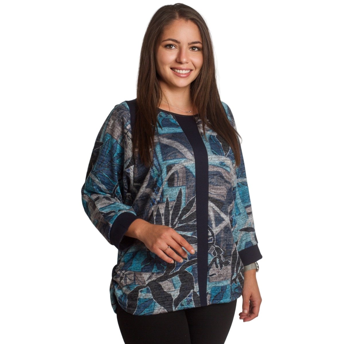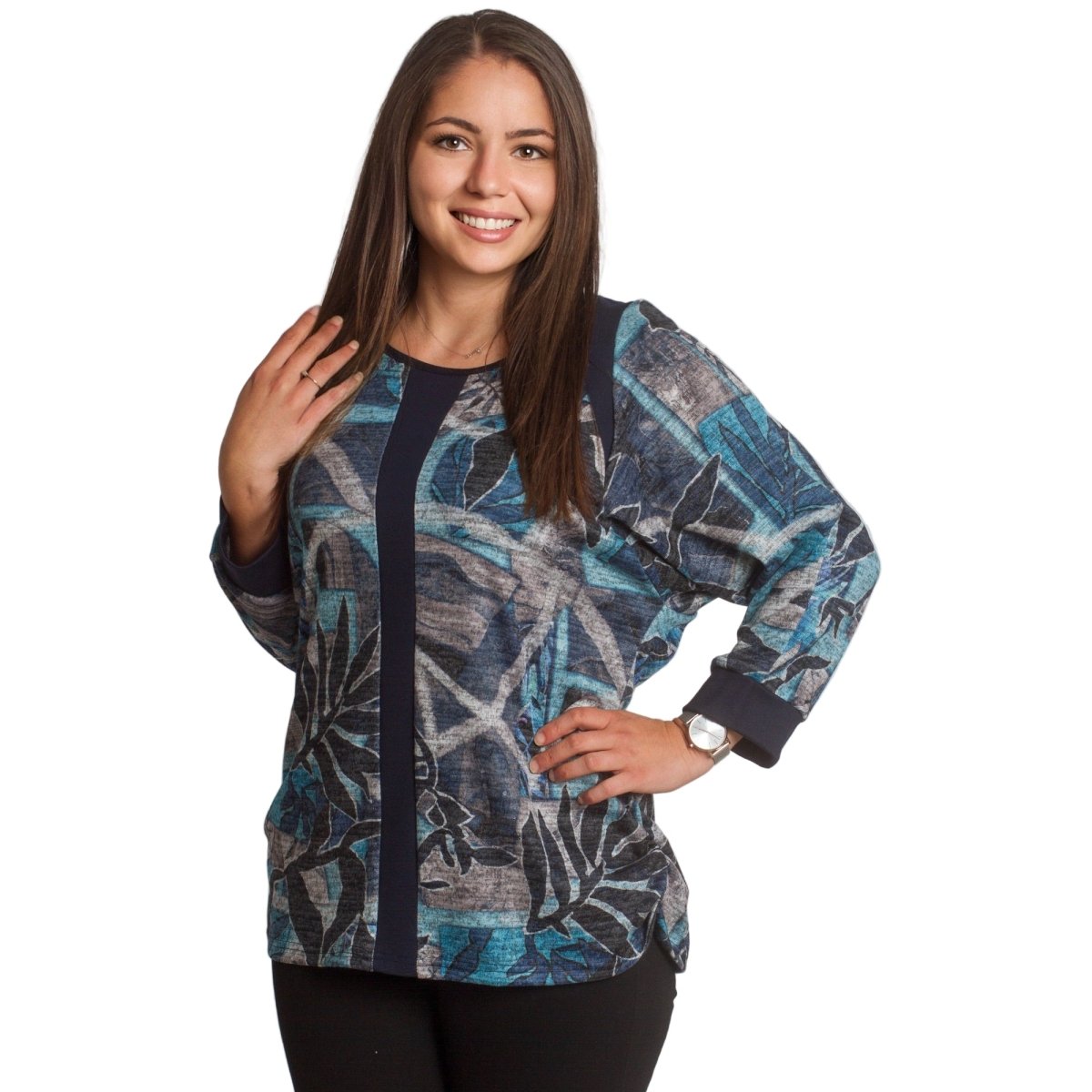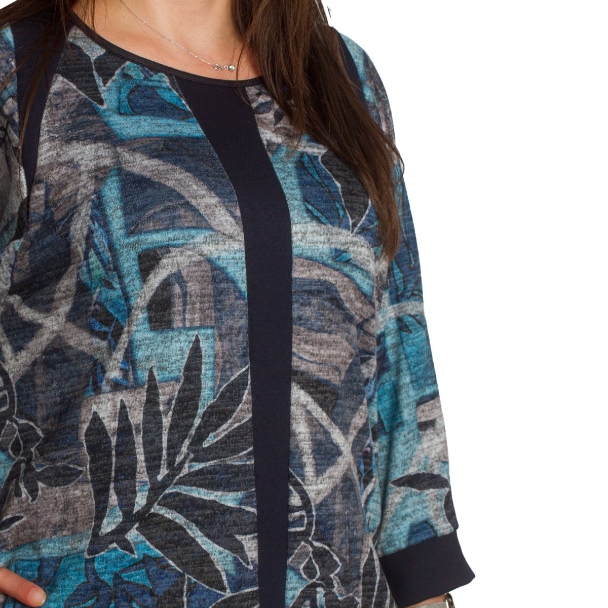 Елегантна туника в макси размери, съчетаваща комфорт и стил. Изработена е от мека и еластична вискоза с еластан, която осигурява удобство при носене. Свободната кройка прикрива нежно силуета, а многоцветният флорален десен в синьо, сиво и черно придава модерна визия. Кръглото деколте и дългите ръкави с маншети я правят подходяща както за ежедневието, така и за официални поводи през есенно-зимния сезон.