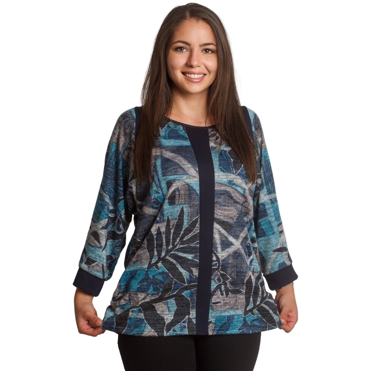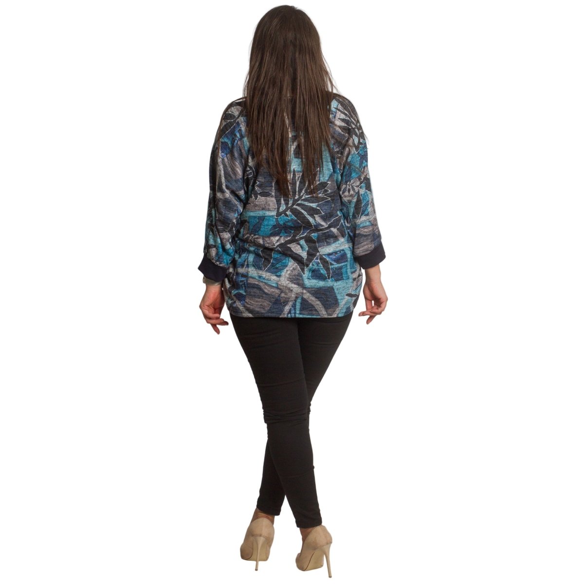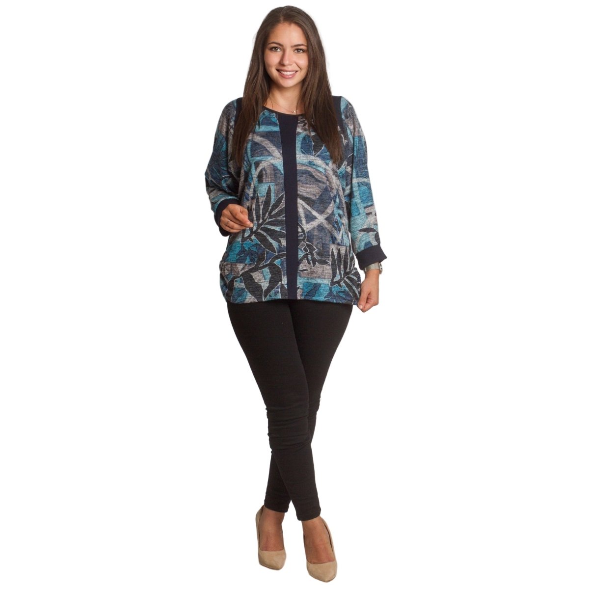 Елегантна туника в макси размери, съчетаваща комфорт и стил. Изработена е от мека и еластична вискоза с еластан, която осигурява удобство при носене. Свободната кройка прикрива нежно силуета, а многоцветният флорален десен в синьо, сиво и черно придава модерна визия. Кръглото деколте и дългите ръкави с маншети я правят подходяща както за ежедневието, така и за официални поводи през есенно-зимния сезон.