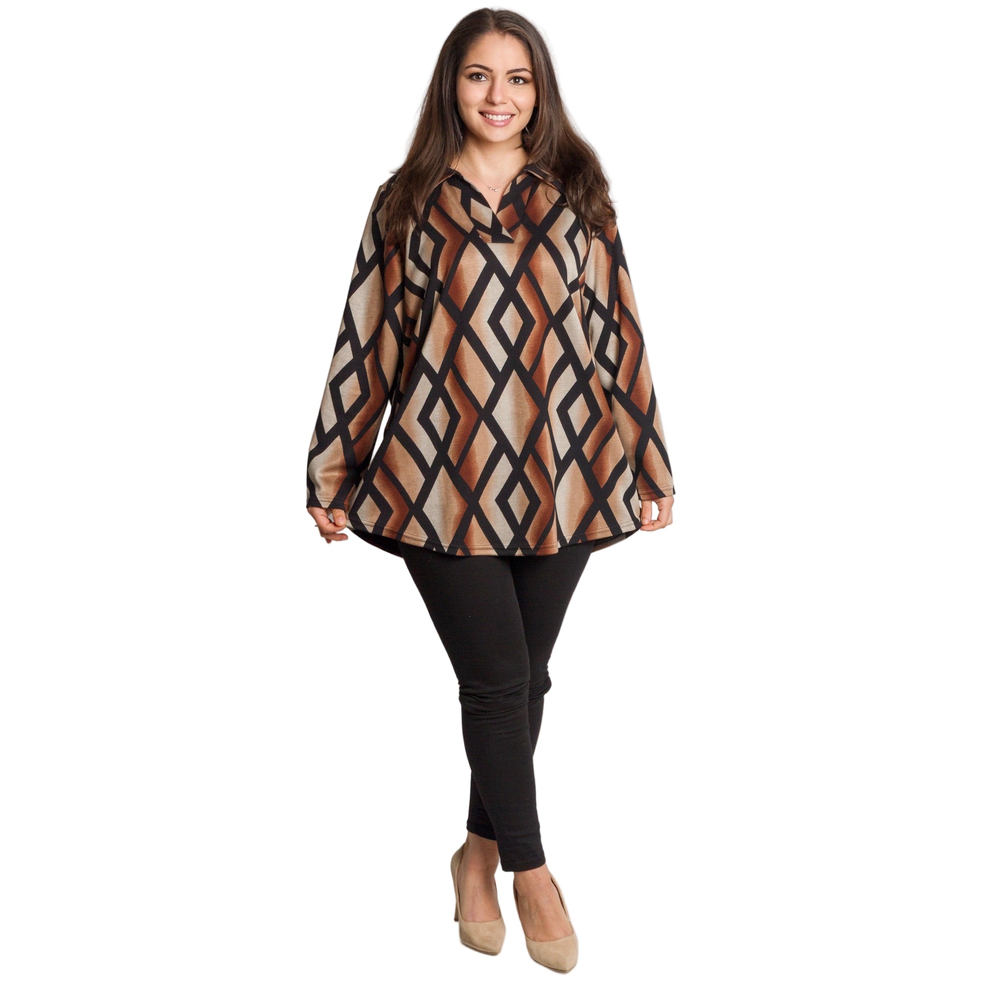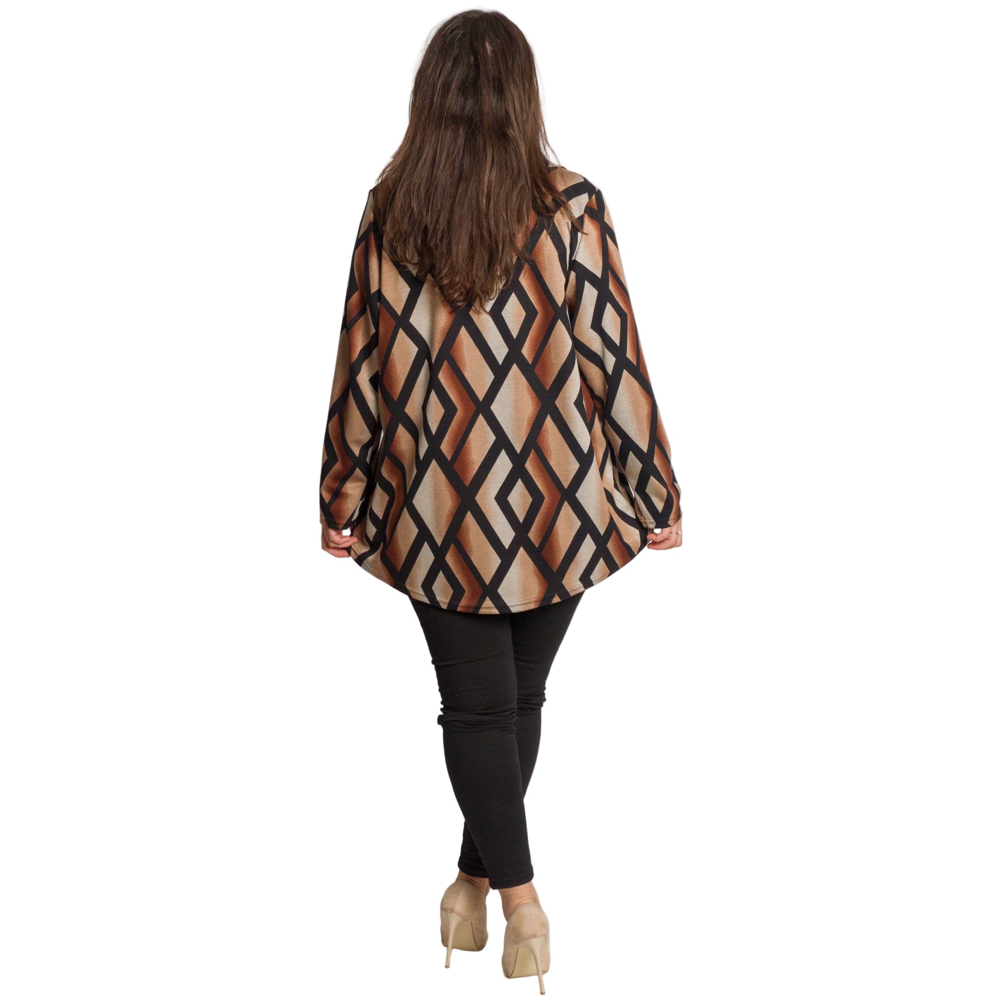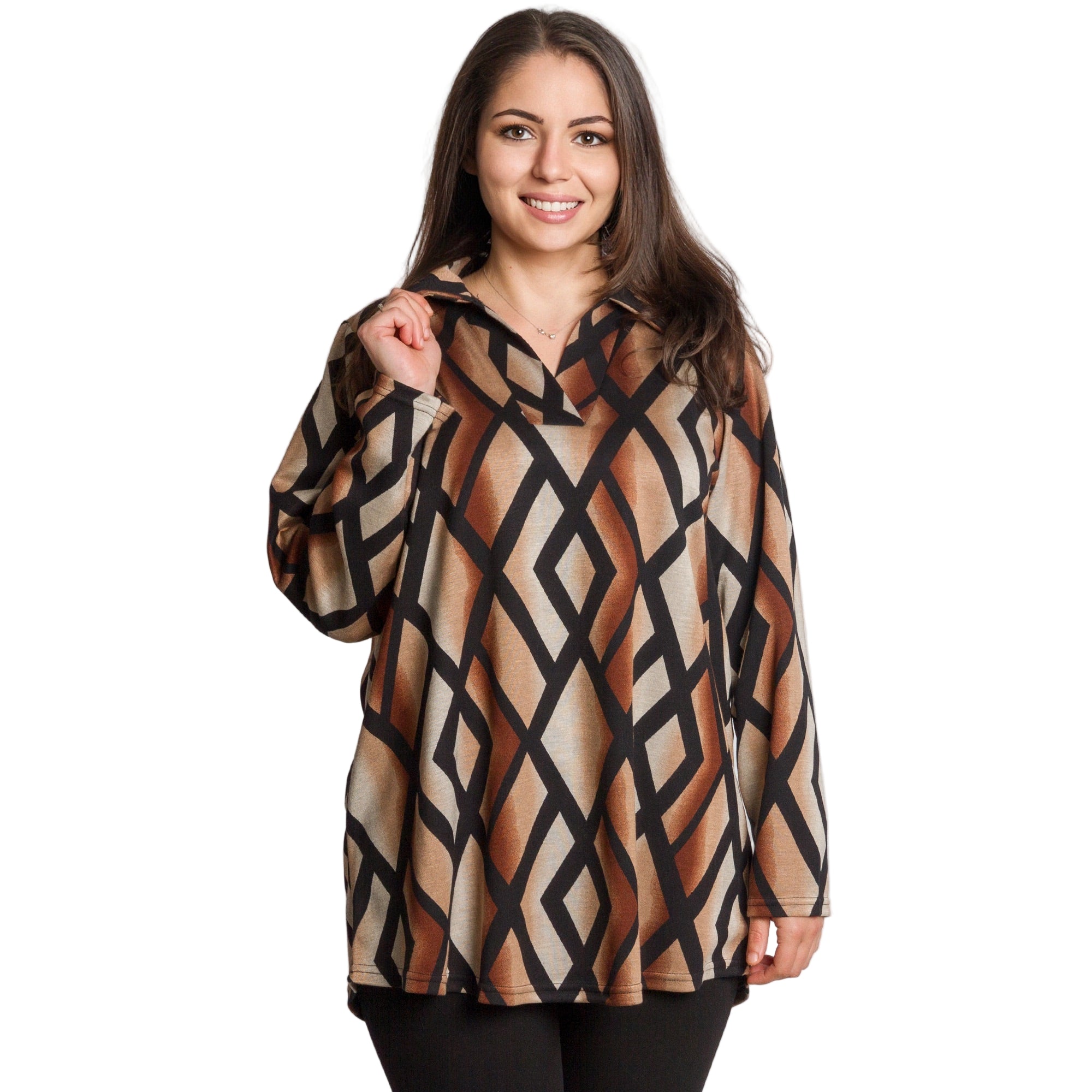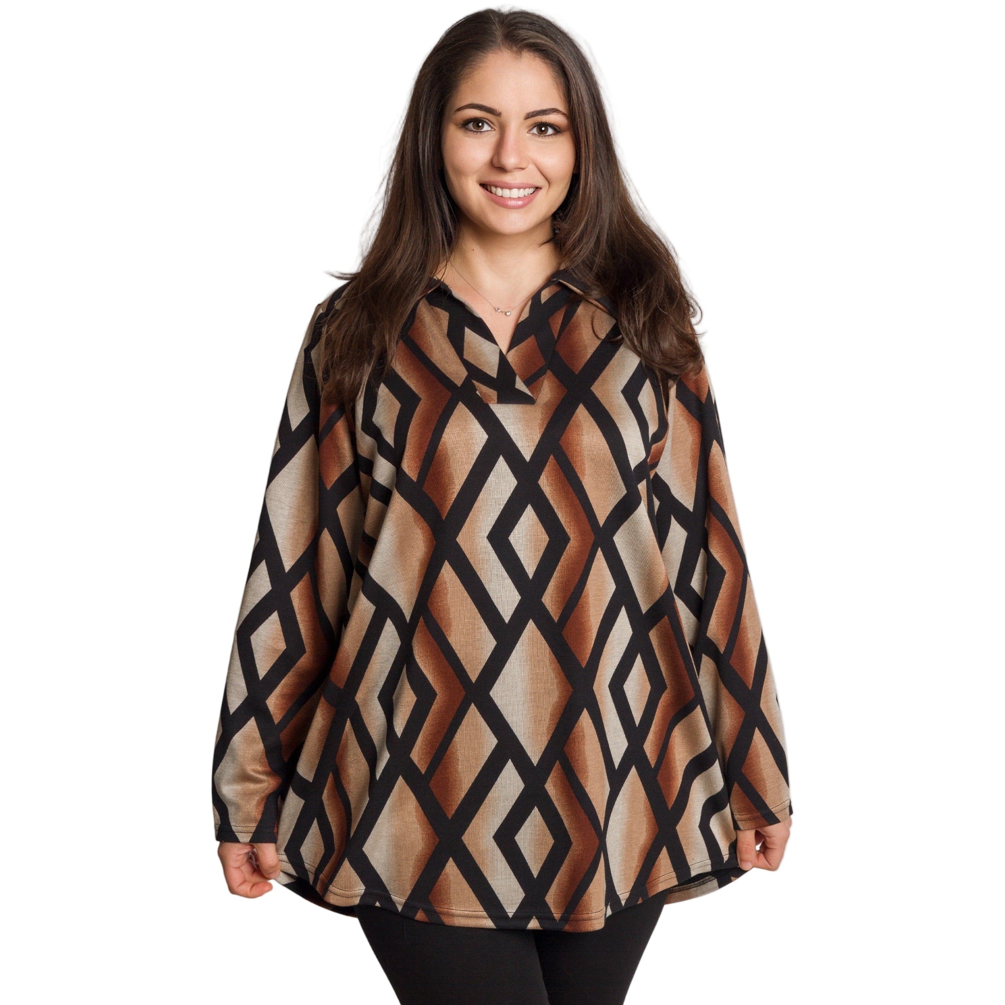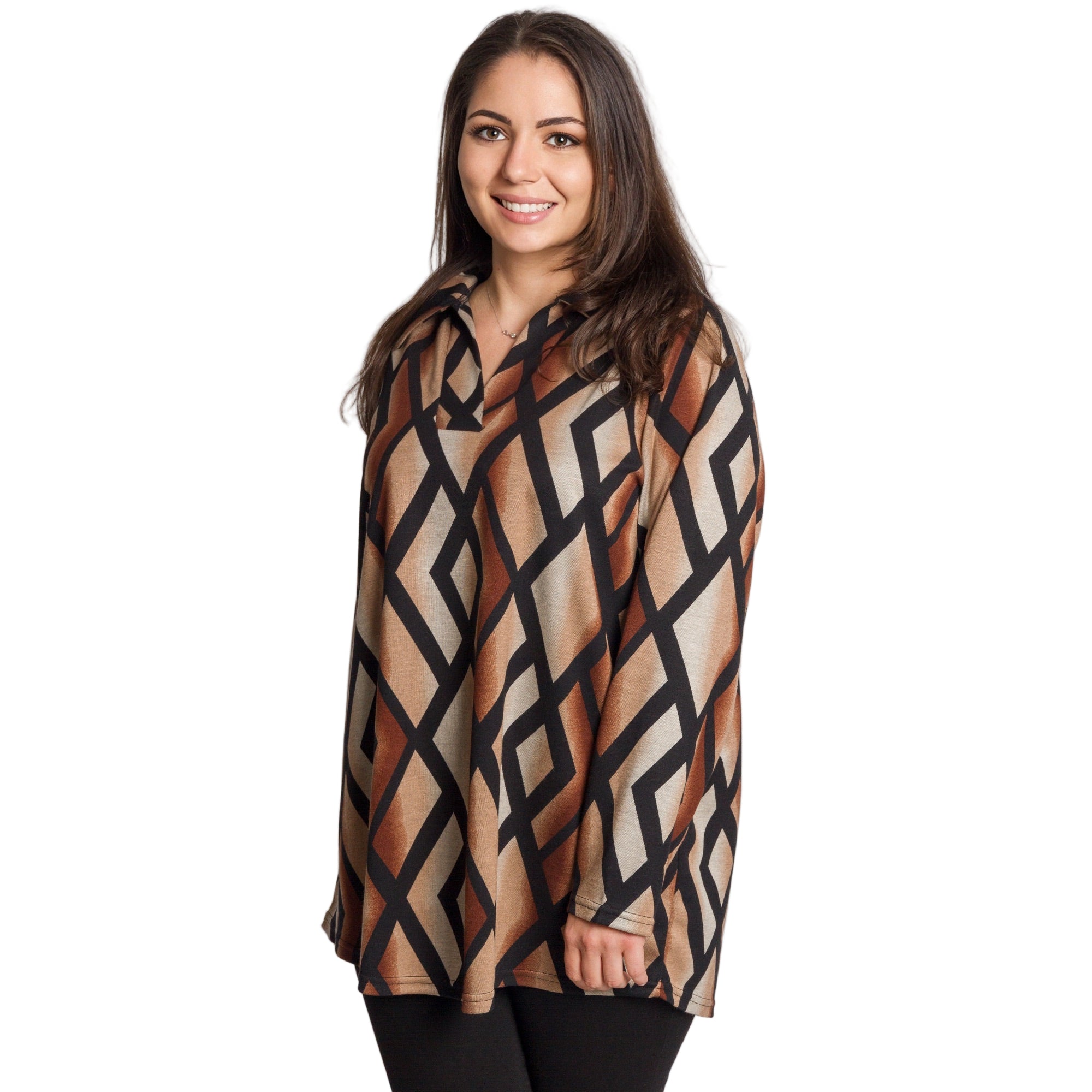 Стилна и модерна туника в големи размери, която впечатлява с изчистената си линия и елегантен геометричен десен. Изработена е от висококачествена смес от полиамид, полиестер и ликра – материя, която е еластична, мека и устойчива на деформации. Туниката е с права кройка и V-образно деколте с яка, което придава изтънчен завършек и издължава визуално шията. Цветовата комбинация от кафяви, бежови и черни тонове я прави лесна за съчетаване с едноцветни панталони или клинове. Подходяща е както за ежедневието, така и за по-официални поводи.