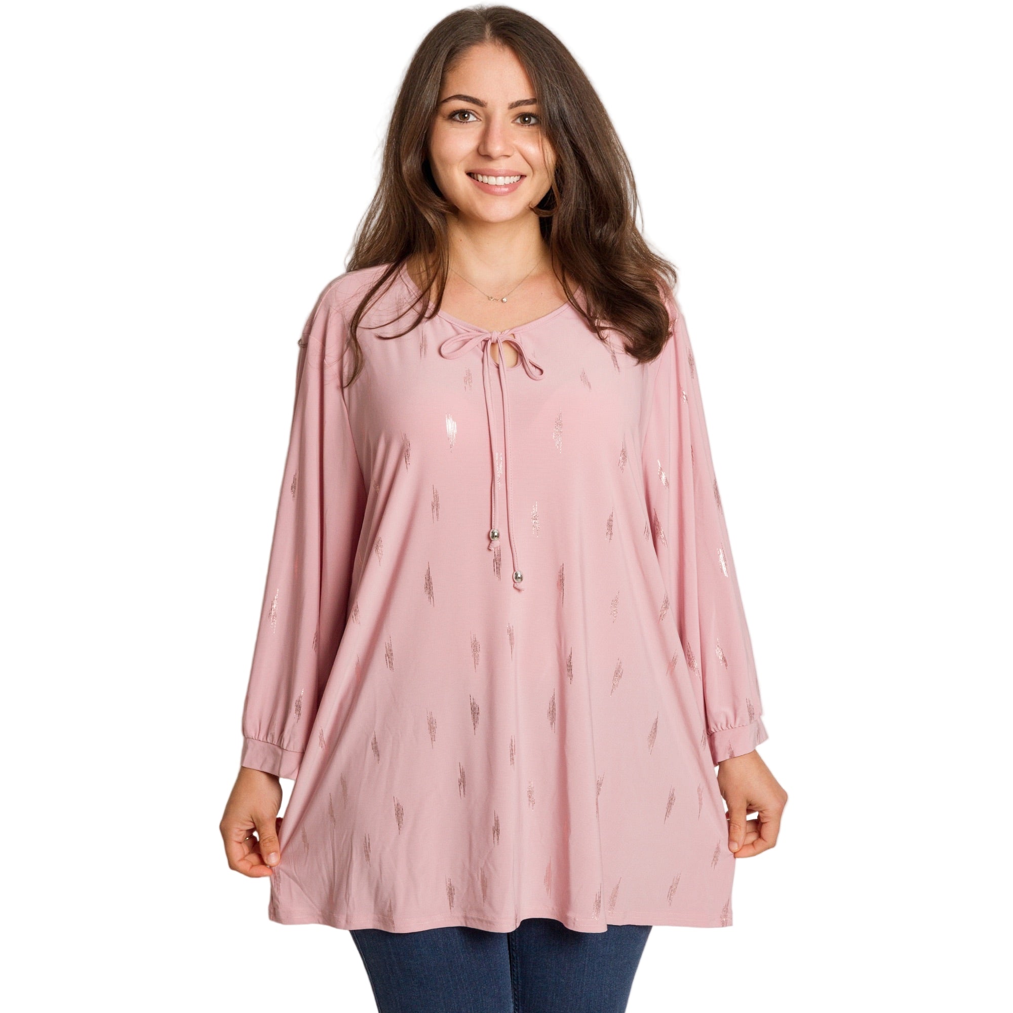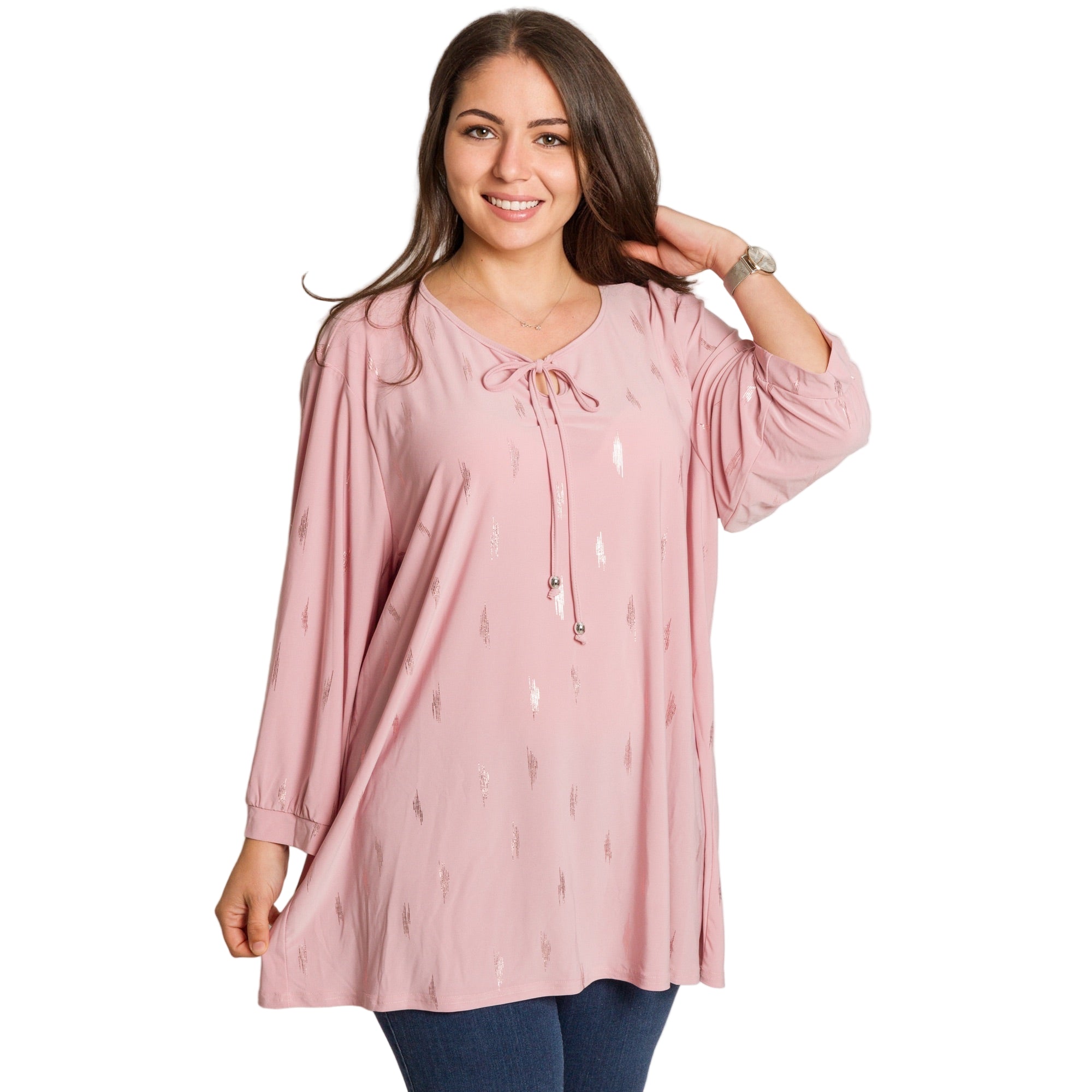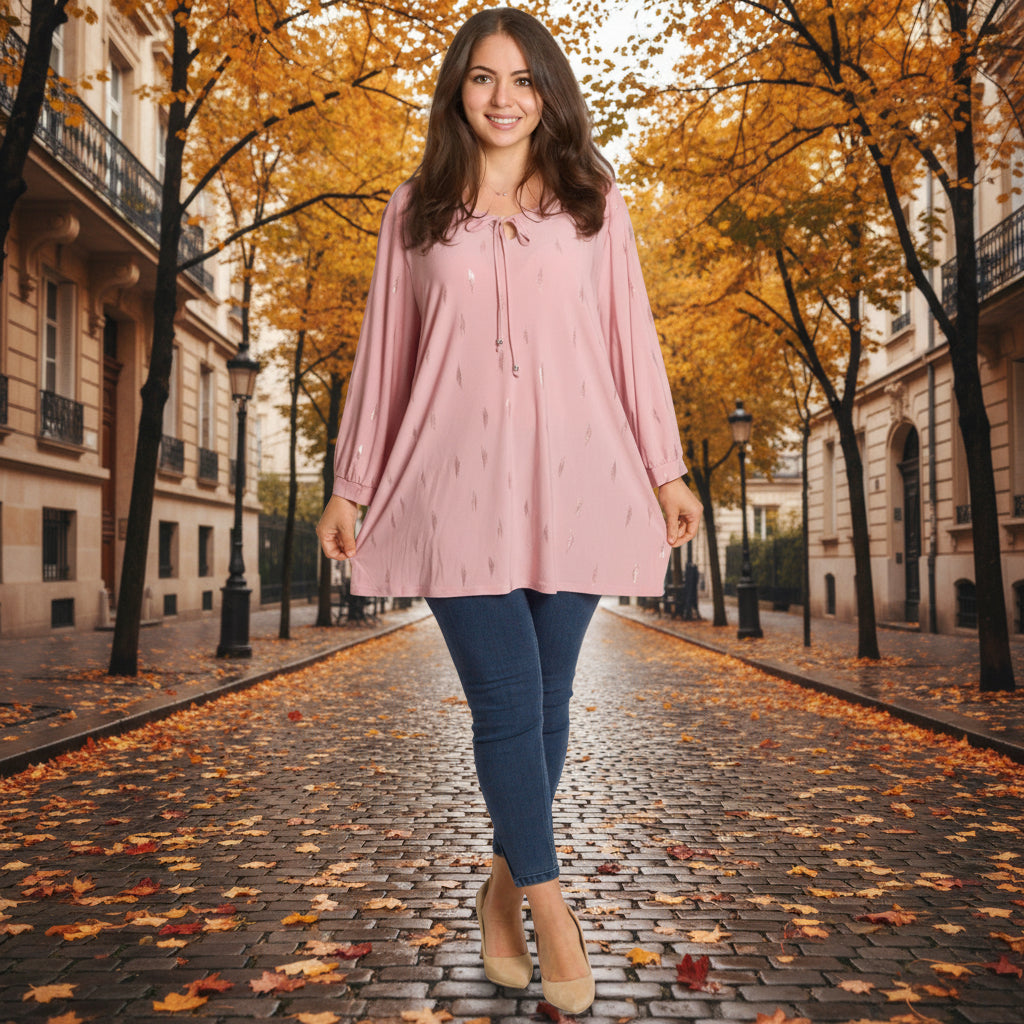 Стилна и женствена туника в големи размери, изработена от мека и еластична материя за удобство и комфорт през целия ден. В нежно розов цвят, декорирана с ефектни блестящи акценти, които придават модерно и изискано излъчване. Моделът е с права кройка и кръгло деколте, завършено с връзка и декоративни метални елементи. Подходяща е както за ежедневието, така и за по-елегантни поводи през есенно-зимния сезон.