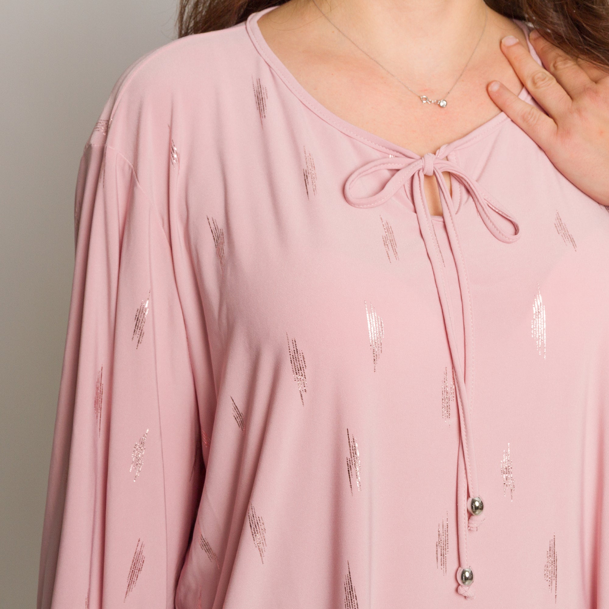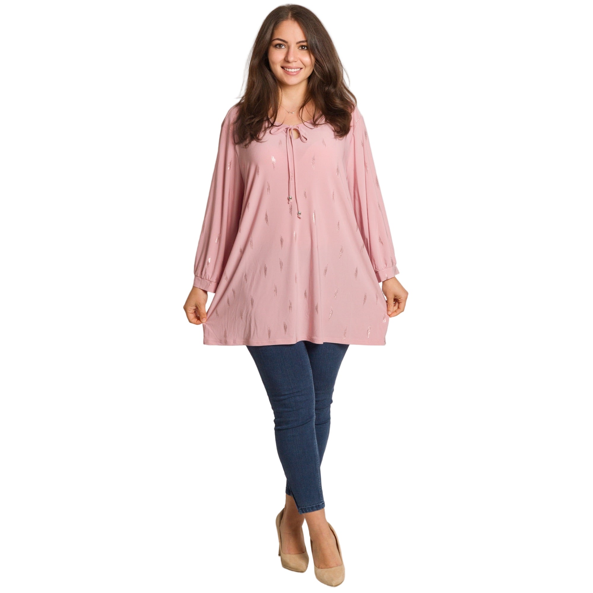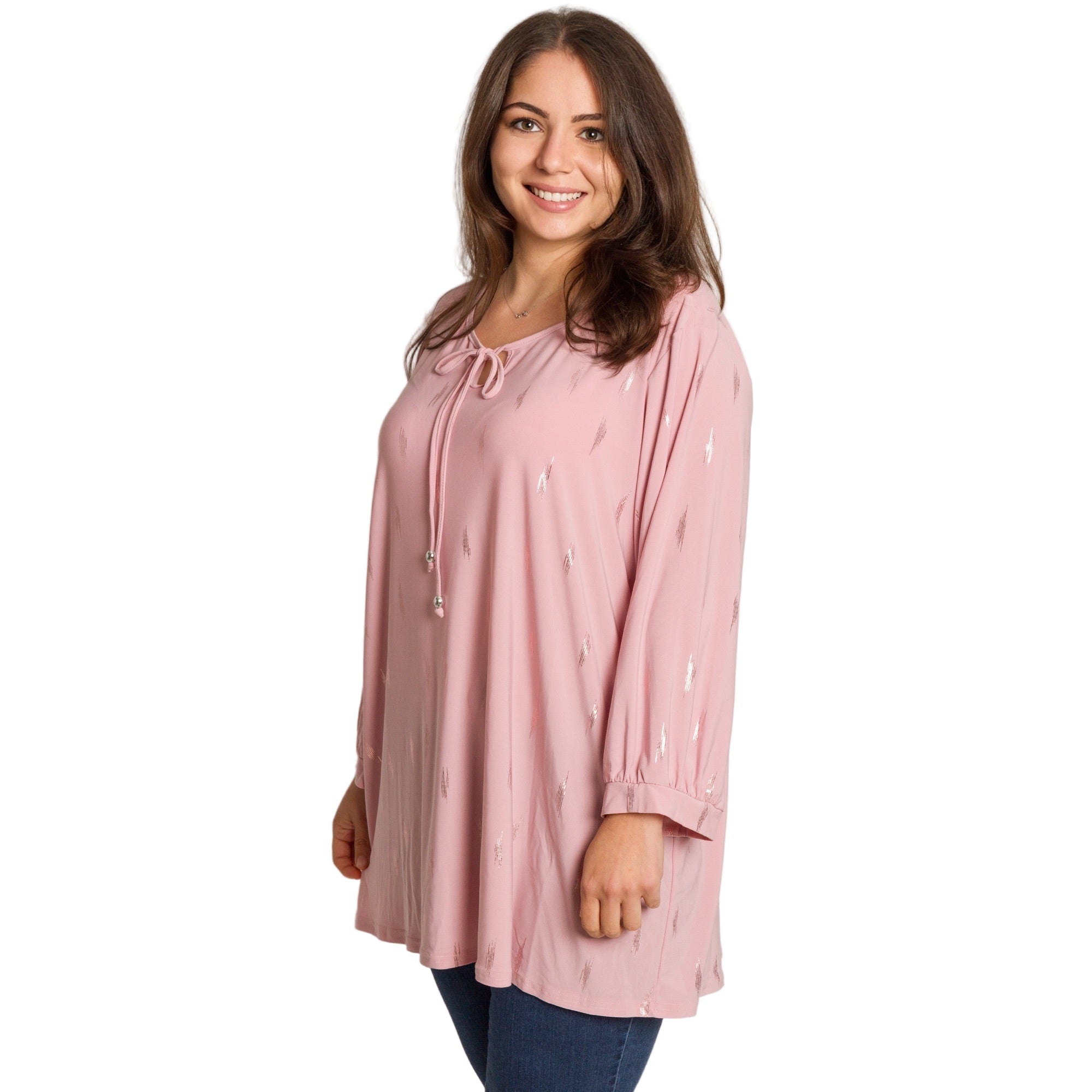 Стилна и женствена туника в големи размери, изработена от мека и еластична материя за удобство и комфорт през целия ден. В нежно розов цвят, декорирана с ефектни блестящи акценти, които придават модерно и изискано излъчване. Моделът е с права кройка и кръгло деколте, завършено с връзка и декоративни метални елементи. Подходяща е както за ежедневието, така и за по-елегантни поводи през есенно-зимния сезон.