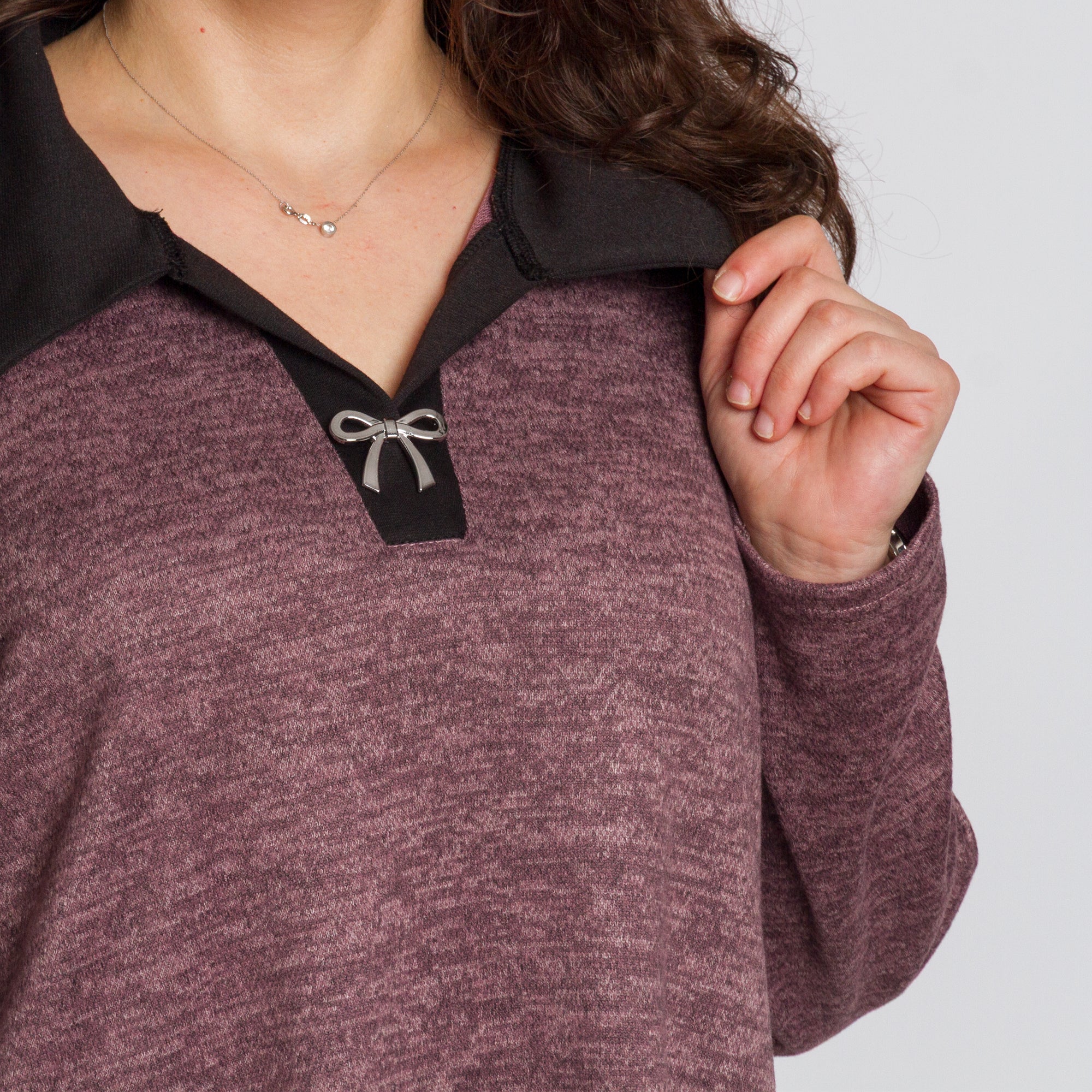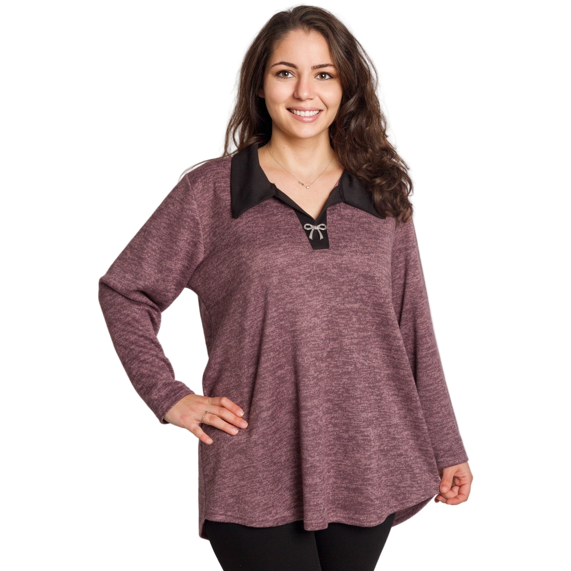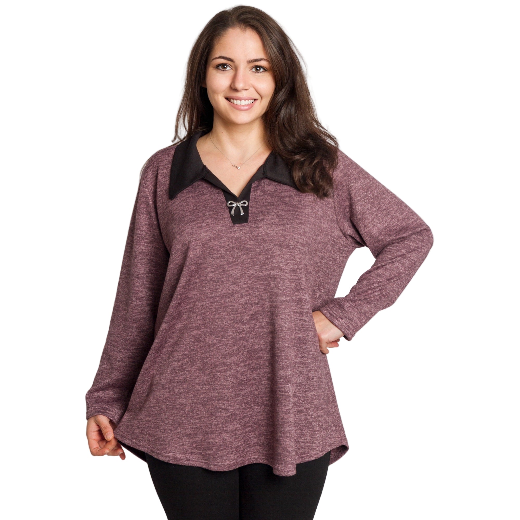 Нежна туника в цвят пепел от рози, създадена за комфорт и стил през есенно-зимния сезон. Меката вискозна материя с еластан пада леко по тялото, а свободната кройка осигурява удобство и красиво прикриване на зоната около ханша и корема. V-образното деколте с контрастна яка и декоративна панделка добавя елегантен акцент, който визуално издължава силуета. Перфектен избор за плюс сайз дами, които искат да се чувстват женствени и уверени – както в ежедневието, така и при по-официални поводи.