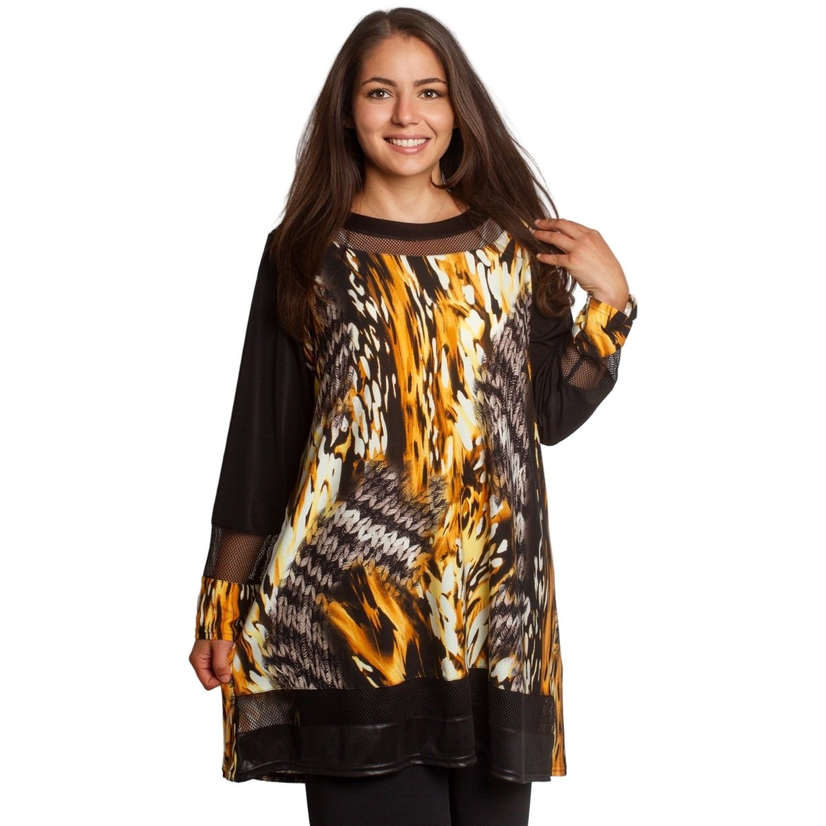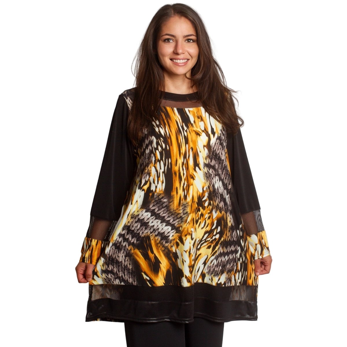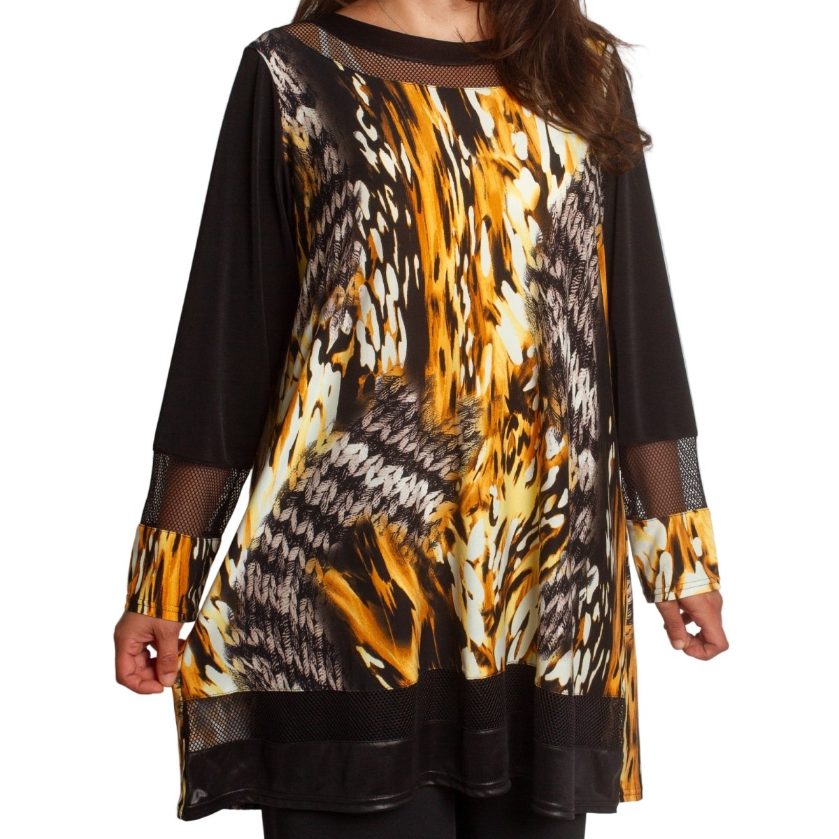 Елегантна и модерна туника в големи размери, изработена от висококачествена материя с еластичност за комфорт и свобода на движение. Дизайнът е в черна основа с ефектен абстрактен десен в жълто-оранжеви тонове, създаващ динамично и стилно излъчване. Моделът е със свободна кройка, която прикрива несъвършенствата и подчертава силуета по изящен начин. Деколтето е кръгло с мрежеста вложка, а ръкавите са дълги с модерни акценти от мрежа. Подходяща е както за ежедневието, така и за официални поводи през есенно-зимния сезон.