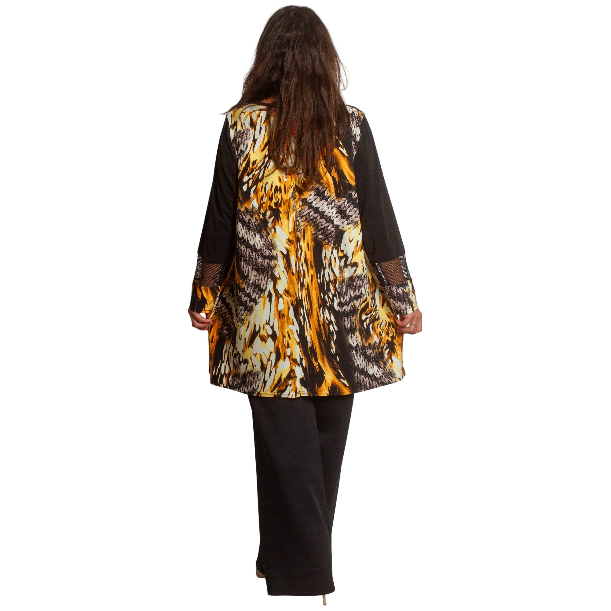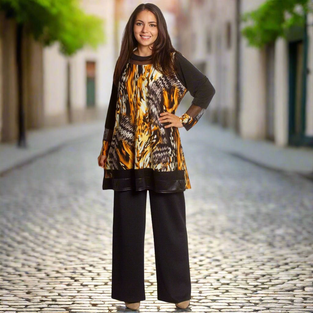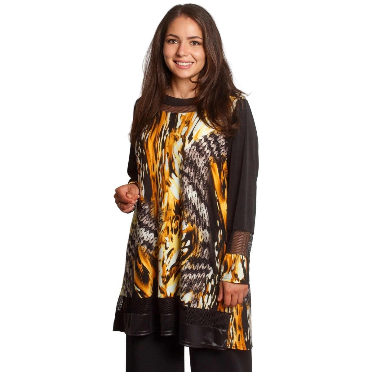 Елегантна и модерна туника в големи размери, изработена от висококачествена материя с еластичност за комфорт и свобода на движение. Дизайнът е в черна основа с ефектен абстрактен десен в жълто-оранжеви тонове, създаващ динамично и стилно излъчване. Моделът е със свободна кройка, която прикрива несъвършенствата и подчертава силуета по изящен начин. Деколтето е кръгло с мрежеста вложка, а ръкавите са дълги с модерни акценти от мрежа. Подходяща е както за ежедневието, така и за официални поводи през есенно-зимния сезон.