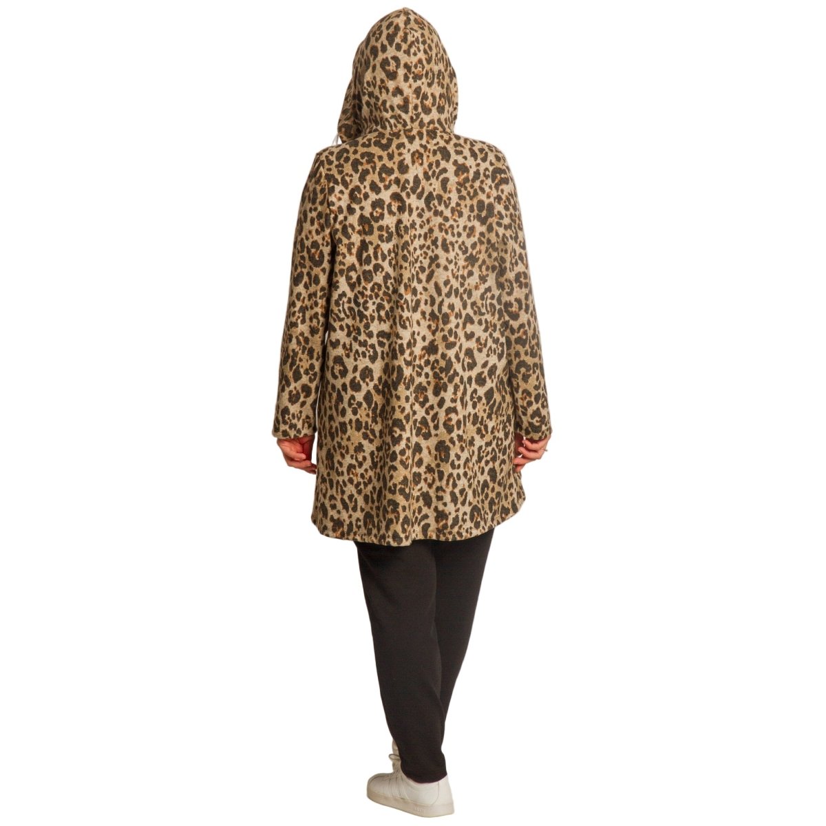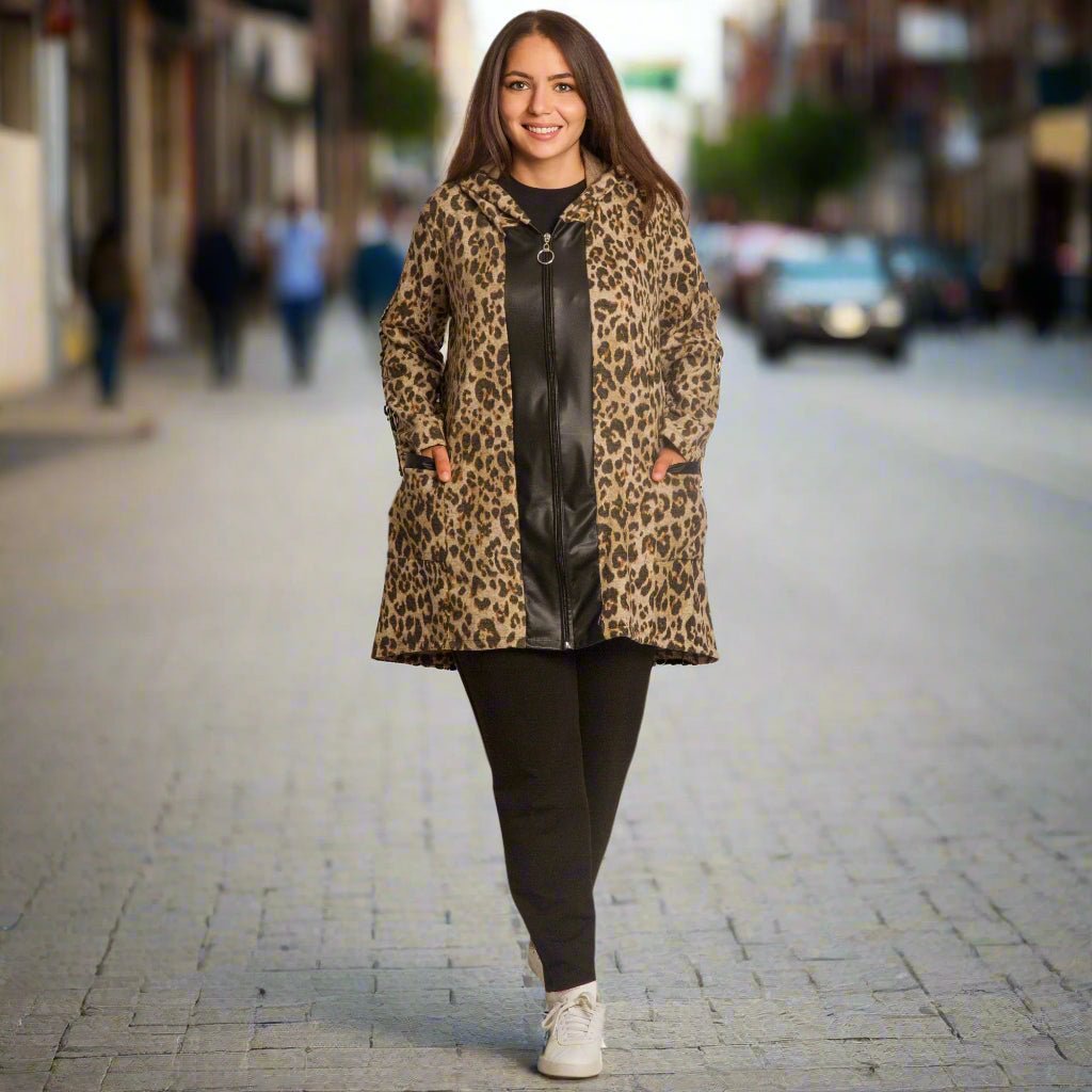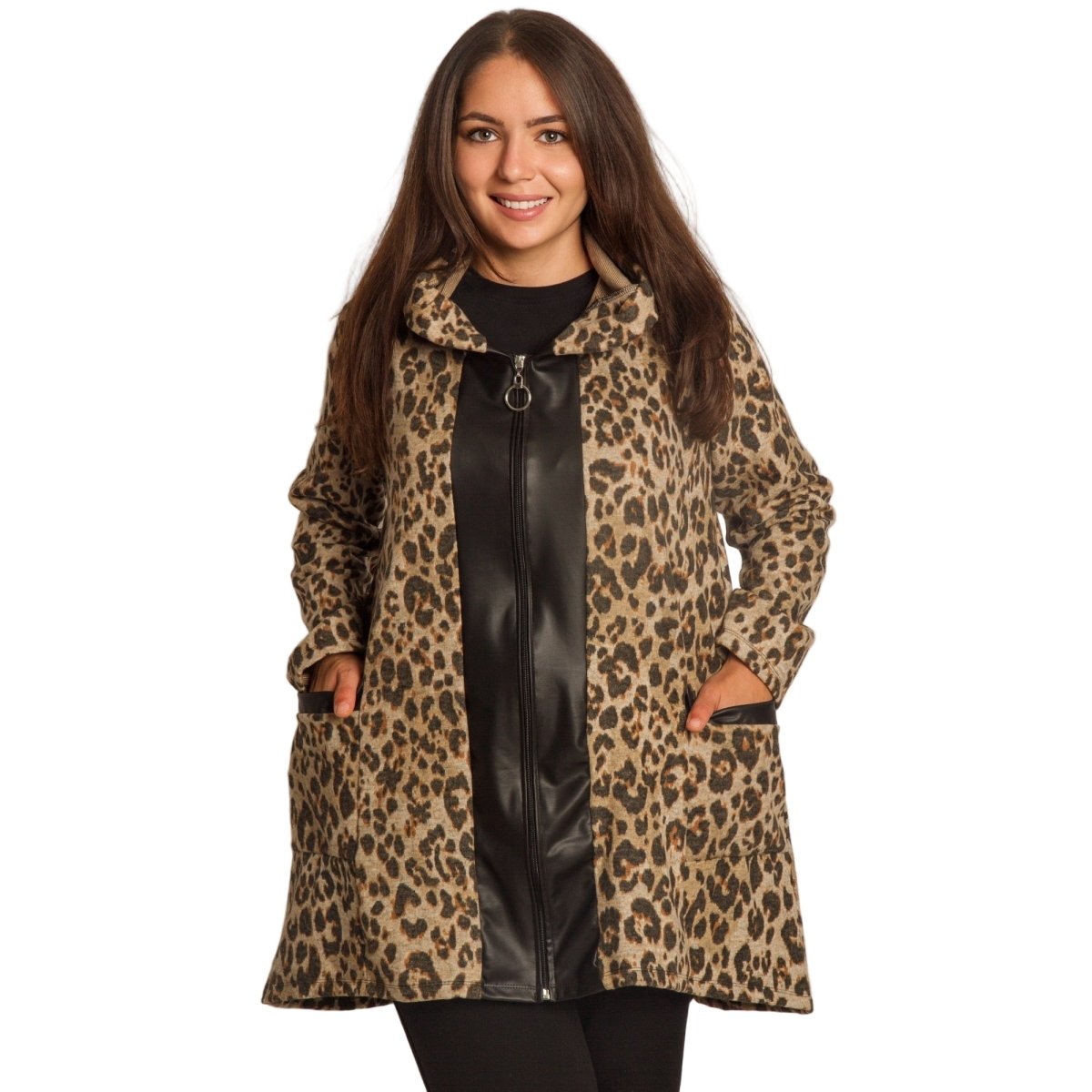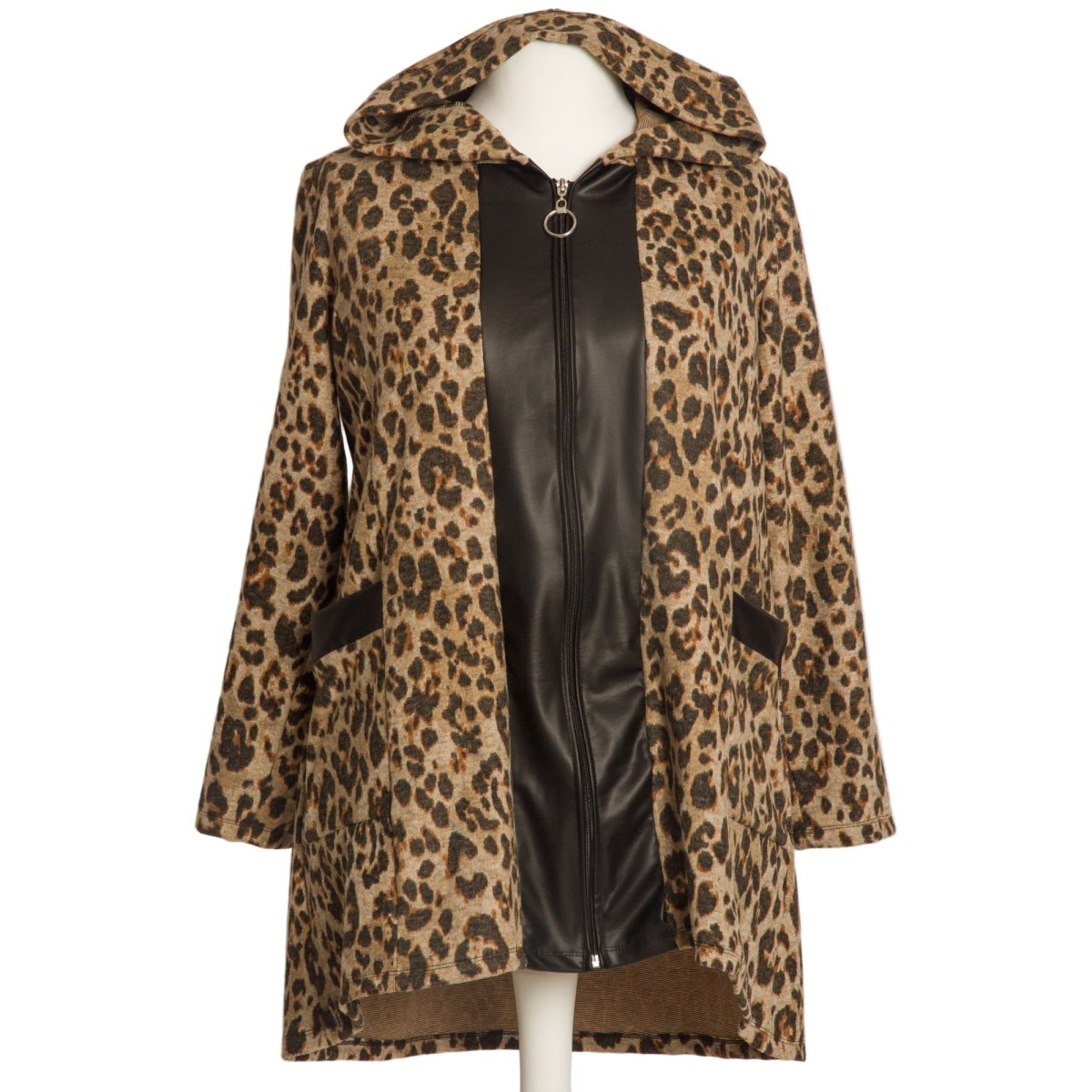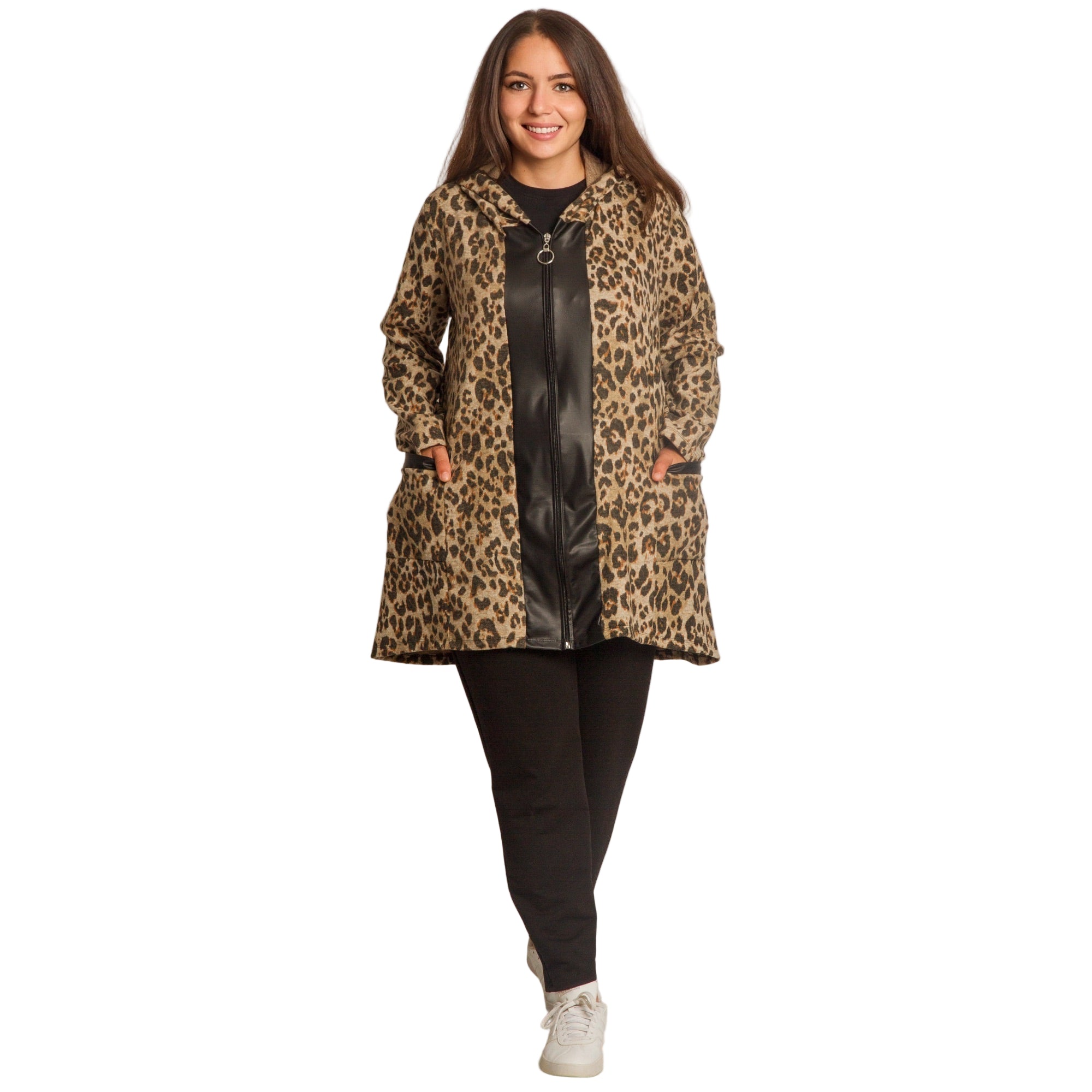 Модерен суитшърт в големи размери, създаден за комфорт и стил. Изработен е от мека памучна материя с еластан, която осигурява удобство и свобода на движението. Кройката е разкроена и прикрива елегантно силуета, като същевременно придава лекота. Моделът е с качулка, дълги ръкави и практично закопчаване с цип. Черният цвят е допълнен от ефектен леопардов принт, който подчертава модерната визия. Подходящ за ежедневни и по-официални поводи през есенно-зимния сезон.