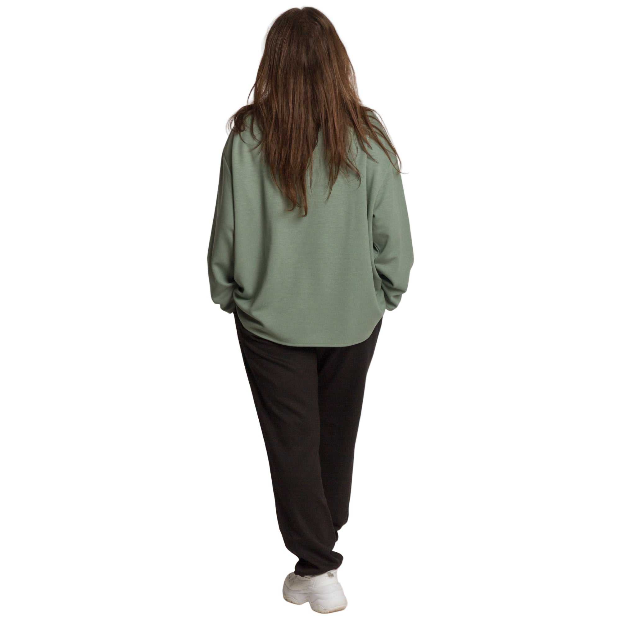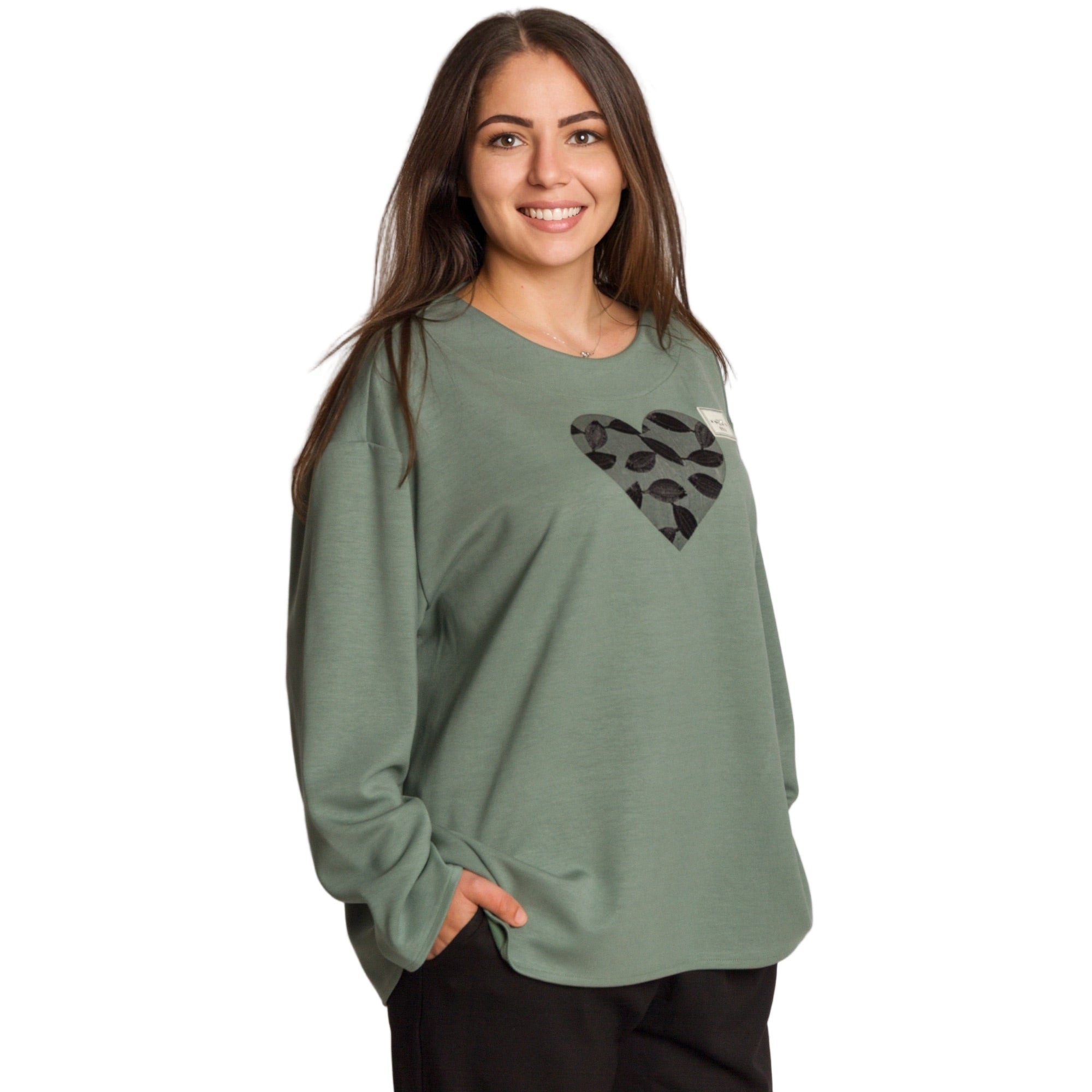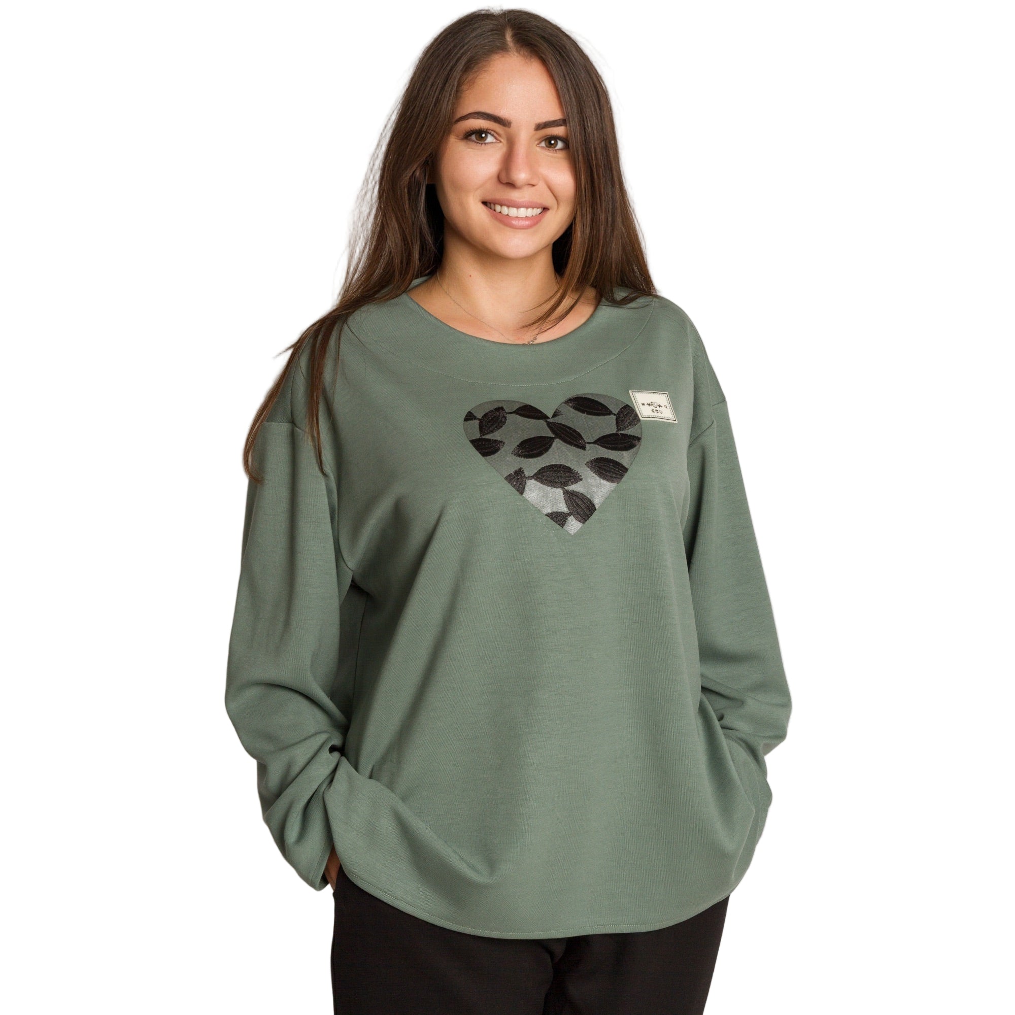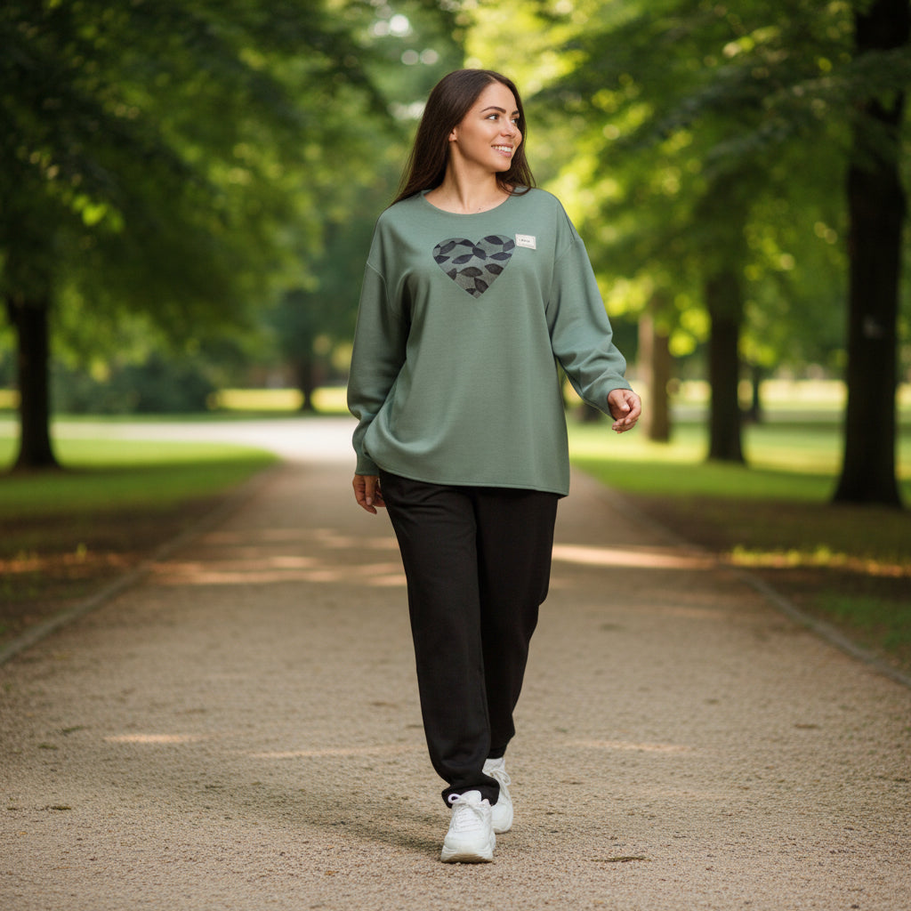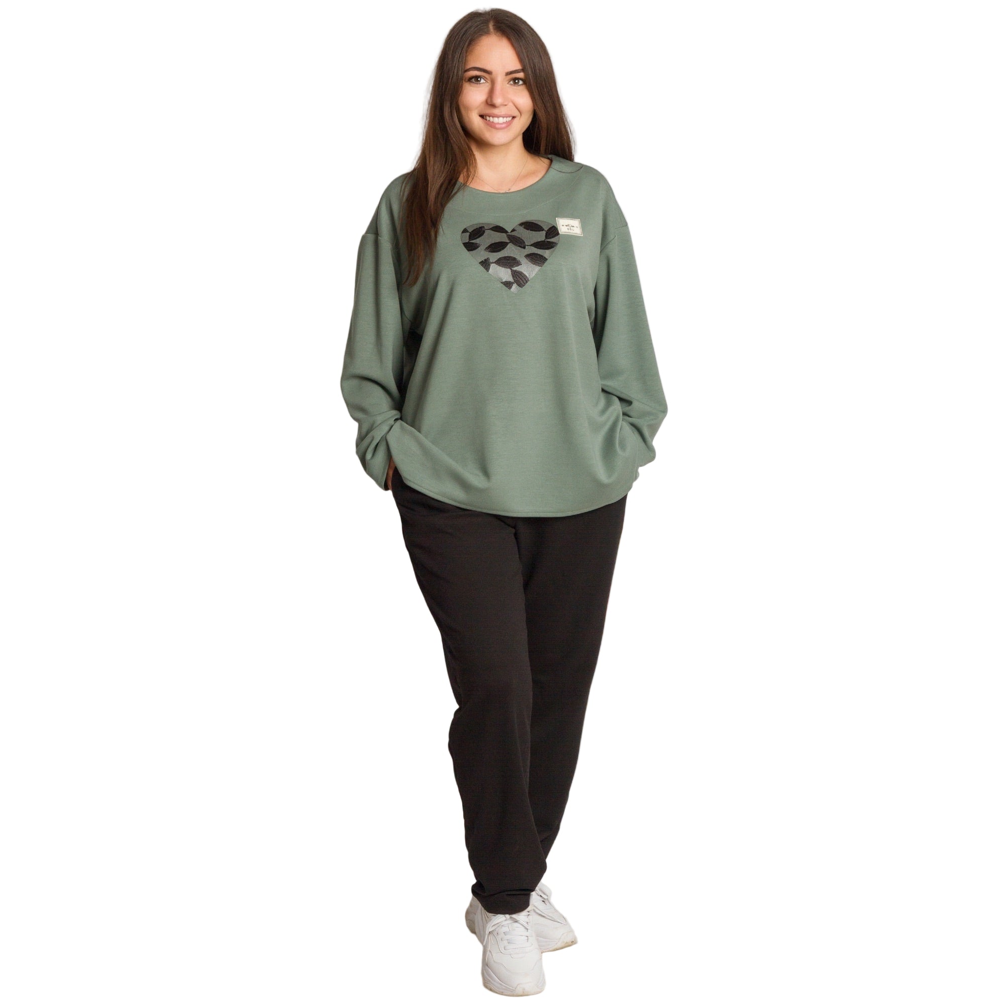Удобен и стилен комплект, състоящ се от мека блуза в зелен цвят и черен панталон с ластик. Блузата е с ефектен акцент – апликация във формата на сърце с флорални мотиви и декоративен етикет в горната част. Материята е приятна на допир и осигурява комфорт през целия ден. Панталонът е с еластичен колан за удобно прилягане и дължина до глезена. Подходящ за ежедневието и свободното време.
