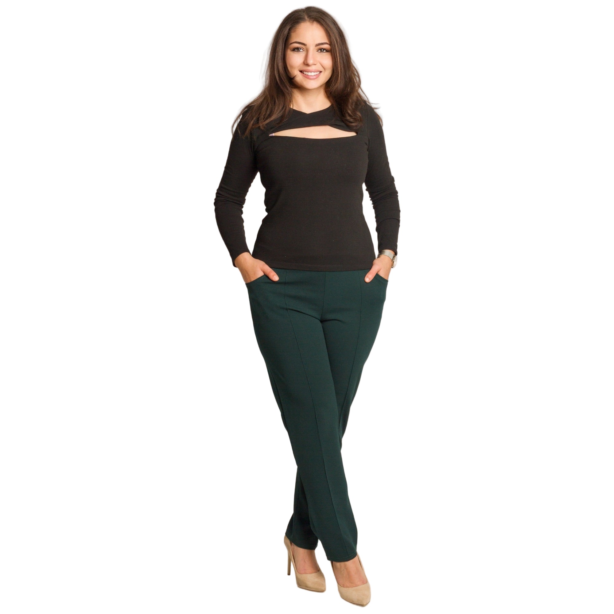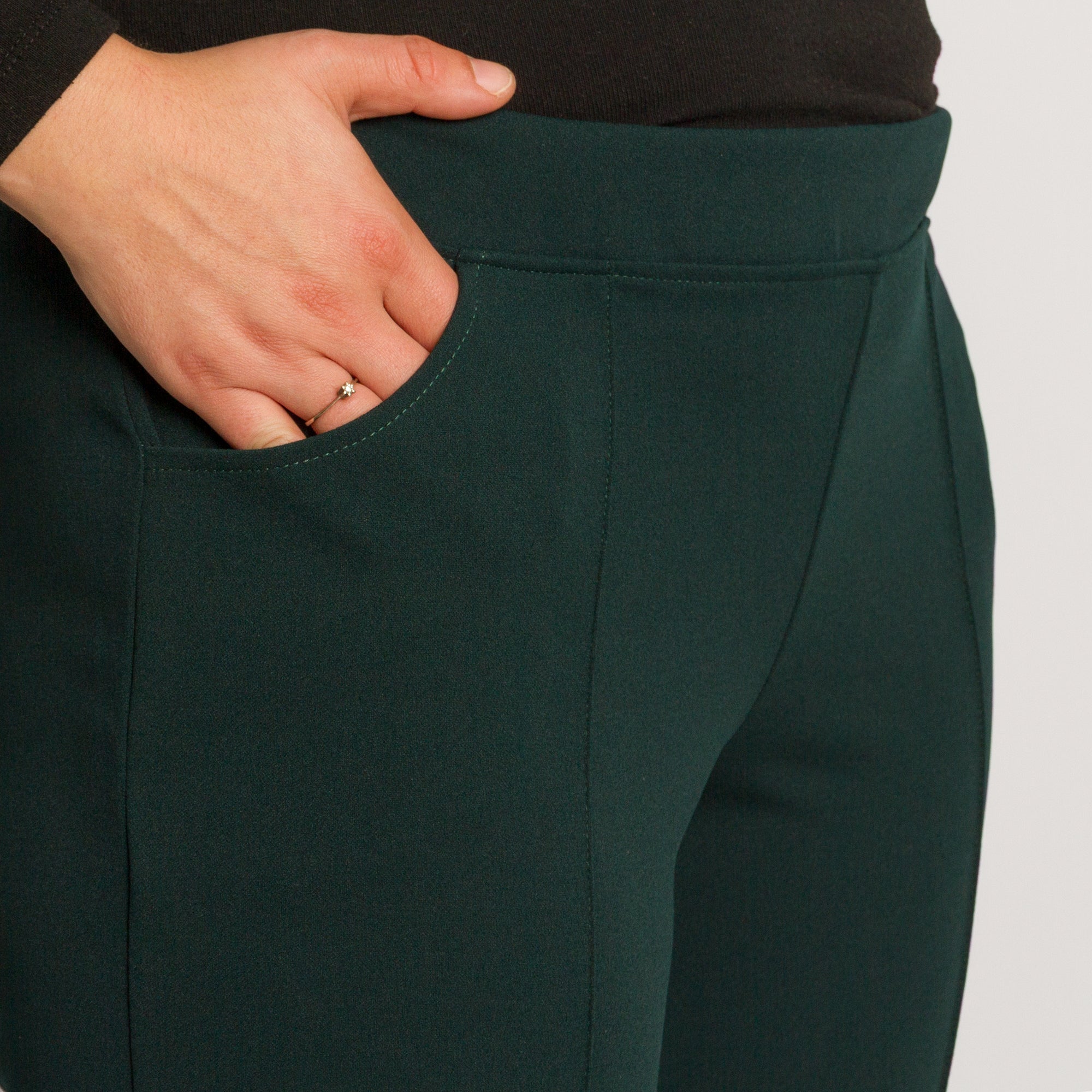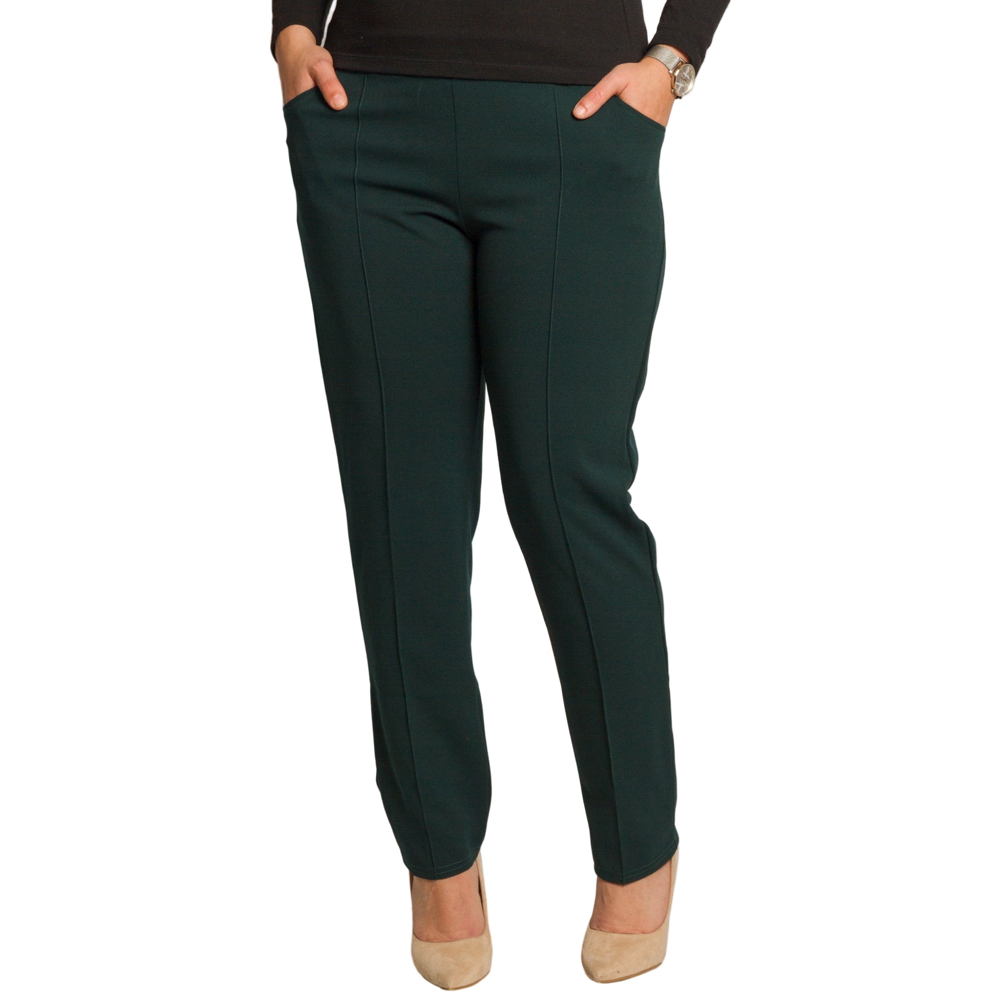 Този зелен панталон в големи размери съчетава стил и комфорт в перфектен баланс. Изработен от висококачествена материя с еластичност, той осигурява свобода на движение и изящен силует. Панталонът е с висока талия и удобен еластичен колан, който не пристяга и осигурява перфектно прилягане към тялото. Правата кройка издължава визуално краката, а декоративните шевове отпред добавят фин елегантен акцент. Джобовете в предната част правят модела практичен и подходящ както за ежедневието, така и за по-официални поводи.