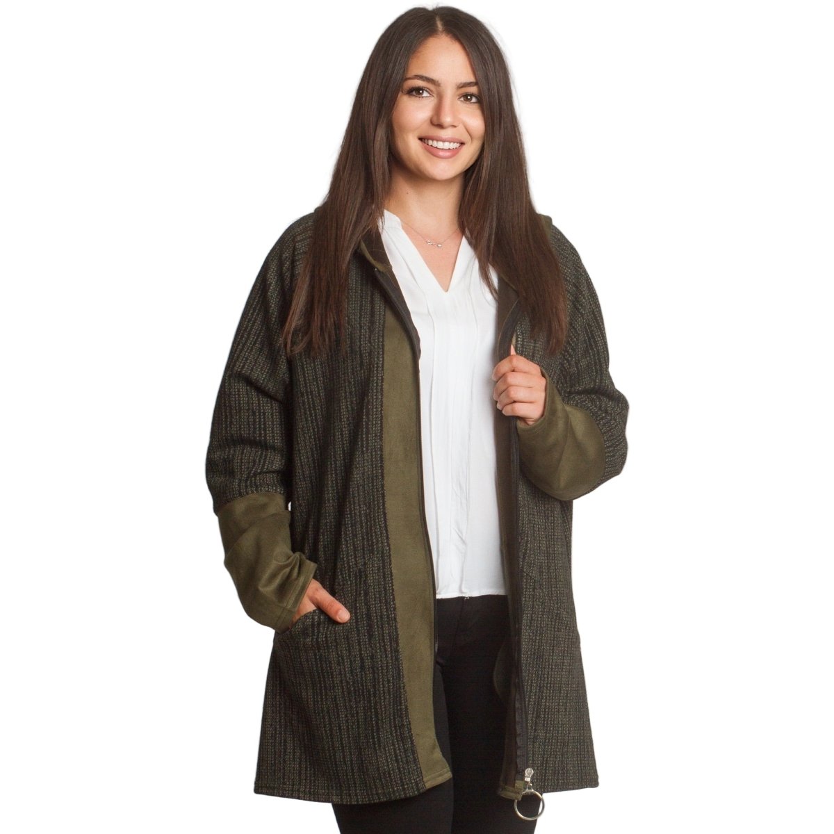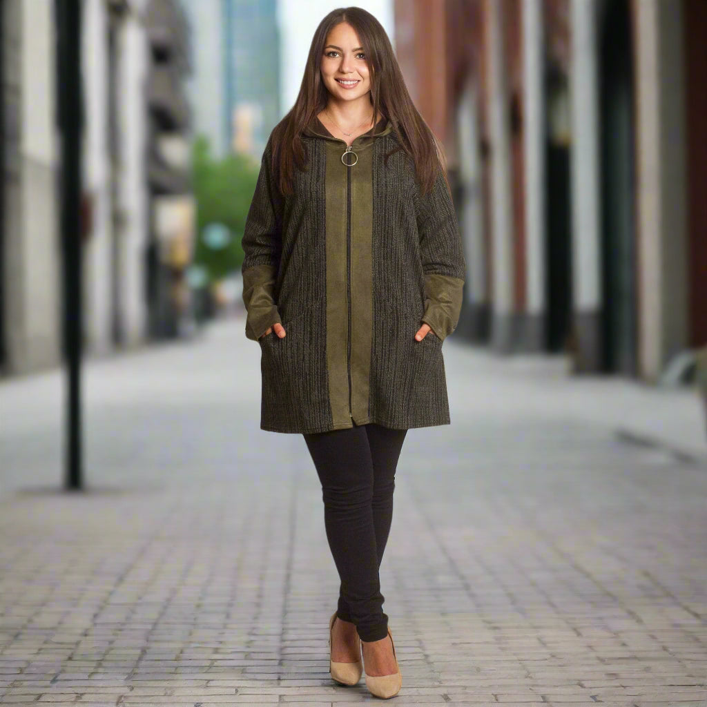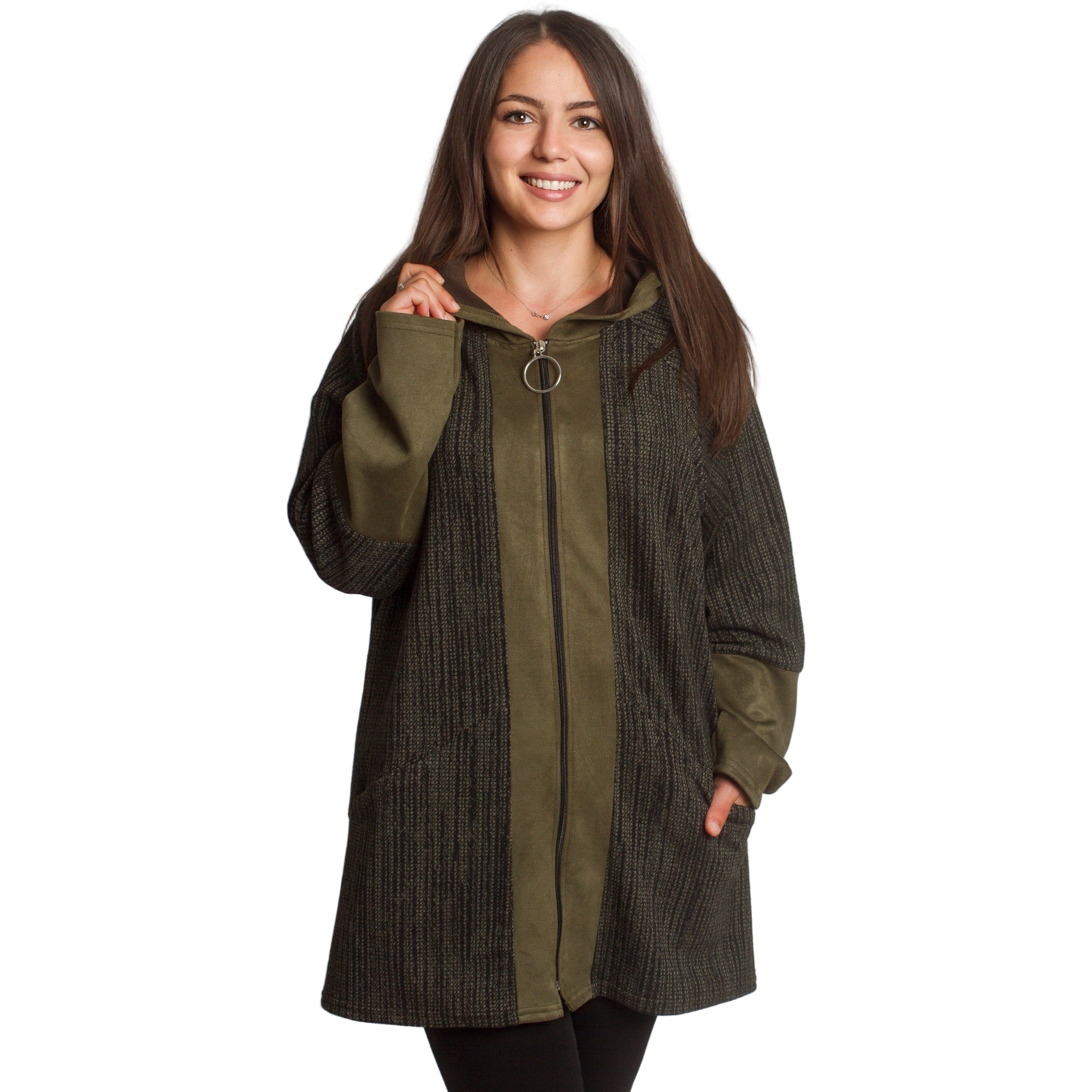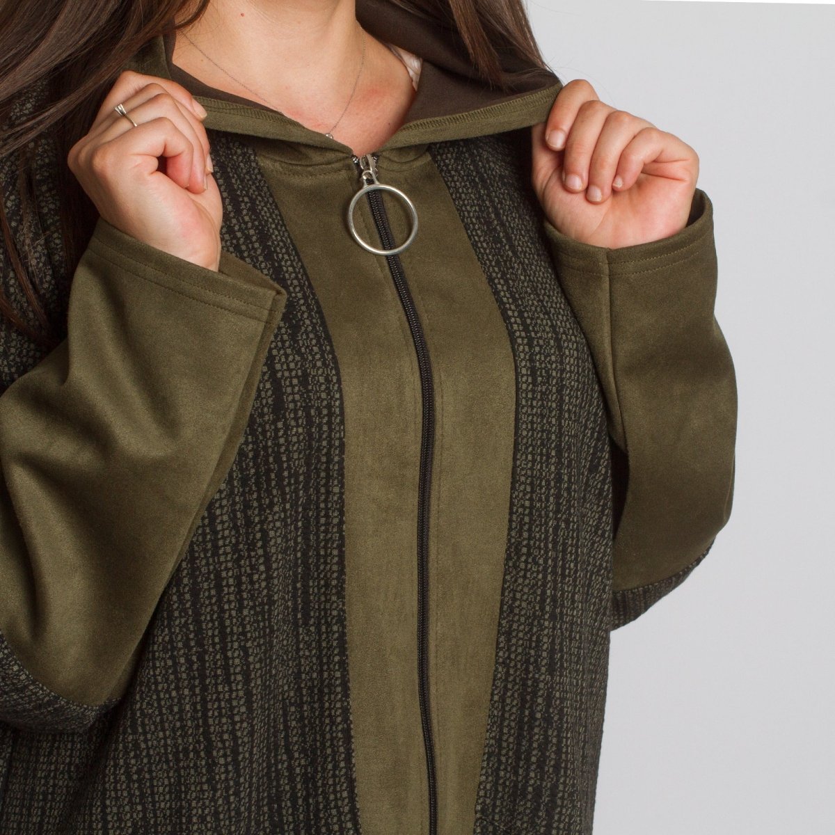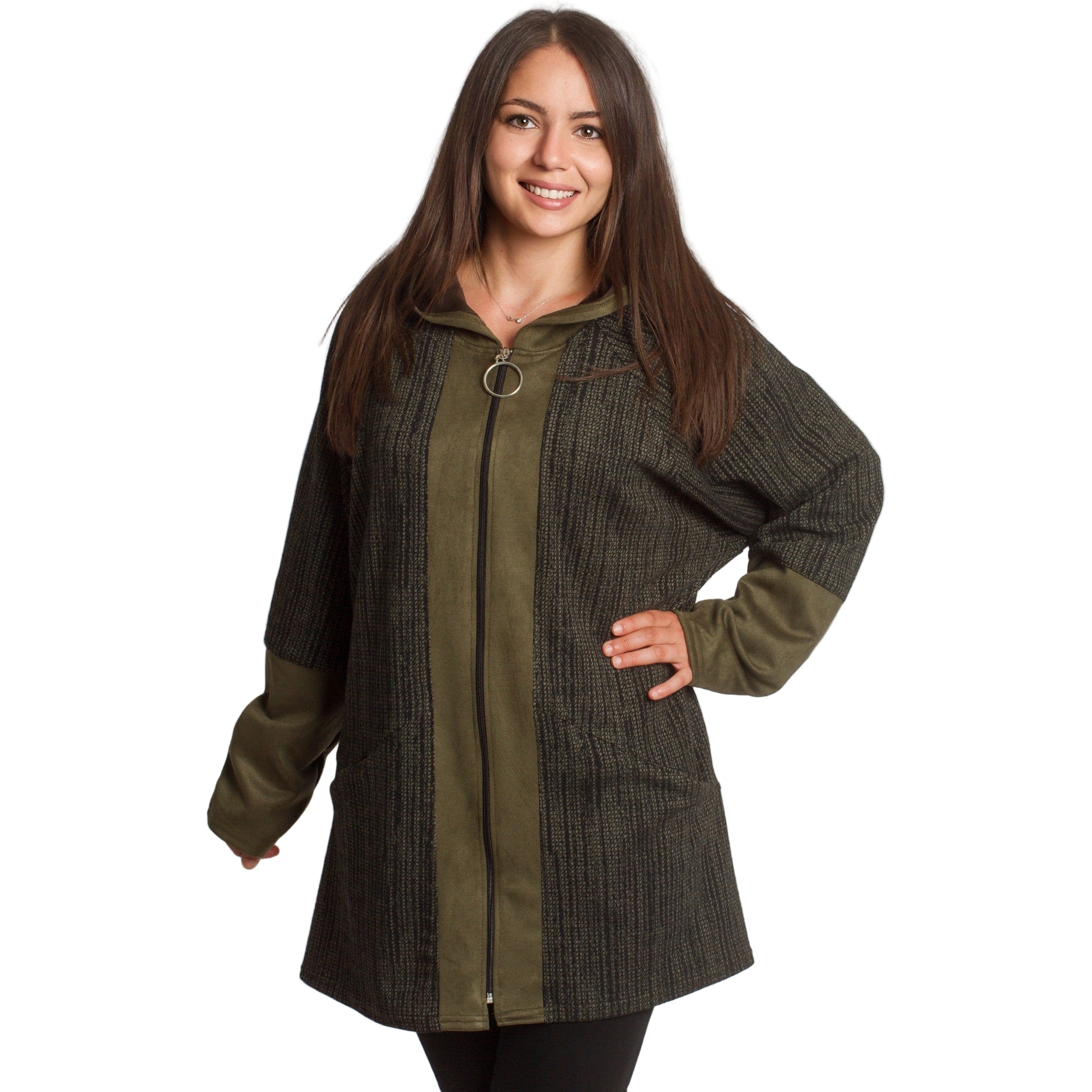 Стилен и удобен жакет в зелено, създаден за жени в големи размери. Моделът е с права кройка, дълъг цип отпред и декоративен халка-пулер, който придава модерна визия. Изработен е от висококачествена материя с еластичност, която осигурява комфорт и свобода на движение. Жакетът е снабден с практични джобове и удобна качулка, което го прави подходящ както за ежедневието, така и за по-официални поводи.