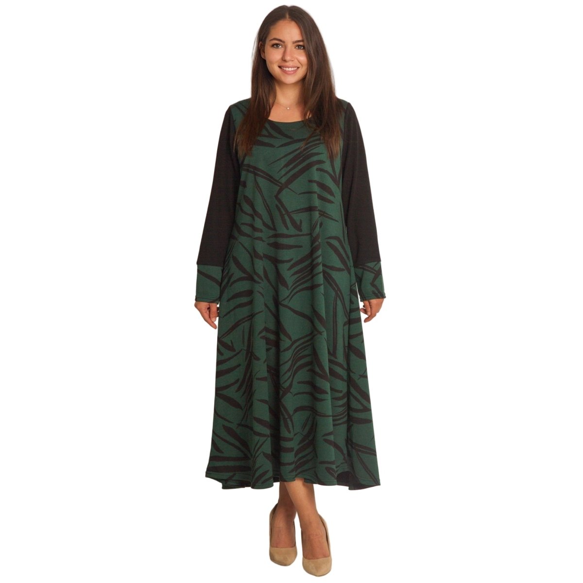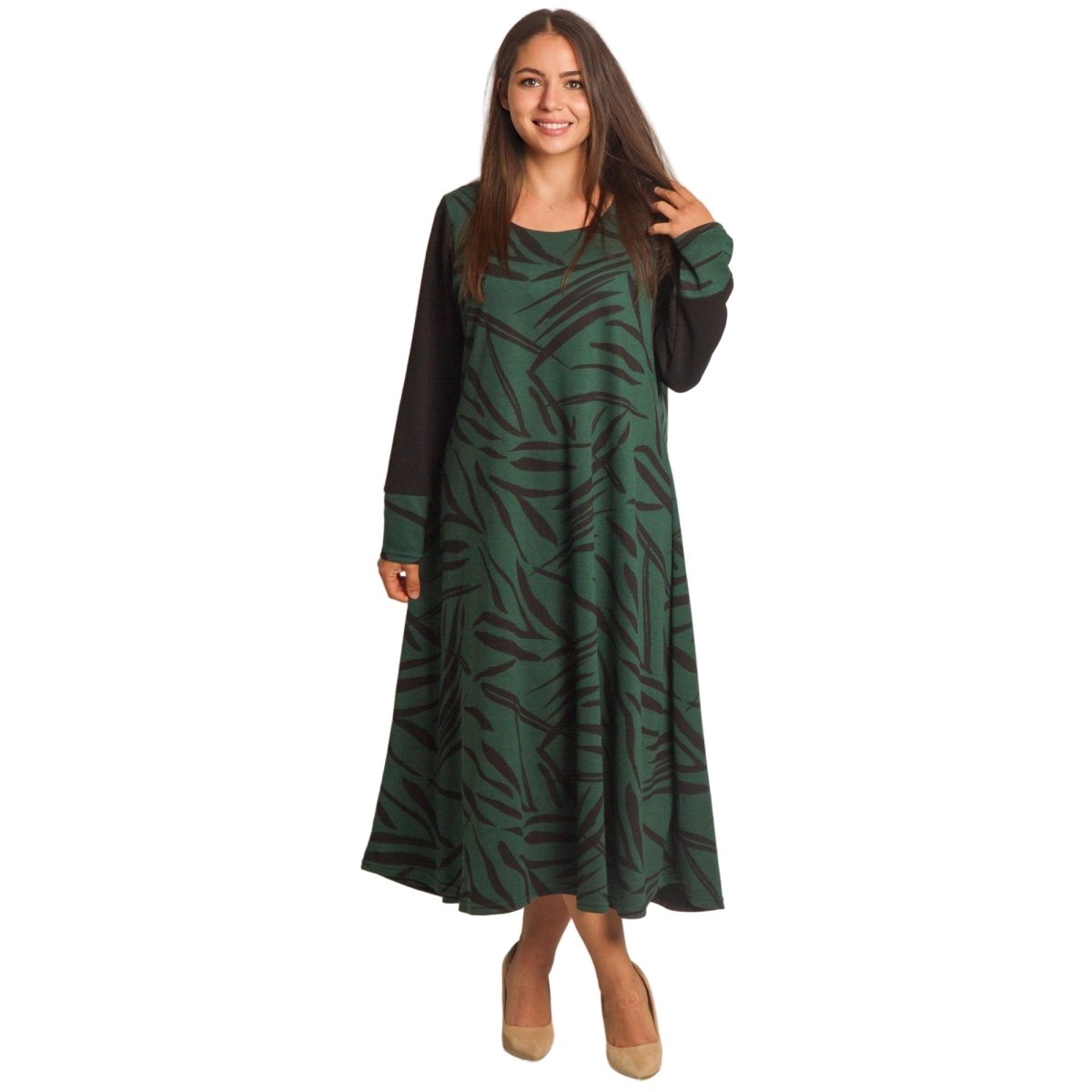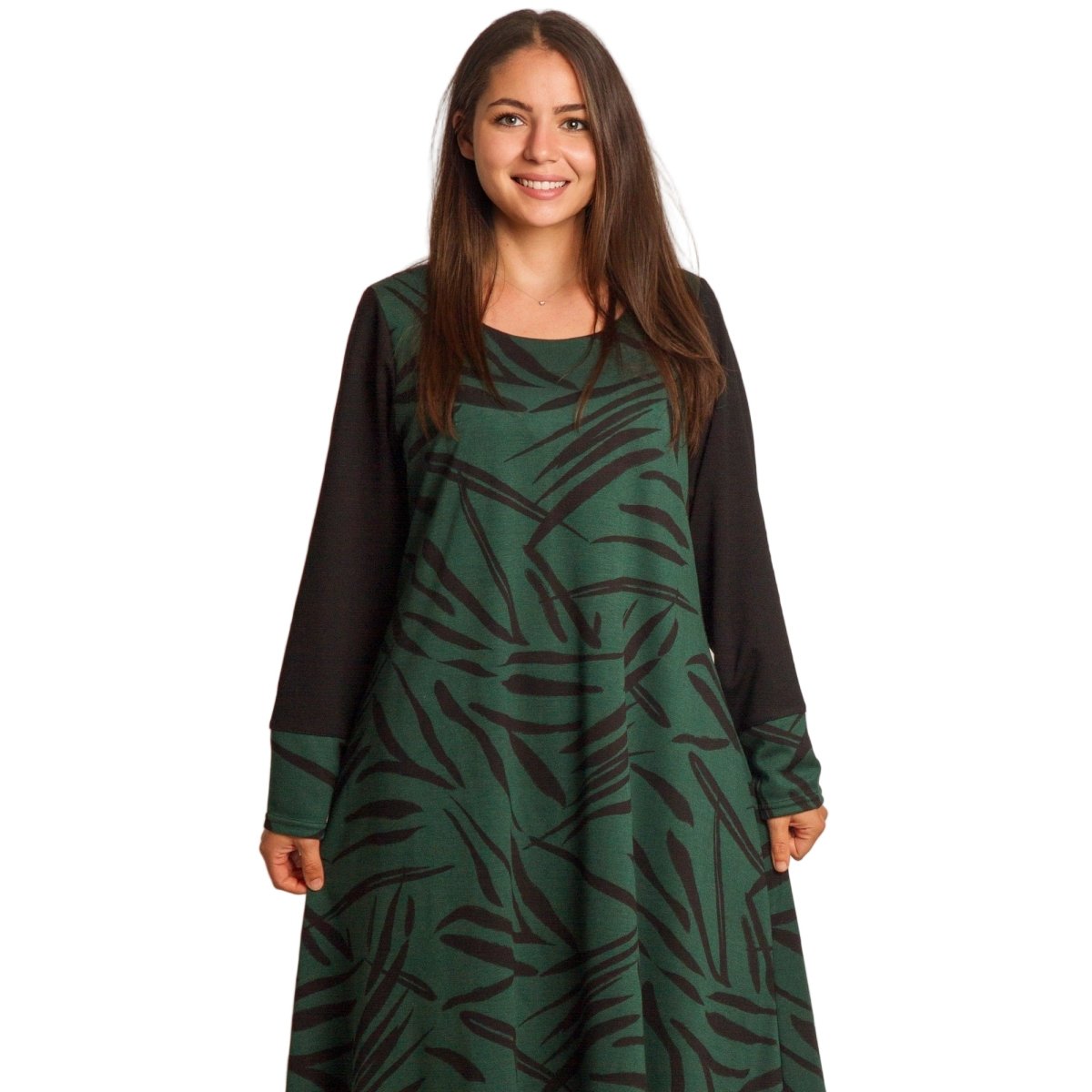 Елегантна зелена рокля с черни абстрактни мотиви, изработена от висококачествена материя с еластичност за комфорт и свобода на движение. Моделът е с дълги ръкави в черно, които придават изтънчен контраст. Разкроената кройка подчертава женствеността и осигурява лекота при носене. Подходяща е както за ежедневни поводи, така и за официални събития през есенно-зимния сезон.