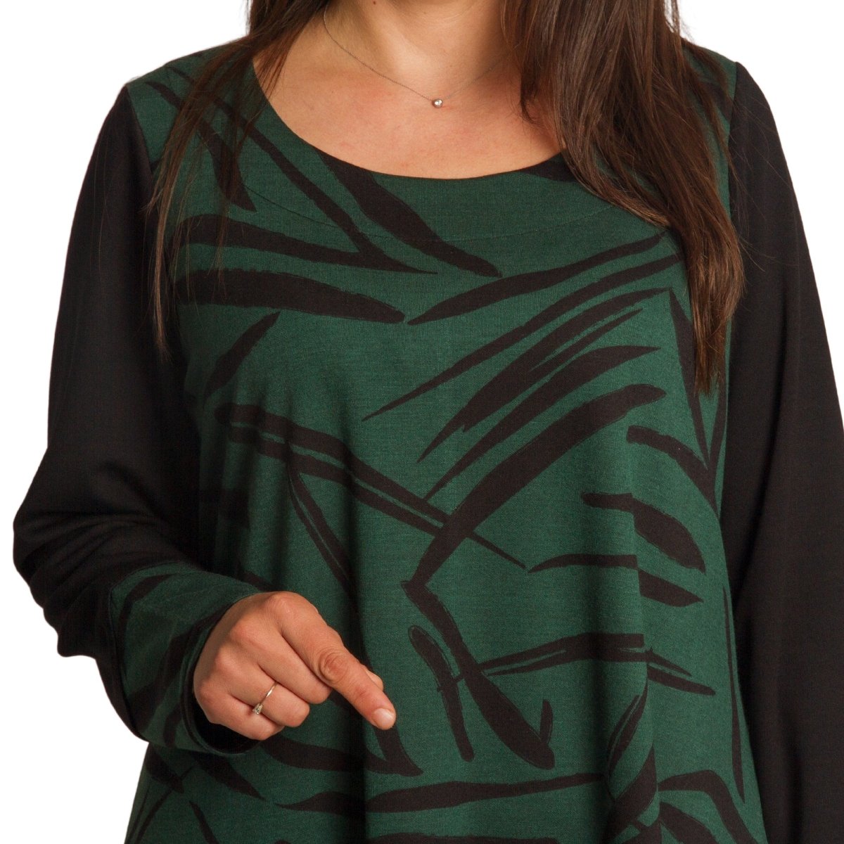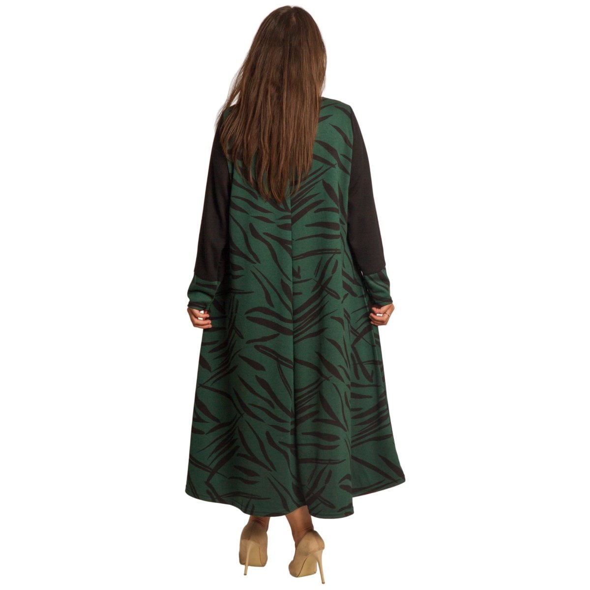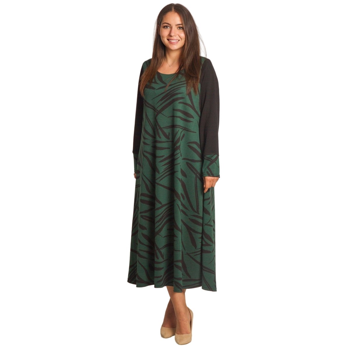 Елегантна зелена рокля с черни абстрактни мотиви, изработена от висококачествена материя с еластичност за комфорт и свобода на движение. Моделът е с дълги ръкави в черно, които придават изтънчен контраст. Разкроената кройка подчертава женствеността и осигурява лекота при носене. Подходяща е както за ежедневни поводи, така и за официални събития през есенно-зимния сезон.
