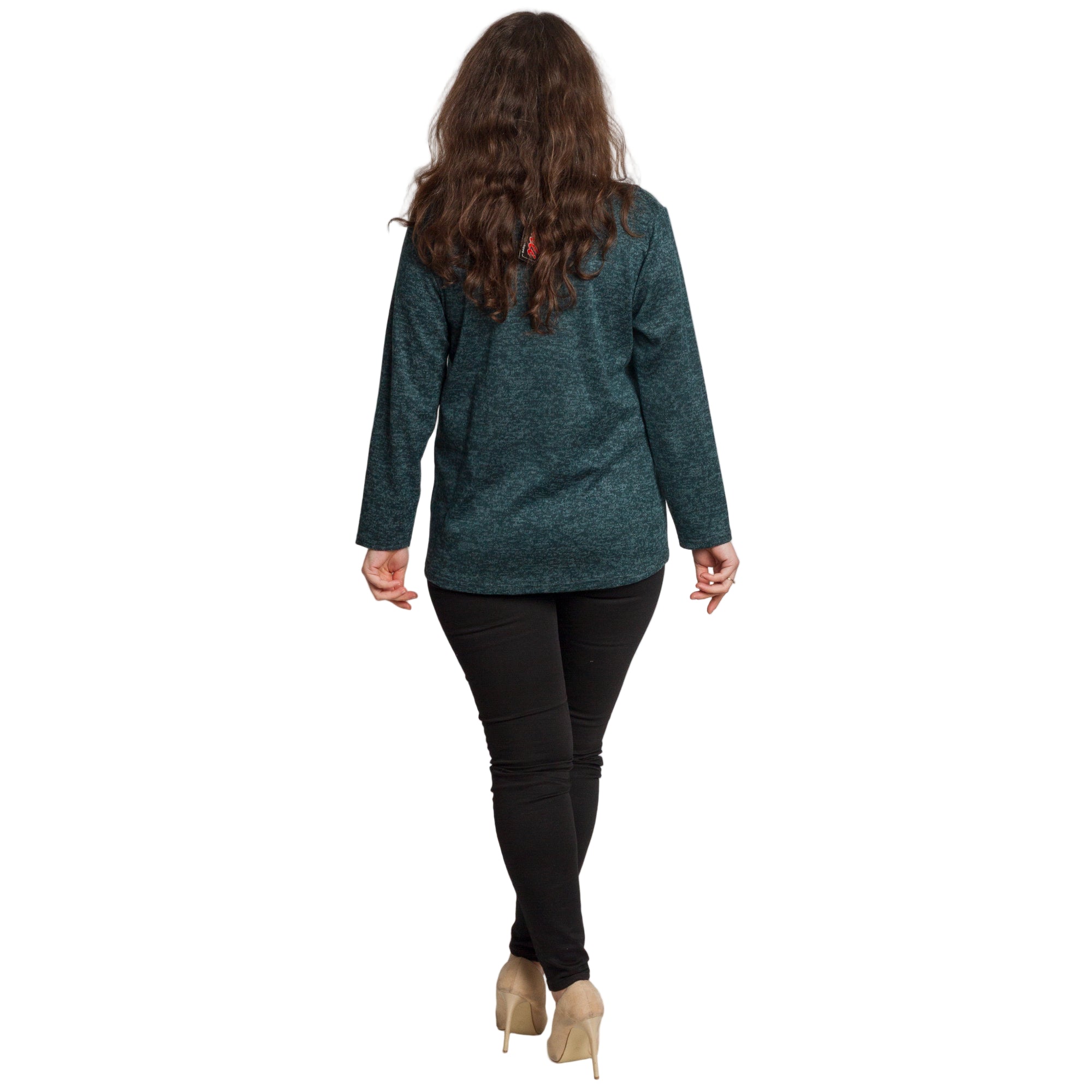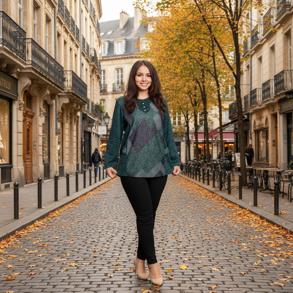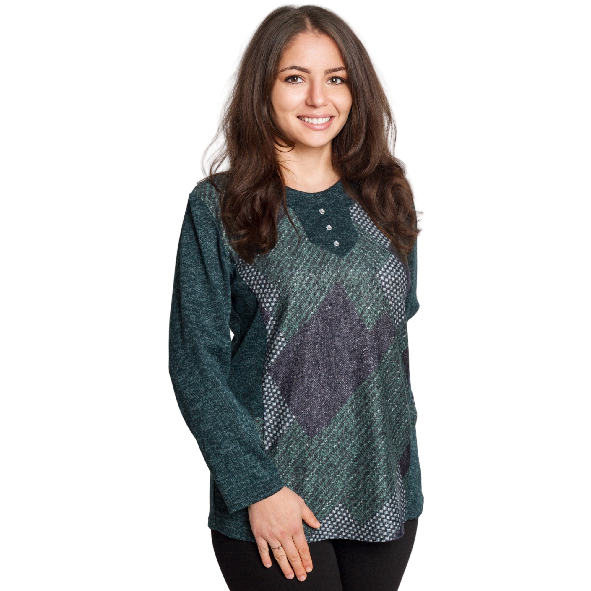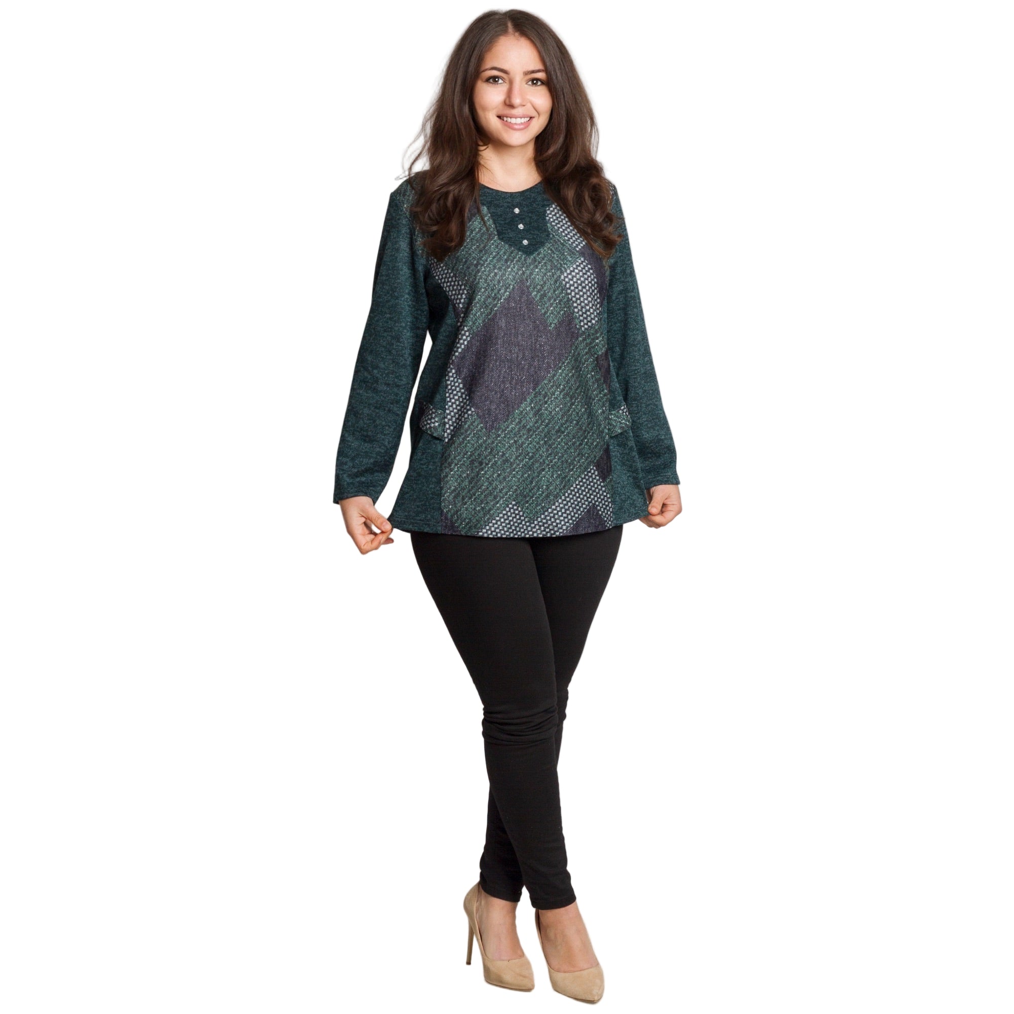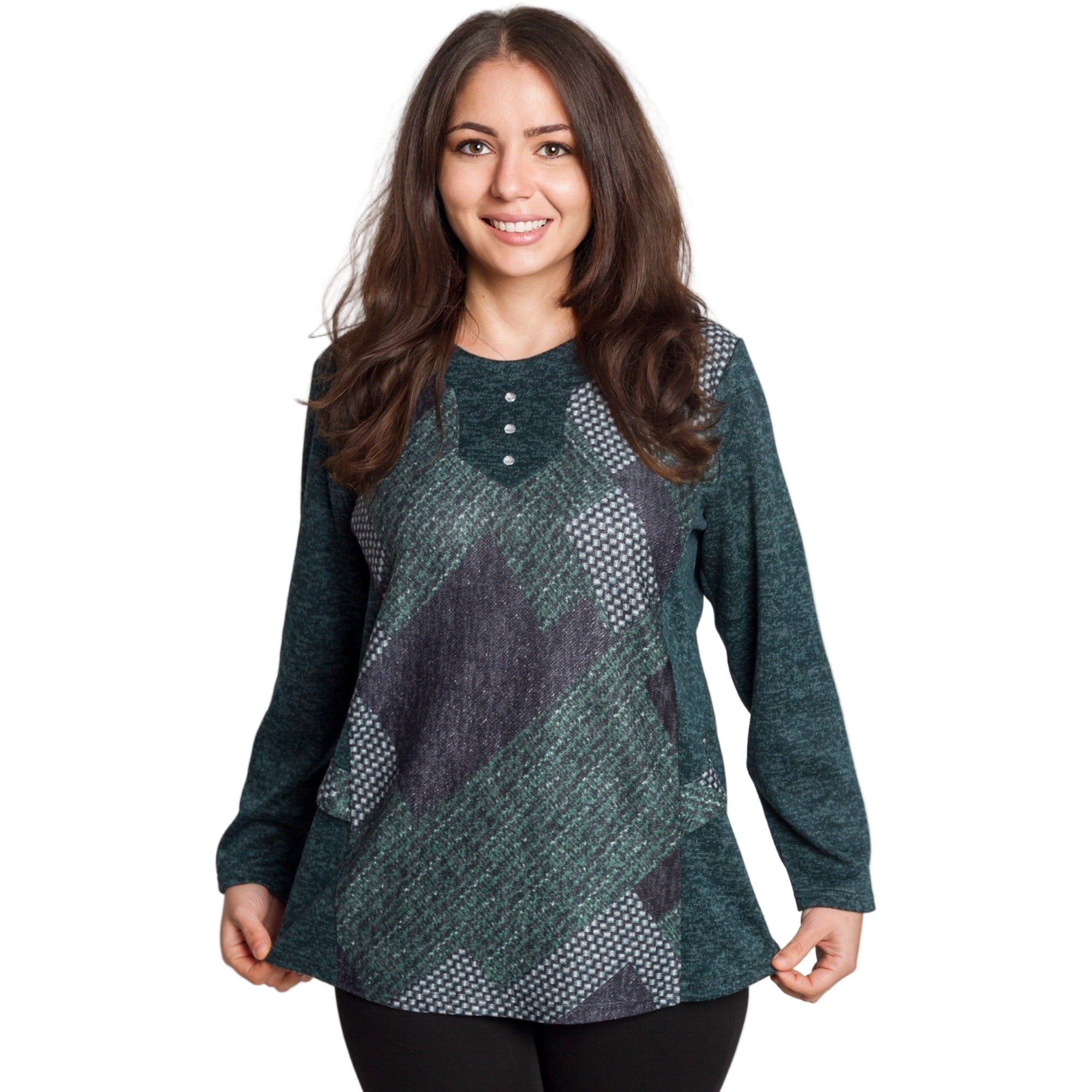Тази зелена туника е модерно и удобно решение за ежедневието. Предната част е с ефектен геометричен принт, който създава визуален интерес и издължава силуета. Материята е мека, еластична и приятна на допир – подходяща за целодневно носене през есенно-зимния сезон. Облото деколте е допълнено с декоративни копчета, които добавят стилен акцент. Правата кройка пада свободно по тялото и прикрива ханша и коремната област, което я прави чудесен избор за комбиниране с клин, дънки или панталон.