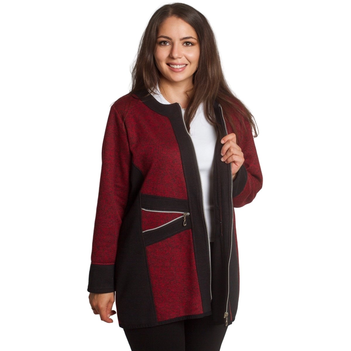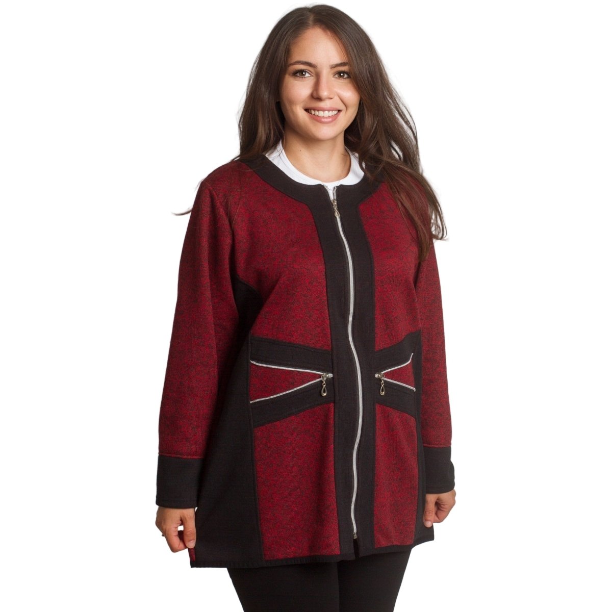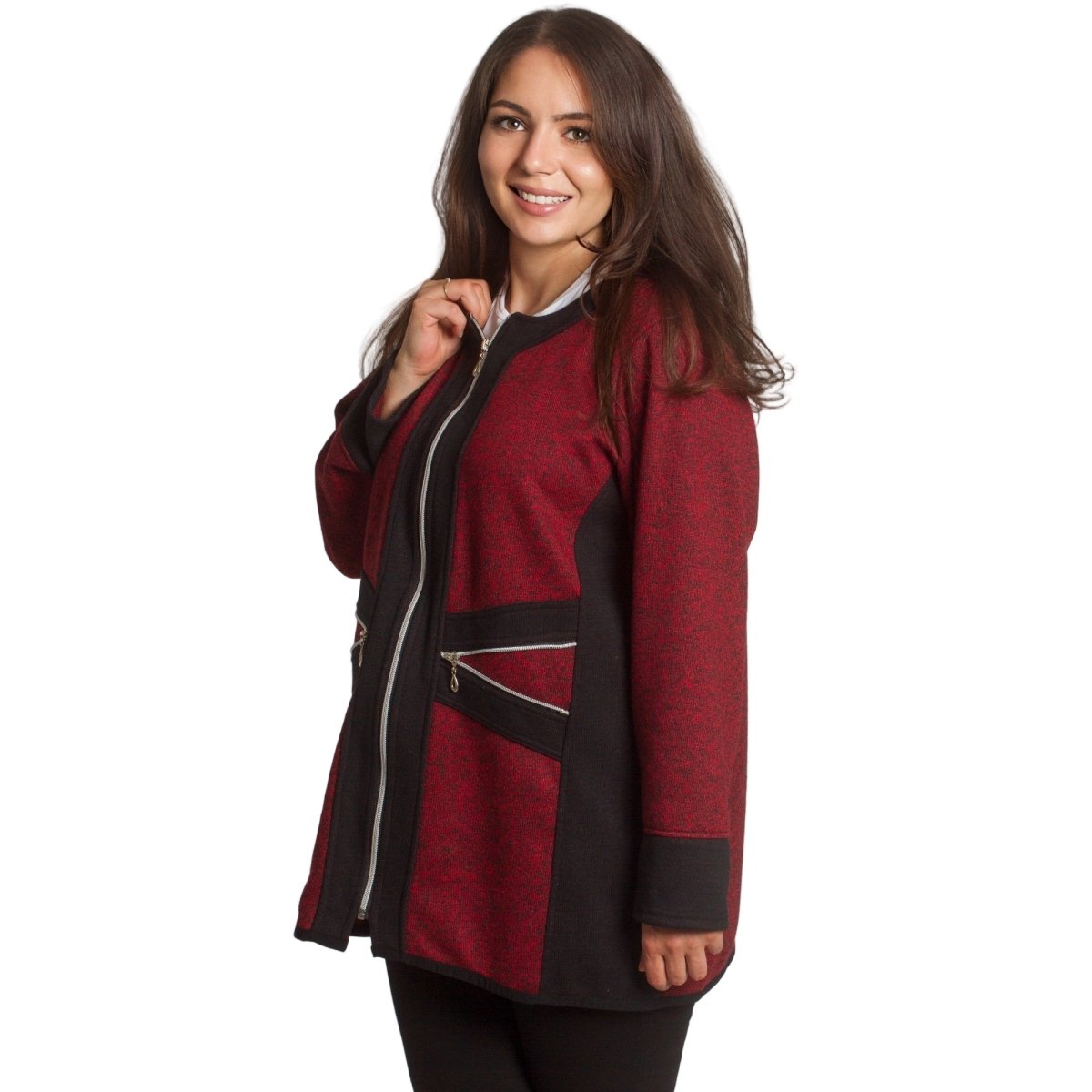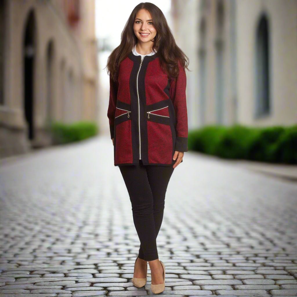 Стилен жакет в бордо с черни акценти и цип отпред, който съчетава удобство и елегантност. Моделът е с права кройка и два декоративни джоба с цип, подчертаващи модерната му визия. Изработен е от мека и еластична материя, която осигурява комфорт през целия ден. Подходящ както за ежедневието, така и за по-официални поводи.