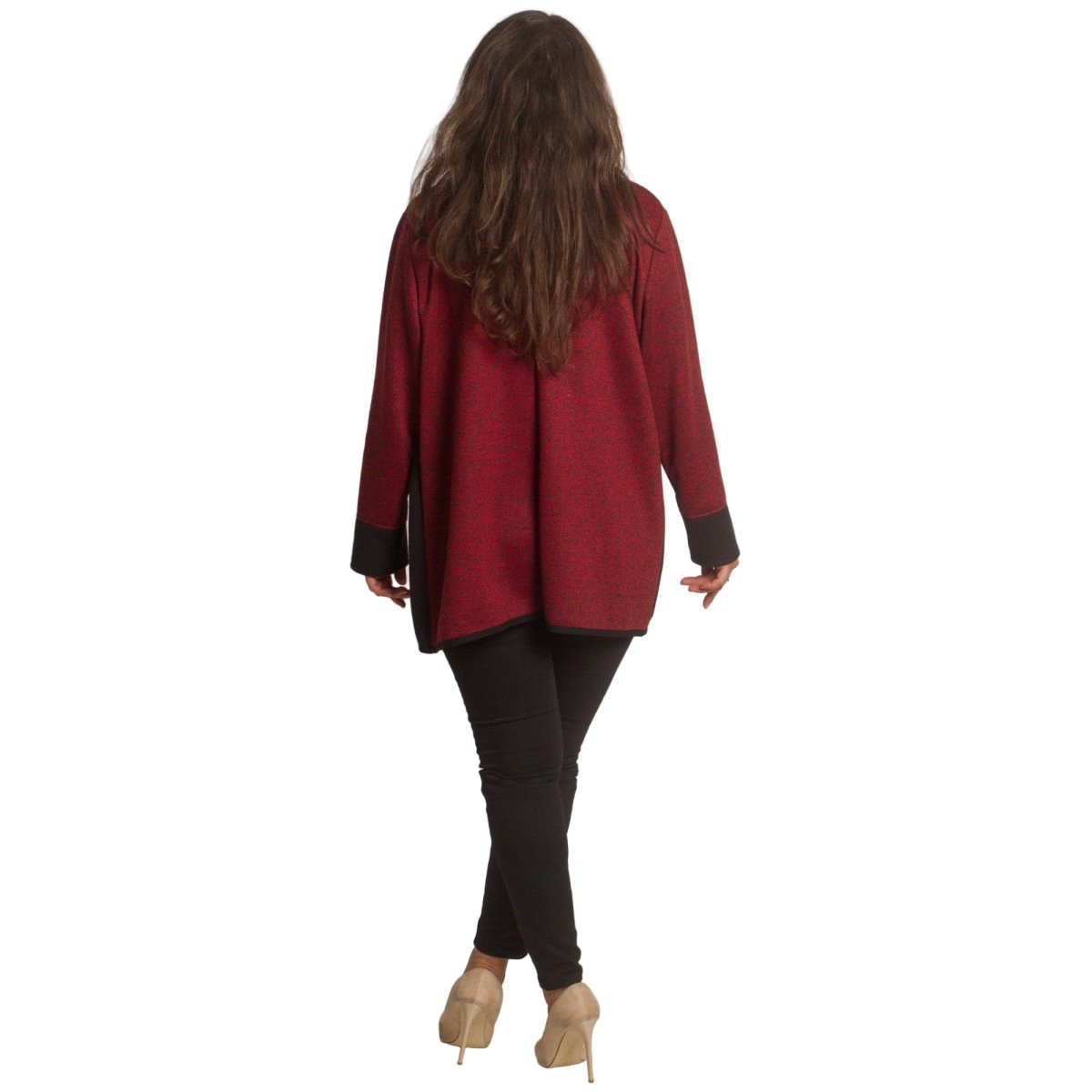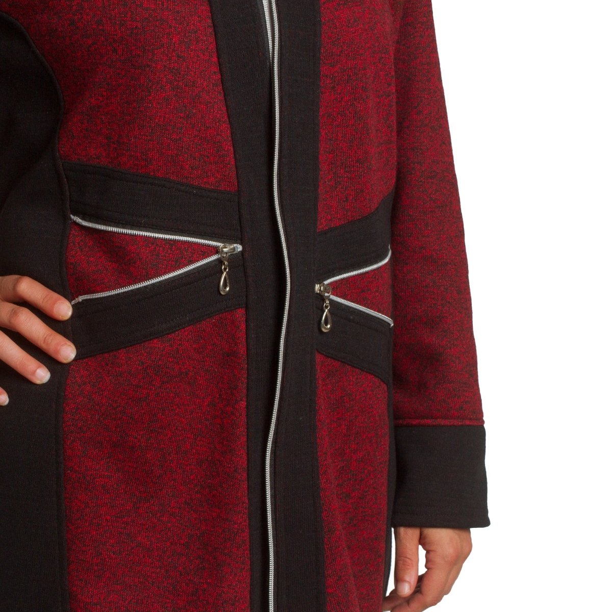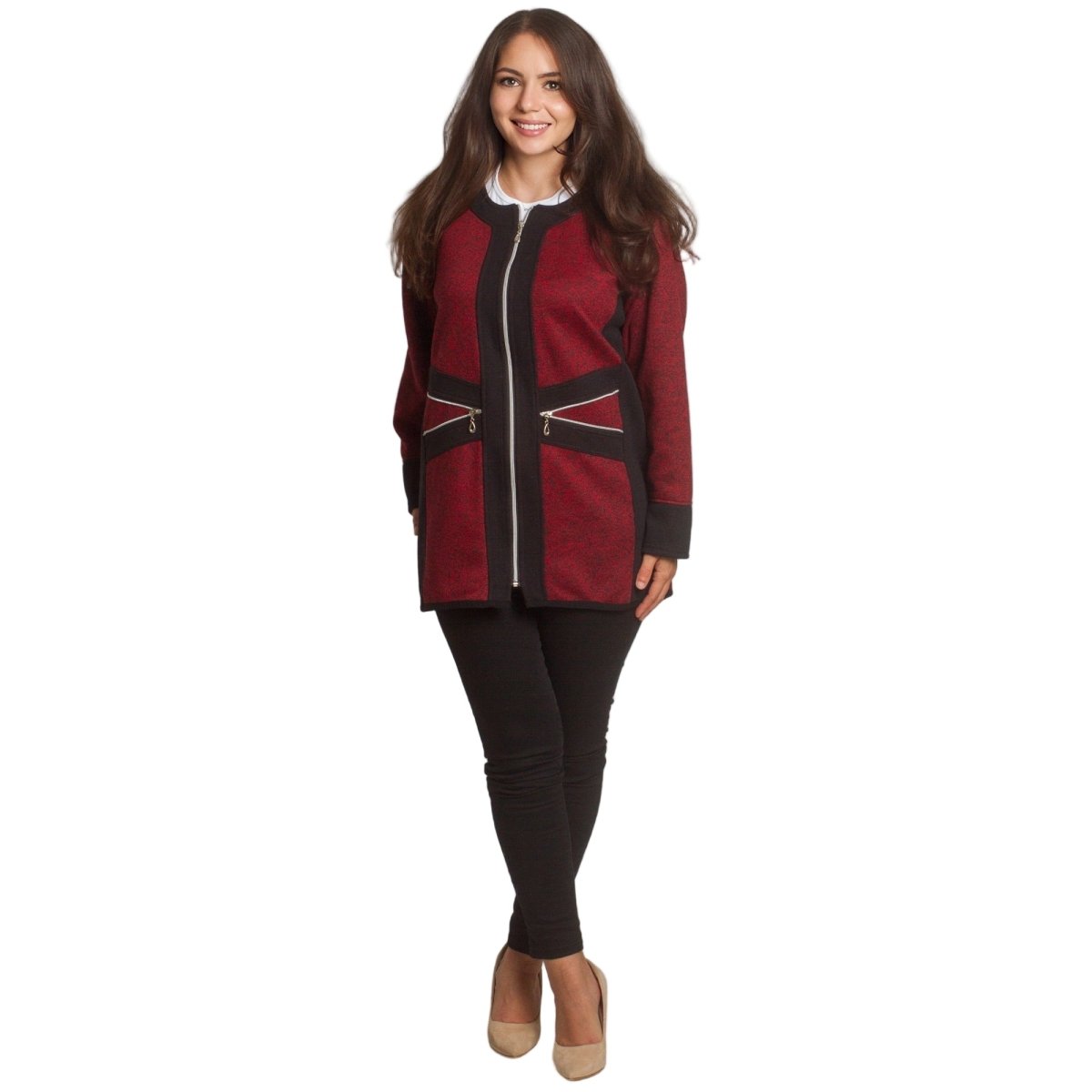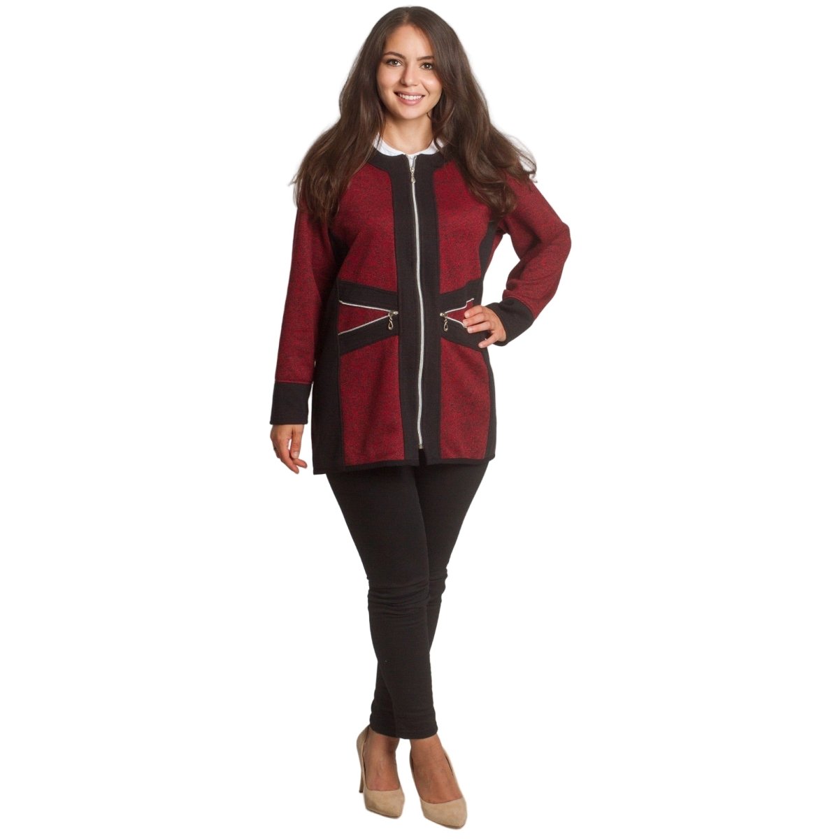 Стилен жакет в бордо с черни акценти и цип отпред, който съчетава удобство и елегантност. Моделът е с права кройка и два декоративни джоба с цип, подчертаващи модерната му визия. Изработен е от мека и еластична материя, която осигурява комфорт през целия ден. Подходящ както за ежедневието, така и за по-официални поводи.