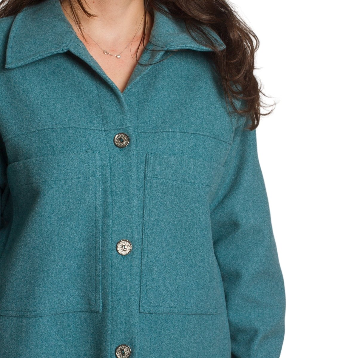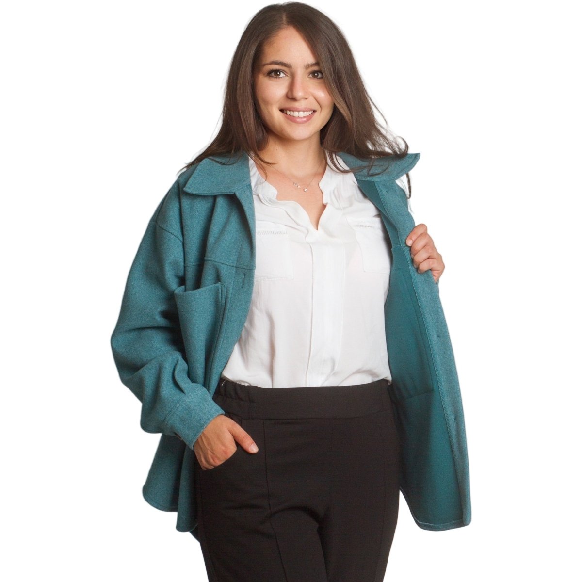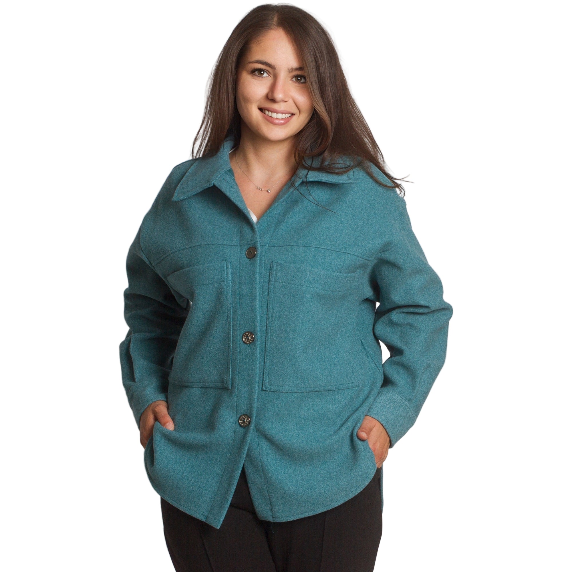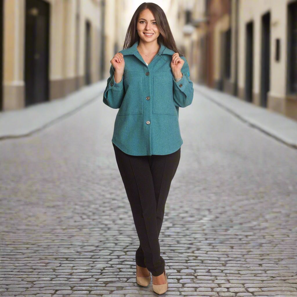 Елегантен жакет в модерен петролен нюанс, съчетаващ удобство и стил. Изработен от висококачествена материя с еластан, моделът осигурява комфорт и леко прилепване по тялото. Дизайнът е с права кройка, класическа яка и практични джобове, което го прави подходящ както за ежедневието, така и за по-официални поводи. Закопчаването е с големи декоративни копчета, които придават изискан акцент на визията. Идеален избор за есенно-зимния сезон.