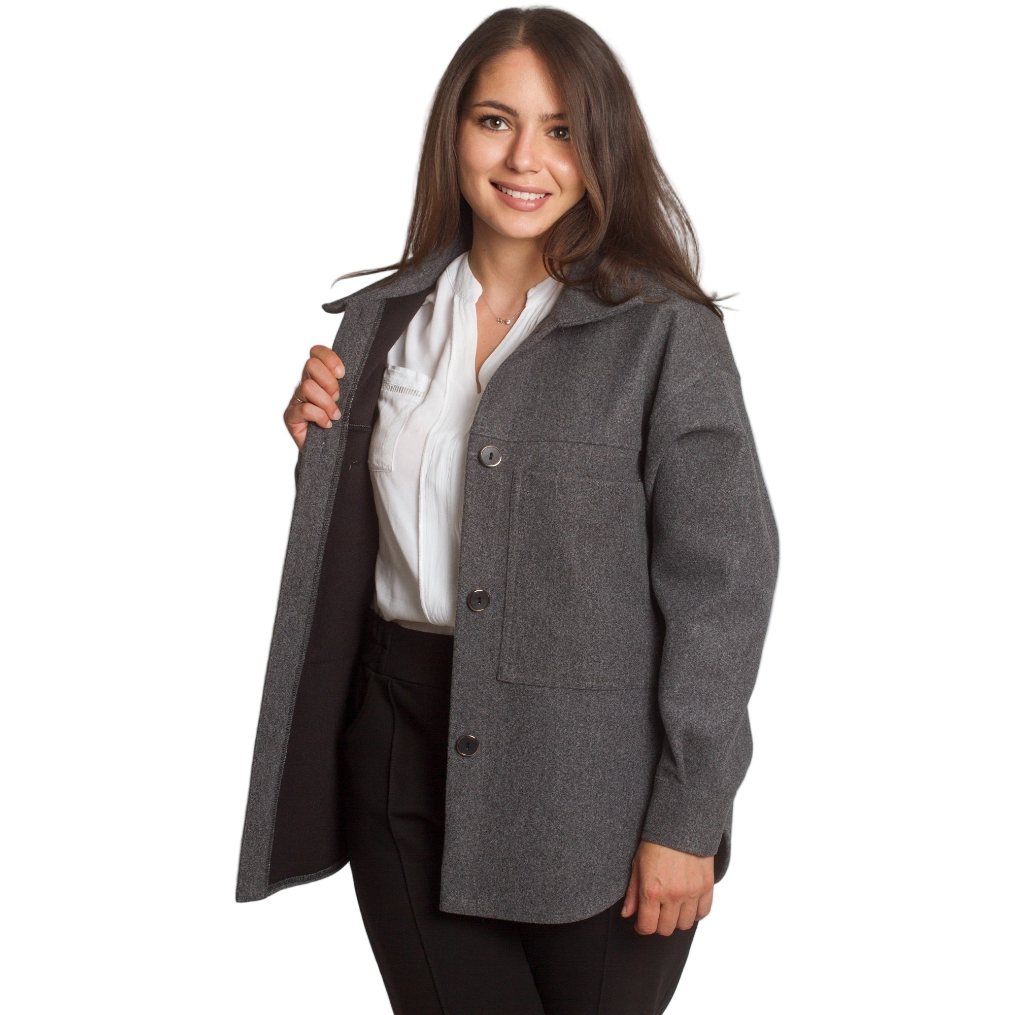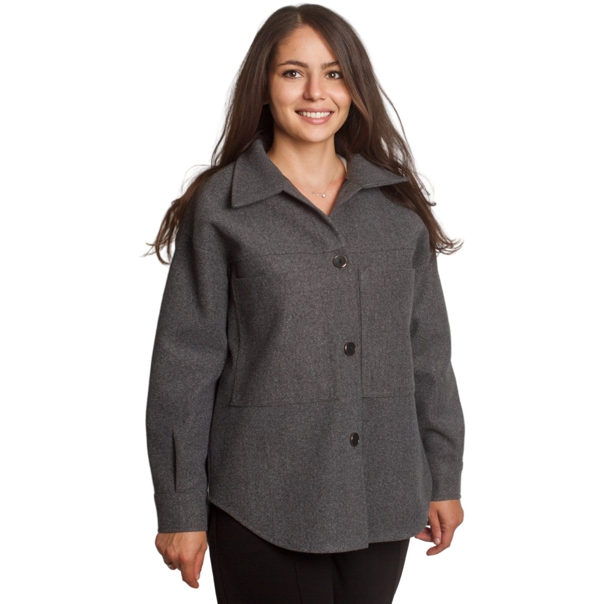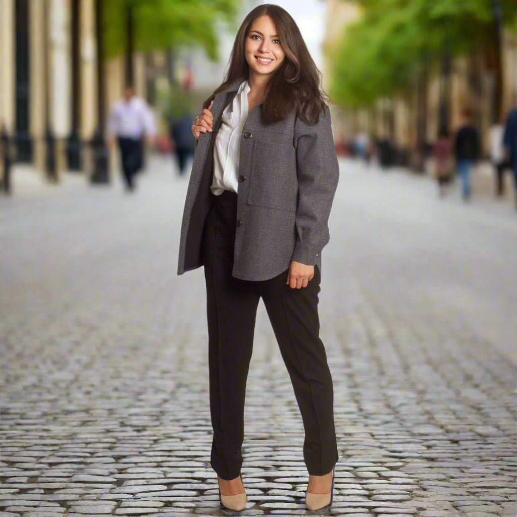 Стилен и практичен жакет в тъмно сив нюанс, който съчетава удобство и изисканост. Моделът е с права кройка и класическа яка, допълнен с големи декоративни копчета и два предни джоба. Изработен от висококачествена материя с еластан, жакетът осигурява комфорт и лекота при носене. Подходящ е както за ежедневието, така и за по-официални поводи. Идеален за есенно-зимния сезон.