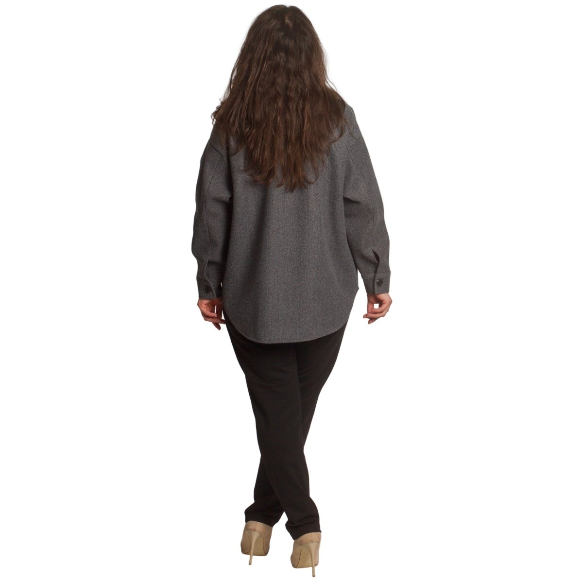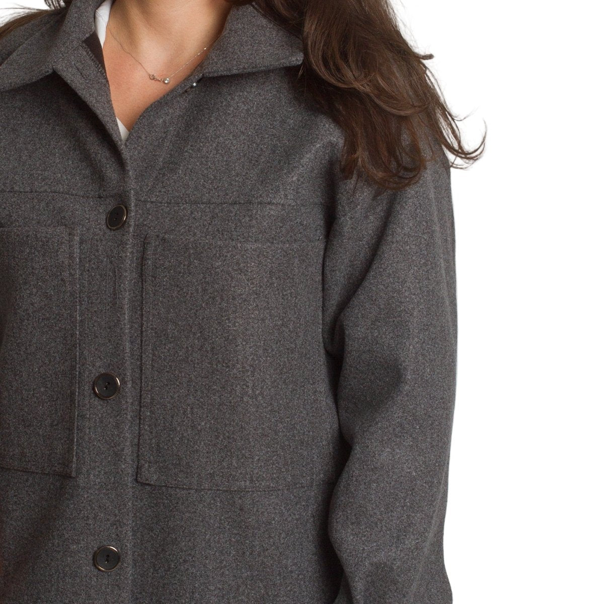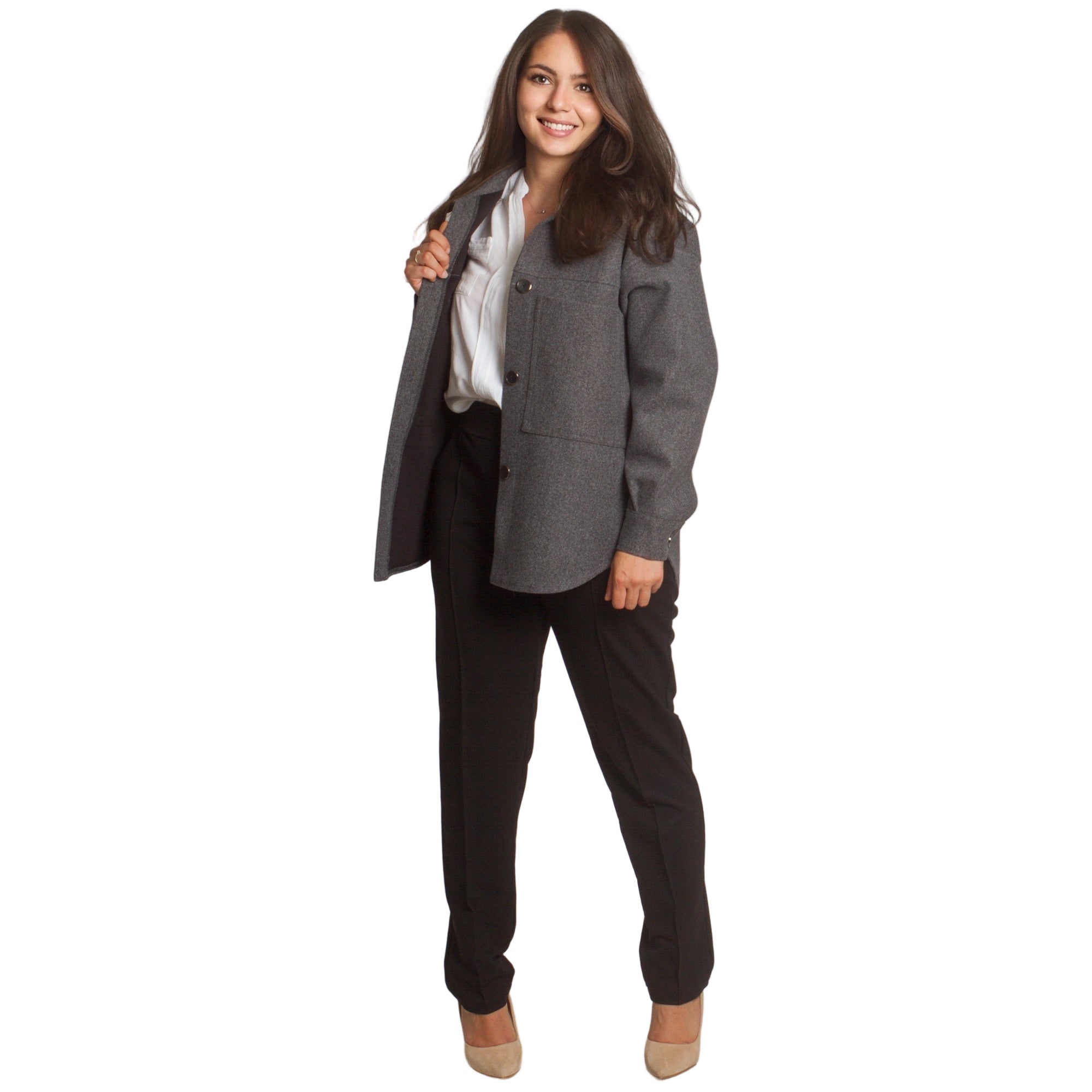 Стилен и практичен жакет в тъмно сив нюанс, който съчетава удобство и изисканост. Моделът е с права кройка и класическа яка, допълнен с големи декоративни копчета и два предни джоба. Изработен от висококачествена материя с еластан, жакетът осигурява комфорт и лекота при носене. Подходящ е както за ежедневието, така и за по-официални поводи. Идеален за есенно-зимния сезон.