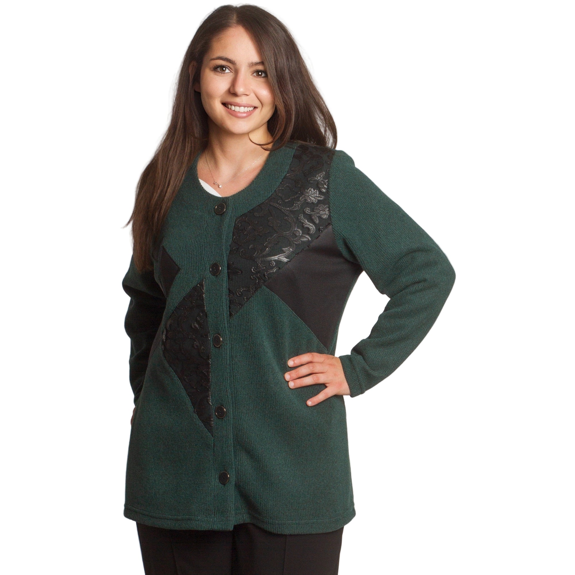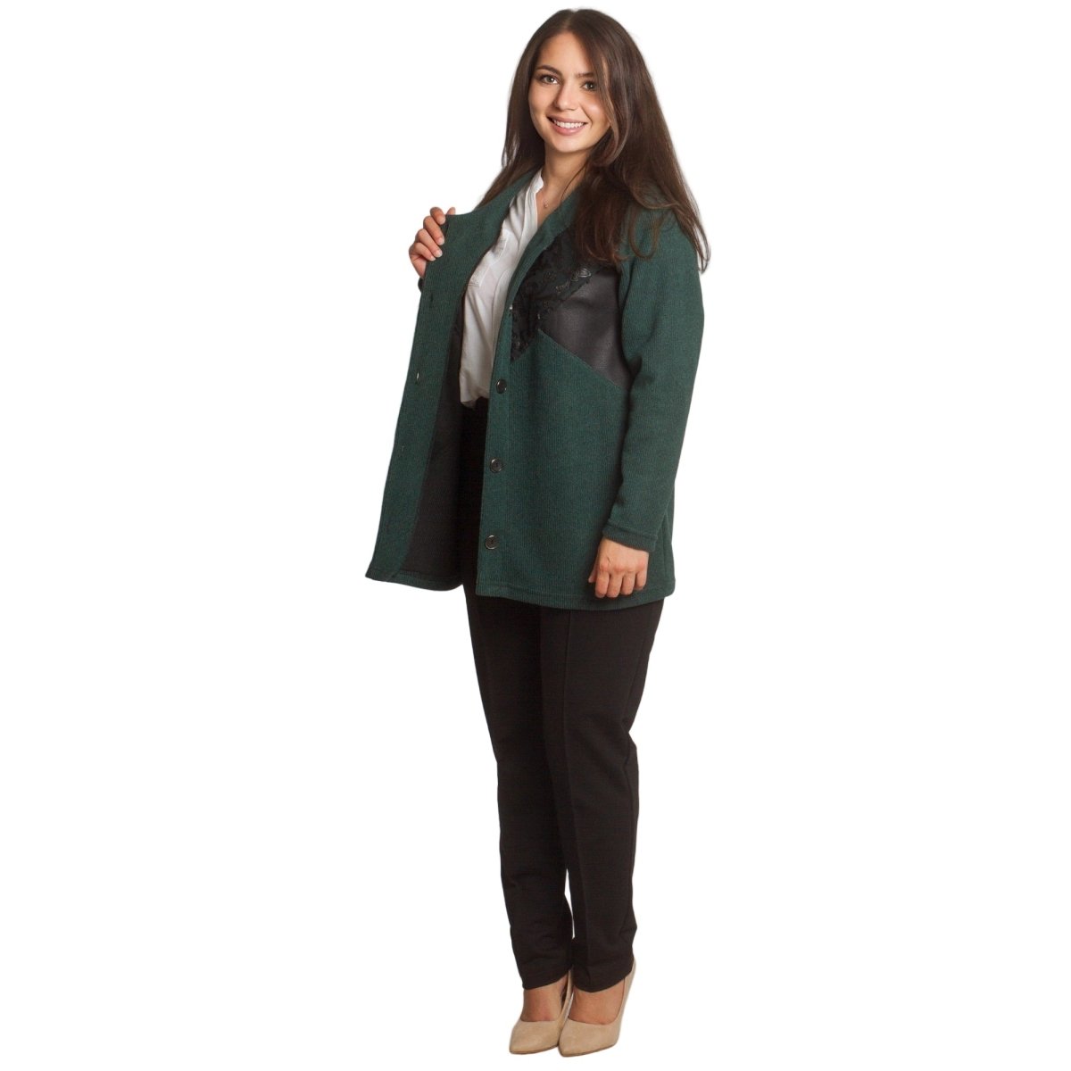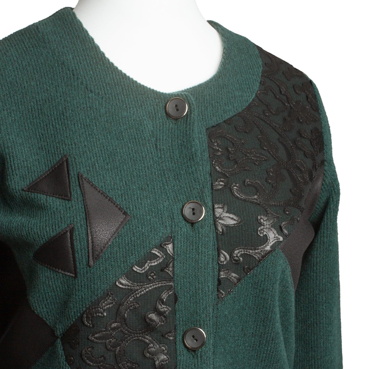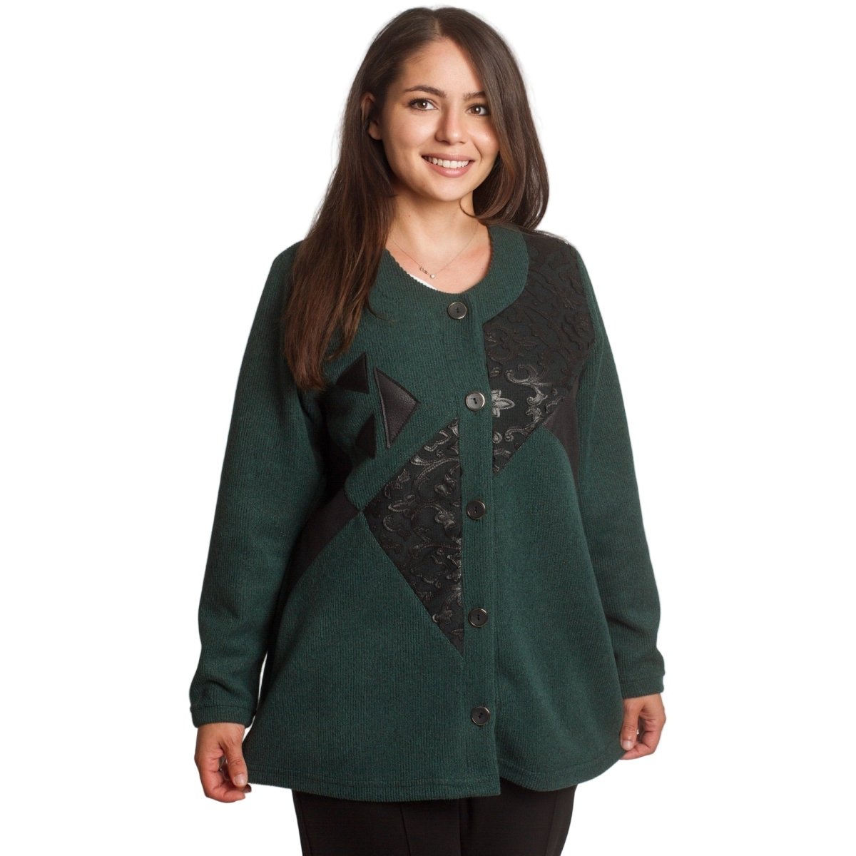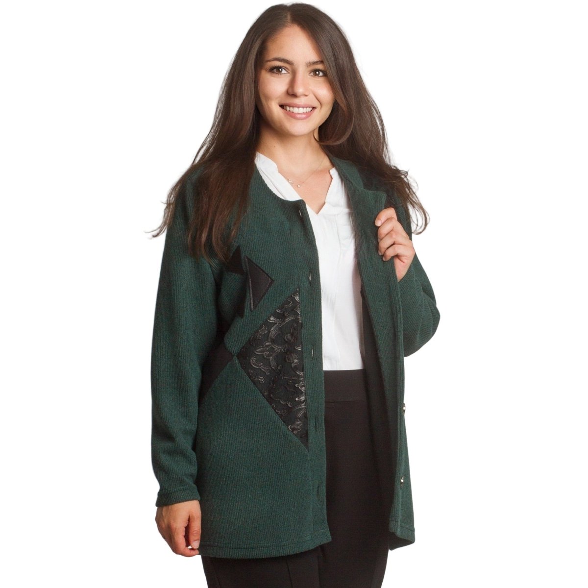 Елегантен жакет в наситен зелен цвят с уникален дизайн. Моделът е с обло деколте и свободна кройка, което го прави удобен и подходящ за жени, предпочитащи комфорт и стил. Декоративните апликации от еко кожа и релефни мотиви отпред придават изискан и модерен акцент. Закопчава се с копчета по цялата дължина. Жакетът е идеален както за ежедневни визии, така и за по-официални поводи през есенно-зимния сезон.
