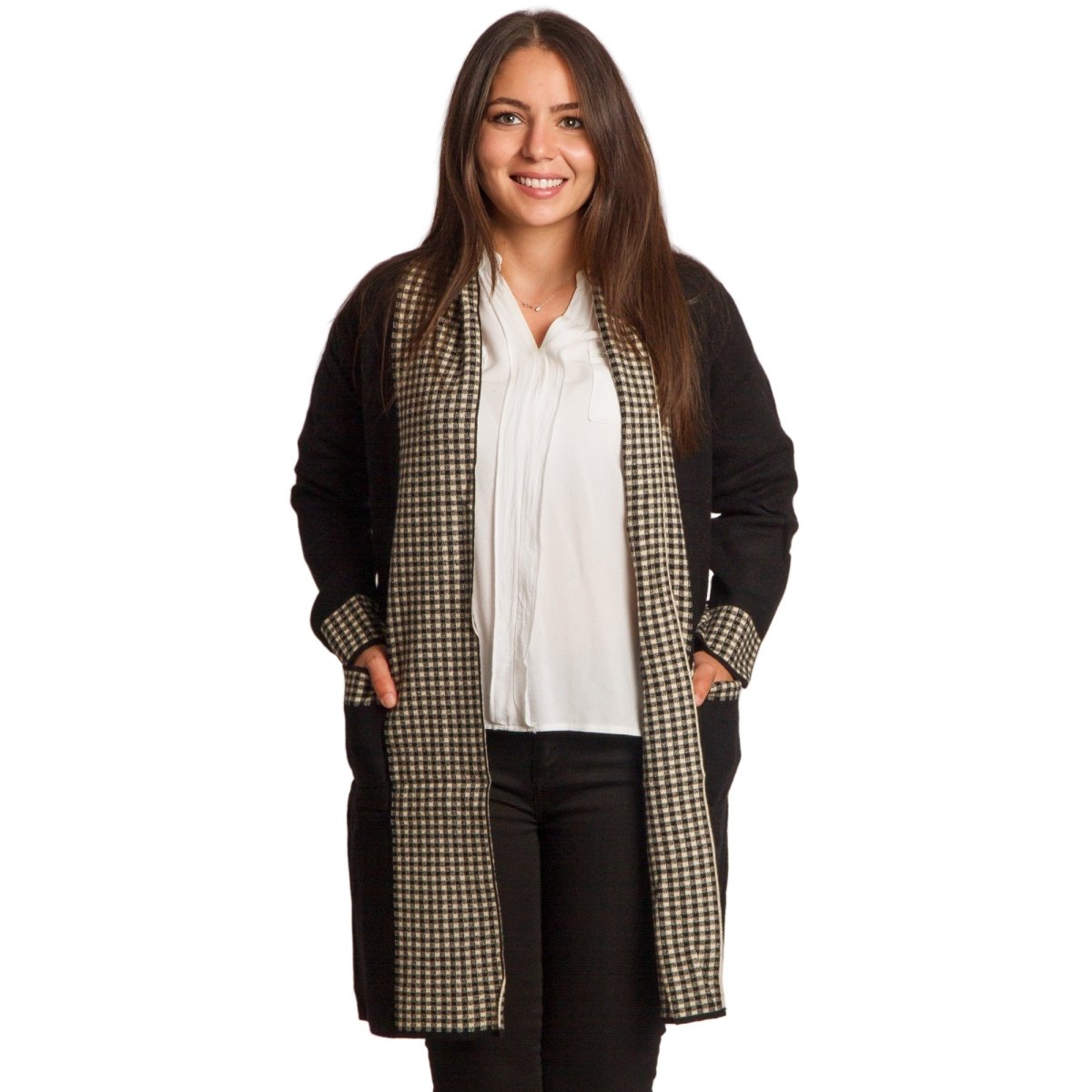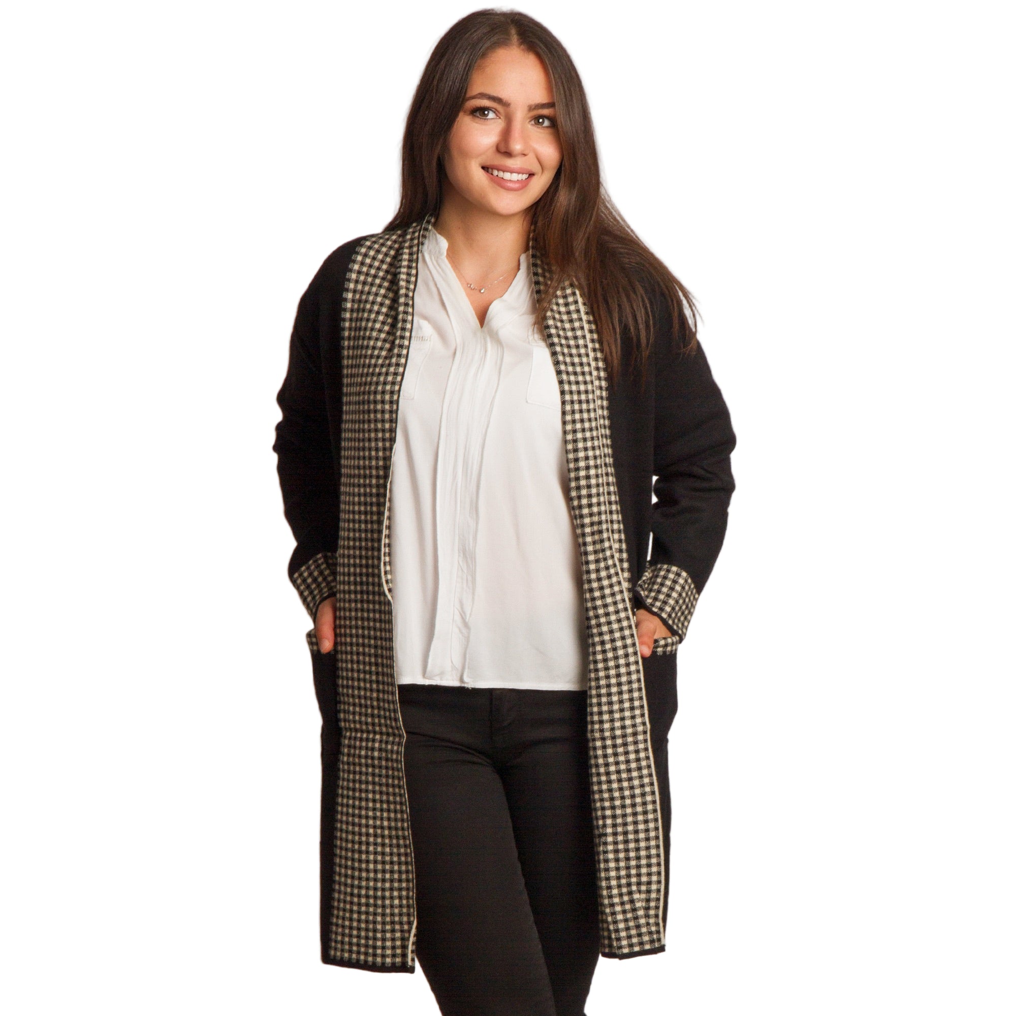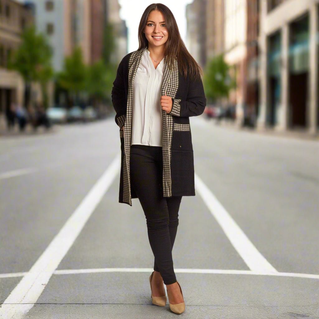 Елегантна и практична жилетка в големи размери, изработена от мека и удобна материя. Основният черен цвят е стилно допълнен с каре мотив по ръбовете, джобовете и маншетите, което придава изискан завършек. Жилетката е без закопчаване, с права кройка, осигуряваща комфорт и свобода на движение. Подходяща е както за ежедневни визии, така и за официални поводи през есенно-зимния сезон.